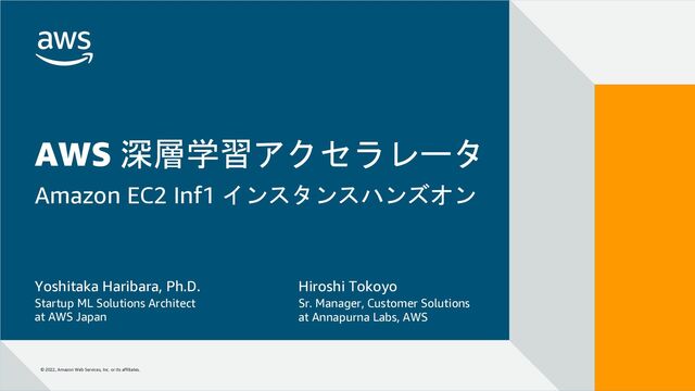 AWS では GPU はもちろん、機械学習のトレーニング・推論のための専用チップまで多彩な深層学習アクセラレータを搭載した EC2 インスタンスを提供しており、ユースケースやモデル規模に応じて最適な選択肢をご利用頂けます。特に AWS Trainium と AWS Inferentia は、機械学習のトレーニングと推論ワークロード向けに AWS が設計したカスタムチップで、それぞれ Amazon EC2 Trn1 インスタンス (プレビュー中)、Inf1 インスタンスとして提供されています。Trn1/Inf1 インスタンスはクラウド上で最も高いコストパフォーマンスを実現するため、深層学習ワークロードを運用する上で知っておいて損はありません。