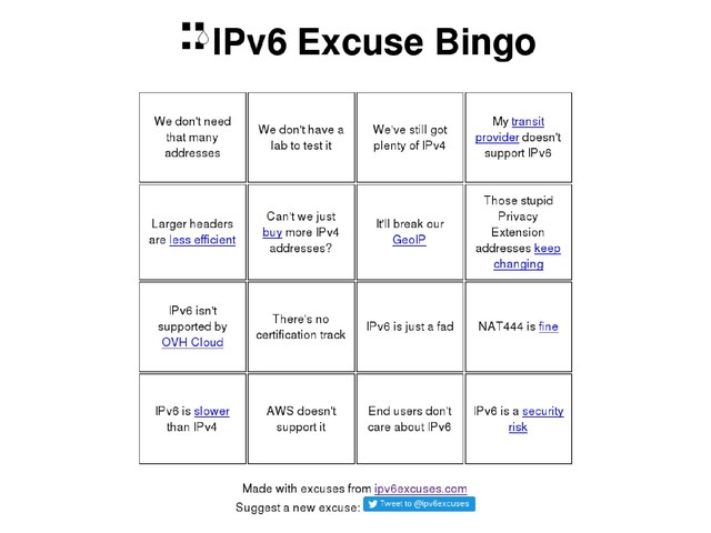 IPv6 Excused bingo created from http://ipv6bingo.com/ and http://ipv6excuses.com/. Use http://ipv6excuses.com/ to show excuse one at a time for the players to cross out the bingo cards.