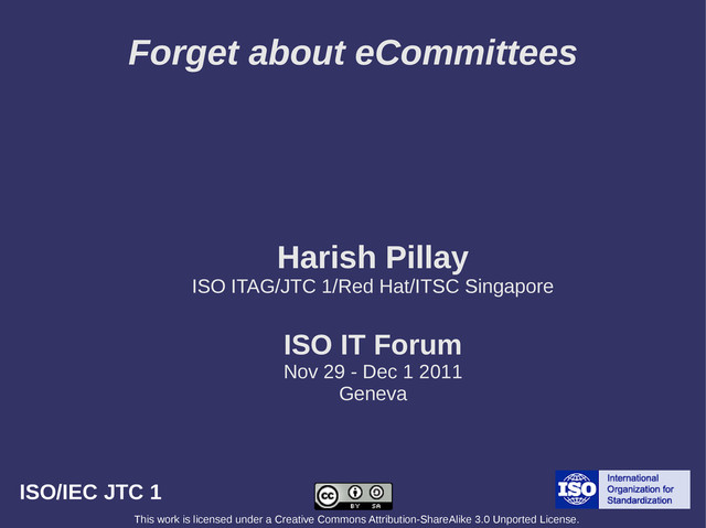 Commons Attribution-ShareAlike 3.0 Unported License. Forget about eCommittees Harish Pillay ISO ITAG/JTC 1/Red Hat/ITSC Singapore ISO IT Forum Nov 29 - Dec 1 2011 Geneva
