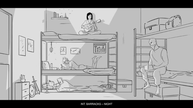 Set in the quiet night hours of a training camp, this storyboard captures a warm, humorous moment between four trainee adventurers as they wind down in their shared barracks. The scene showcases their distinct personalities: Gunther, an earnest frog folk discovering the world; DeeDee, a clever but self-doubting half-human, half-demon artificer; Natie, the confident and witty bard-druid; and Tolv, a towering Viking with a gentle heart. As they relax in their bunk beds, playful banter unfolds about romance, swooning, battle tactics, and malfunctioning robots—blending fantasy charm with slice-of-life comedy. This lighthearted interaction reveals the camaraderie growing among the group and sets the tone for a campaign full of quirky humor, warmth, and chaos.