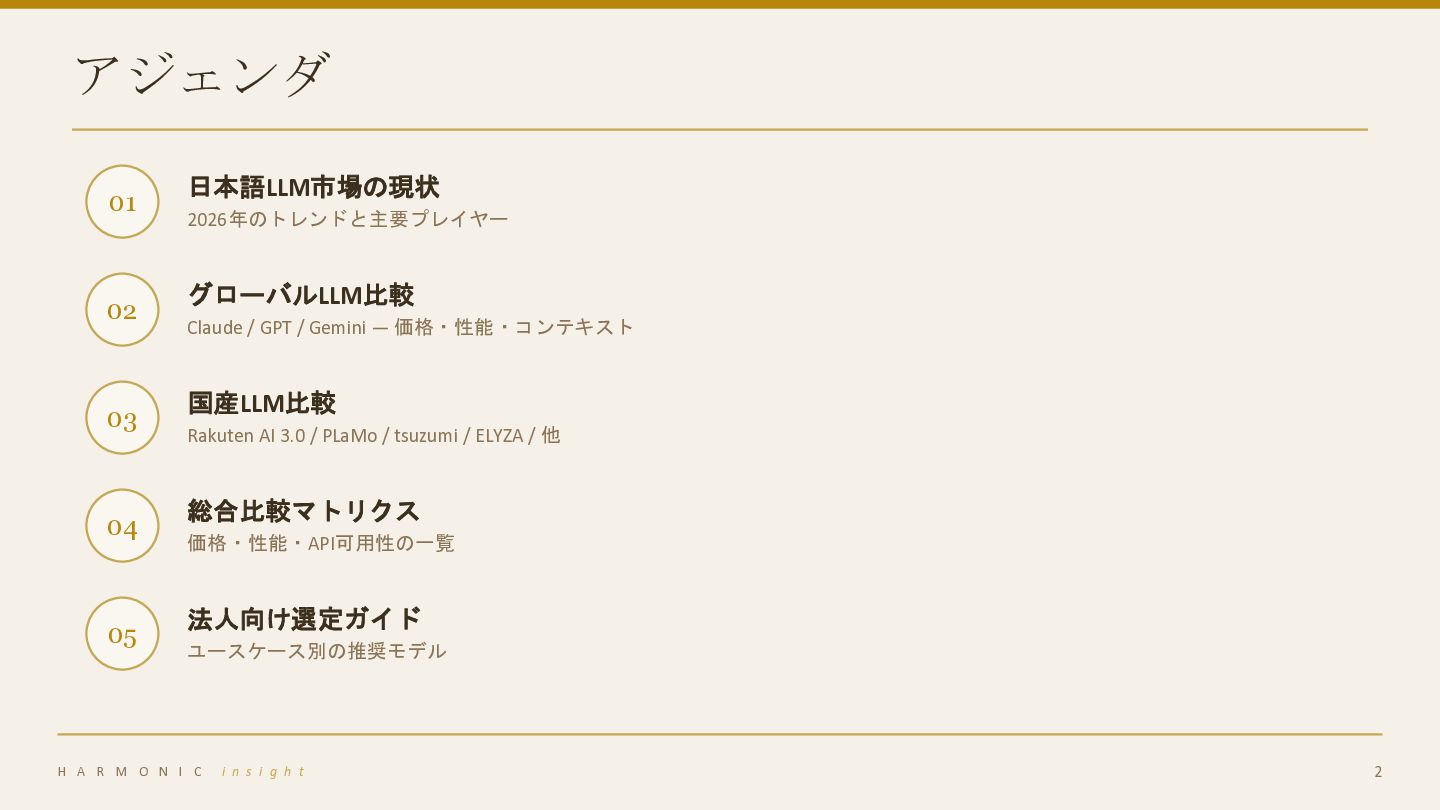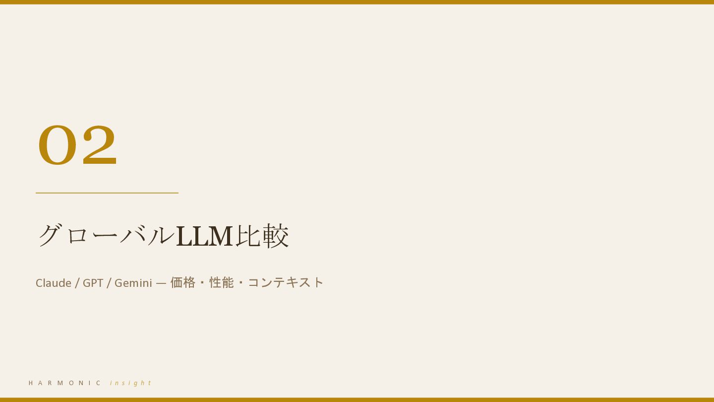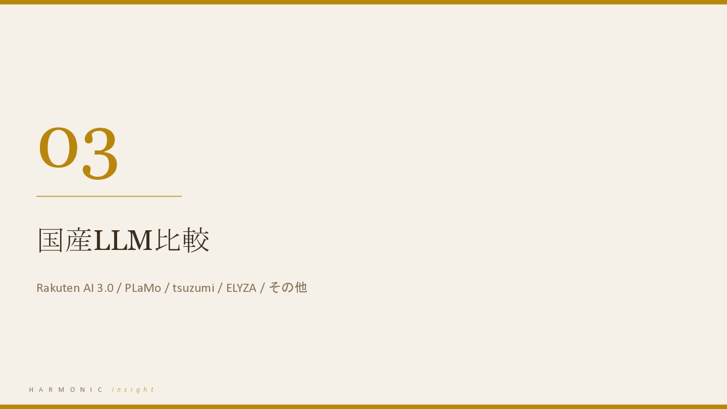 Gemini — 価格・性能・コンテキスト 03 国産LLM比較 Rakuten AI 3.0 / PLaMo / tsuzumi / ELYZA / 他 04 総合比較マトリクス 価格・性能・API可用性の一覧 05 法人向け選定ガイド ユースケース別の推奨モデル H A R M O N I C i n s i g h t 2
