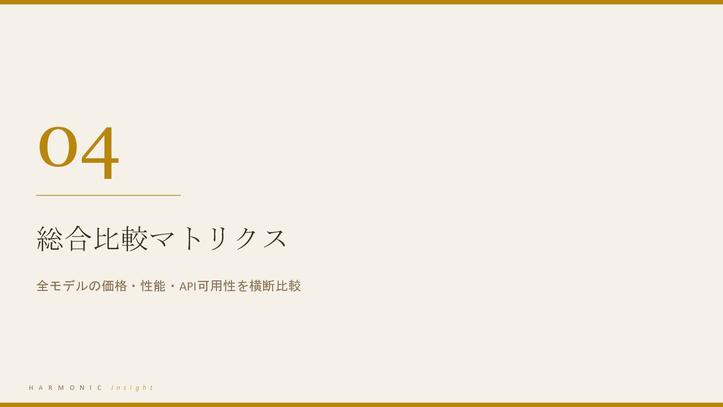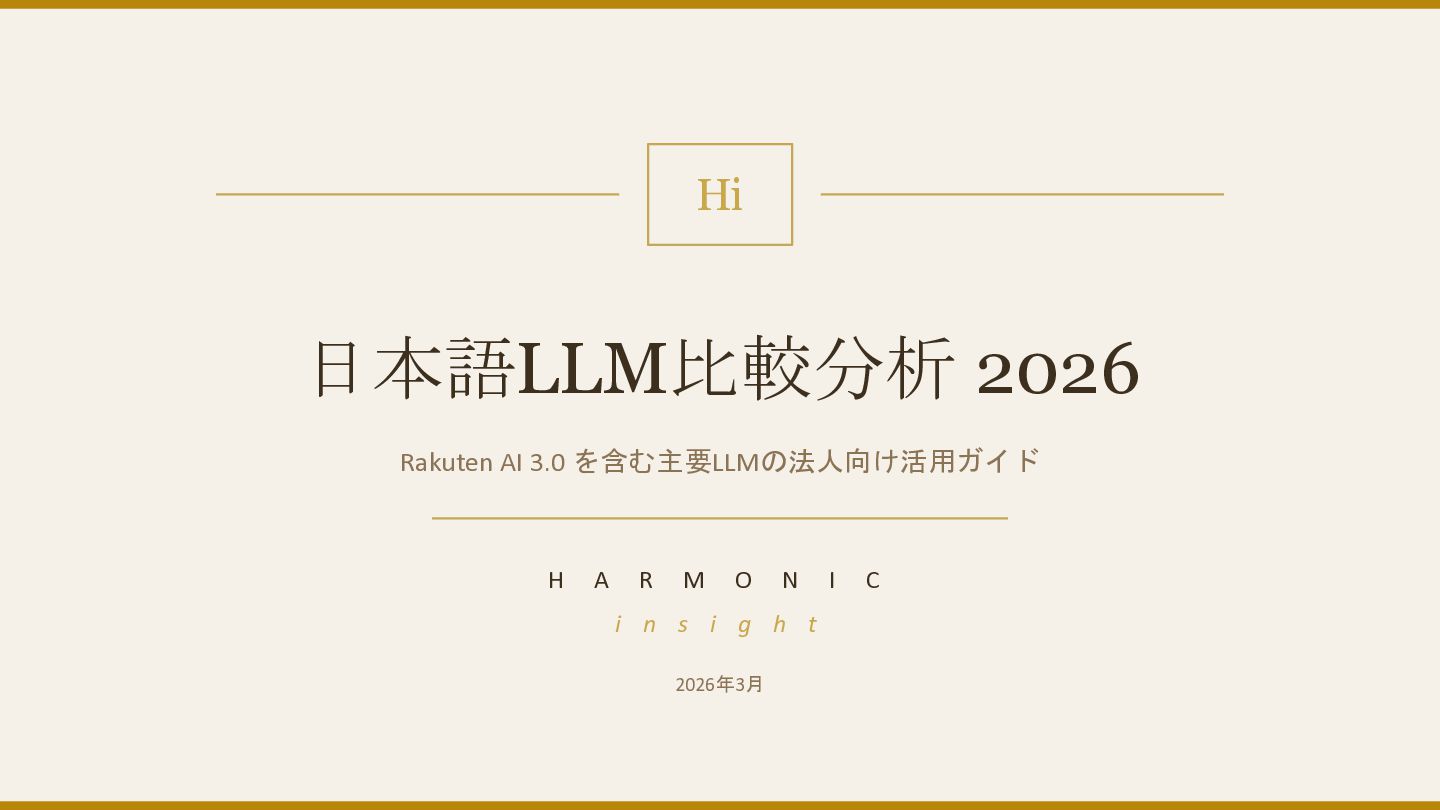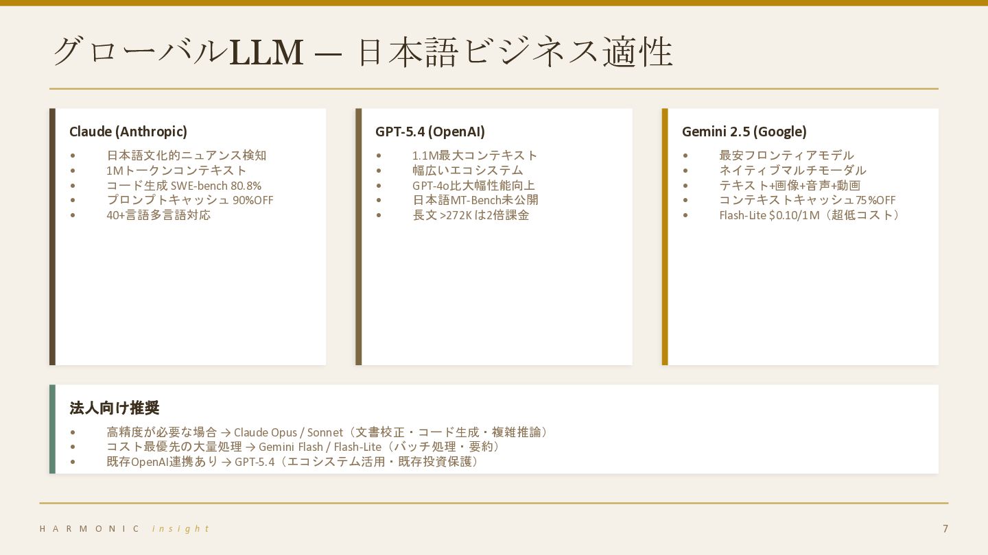 Gemini — 価格・性能・コンテキスト 03 国産LLM比較 Rakuten AI 3.0 / PLaMo / tsuzumi / ELYZA / 他 04 総合比較マトリクス 価格・性能・API可用性の一覧 05 法人向け選定ガイド ユースケース別の推奨モデル H A R M O N I C i n s i g h t 2