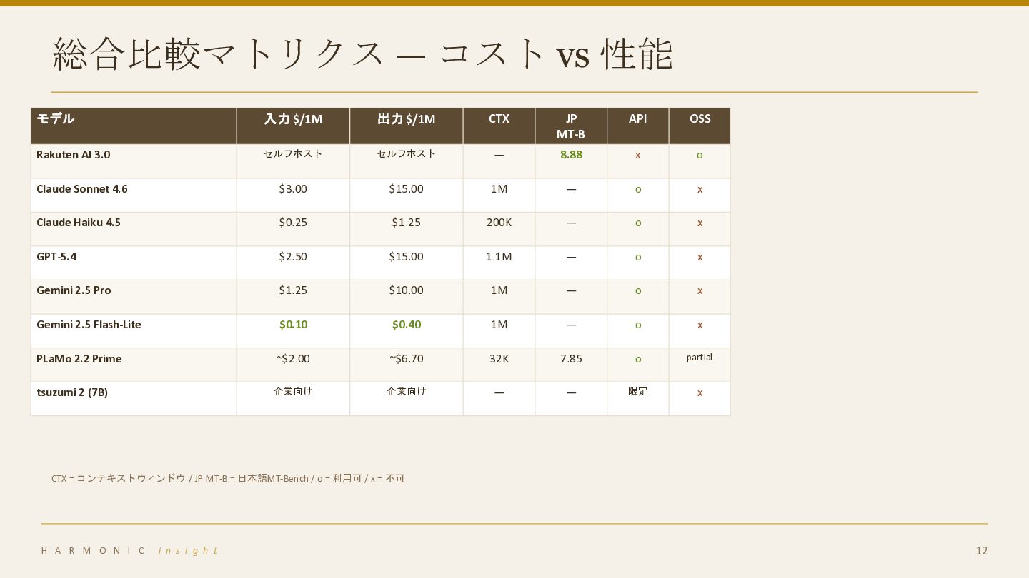 CTX JP MT-B API OSS Rakuten AI 3.0 セルフホスト セルフホスト — 8.88 x o Claude Sonnet 4.6 $3.00 $15.00 1M — o x Claude Haiku 4.5 $0.25 $1.25 200K — o x GPT-5.4 $2.50 $15.00 1.1M — o x Gemini 2.5 Pro $1.25 $10.00 1M — o x Gemini 2.5 Flash-Lite $0.10 $0.40 1M — o x PLaMo 2.2 Prime ~$2.00 ~$6.70 32K 7.85 o partial tsuzumi 2 (7B) 企業向け 企業向け — — 限定 x CTX = コンテキストウィンドウ / JP MT-B = 日本語MT-Bench / o = 利用可 / x = 不可 H A R M O N I C i n s i g h t 12