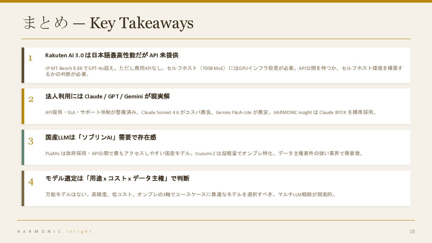Gemini 2.5 Flash-Lite $0.10/1M入力、1Mコンテキスト、超低コスト データ主権・オンプレミス必須 金融・医療・官公庁(機密データ) tsuzumi 2 / PLaMo 2.2 GPU 1台で動作、完全国産、規制準拠 日本語最高精度(セルフホスト可) 大規模GPU環境ありの研究・大企業 Rakuten AI 3.0 JP MT-Bench 8.88最高、Apache 2.0、700B MoE HARMONIC insight: Claude BYOK 標準 + ローカルLLM対応(ENT)で柔軟な選択肢を提供 H A R M O N I C i n s i g h t 14