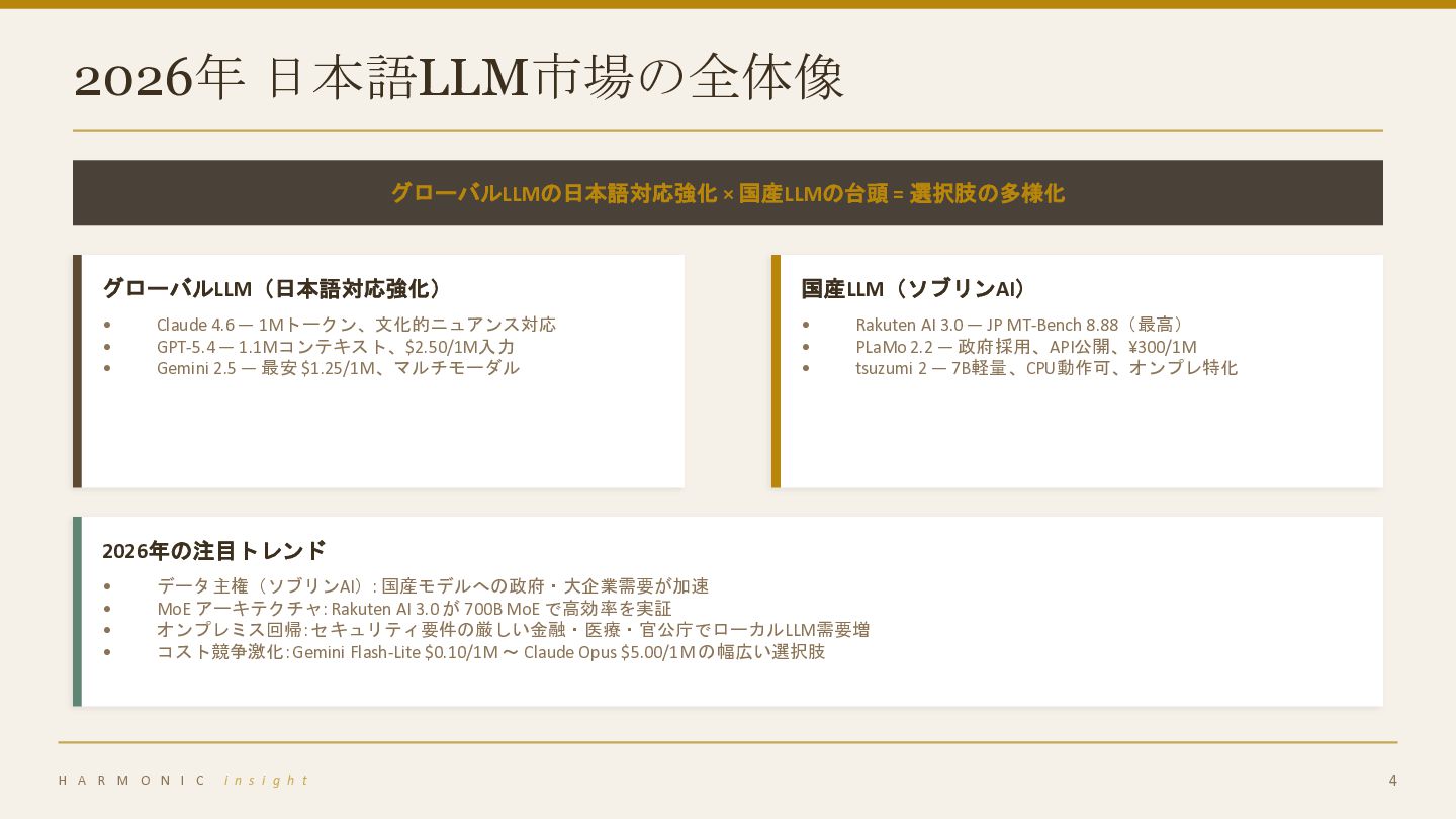4.6 — 1Mトークン、文化的ニュアンス対応 • GPT-5.4 — 1.1Mコンテキスト、$2.50/1M入力 • Gemini 2.5 — 最安 $1.25/1M、マルチモーダル 国産LLM(ソブリンAI) • Rakuten AI 3.0 — JP MT-Bench 8.88(最高) • PLaMo 2.2 — 政府採用、API公開、¥300/1M • tsuzumi 2 — 7B軽量、CPU動作可、オンプレ特化 2026年の注目トレンド • データ主権(ソブリンAI): 国産モデルへの政府・大企業需要が加速 • MoE アーキテクチャ: Rakuten AI 3.0 が 700B MoE で高効率を実証 • オンプレミス回帰: セキュリティ要件の厳しい金融・医療・官公庁でローカルLLM需要増 • コスト競争激化: Gemini Flash-Lite $0.10/1M 〜 Claude Opus $5.00/1M の幅広い選択肢 H A R M O N I C i n s i g h t 4