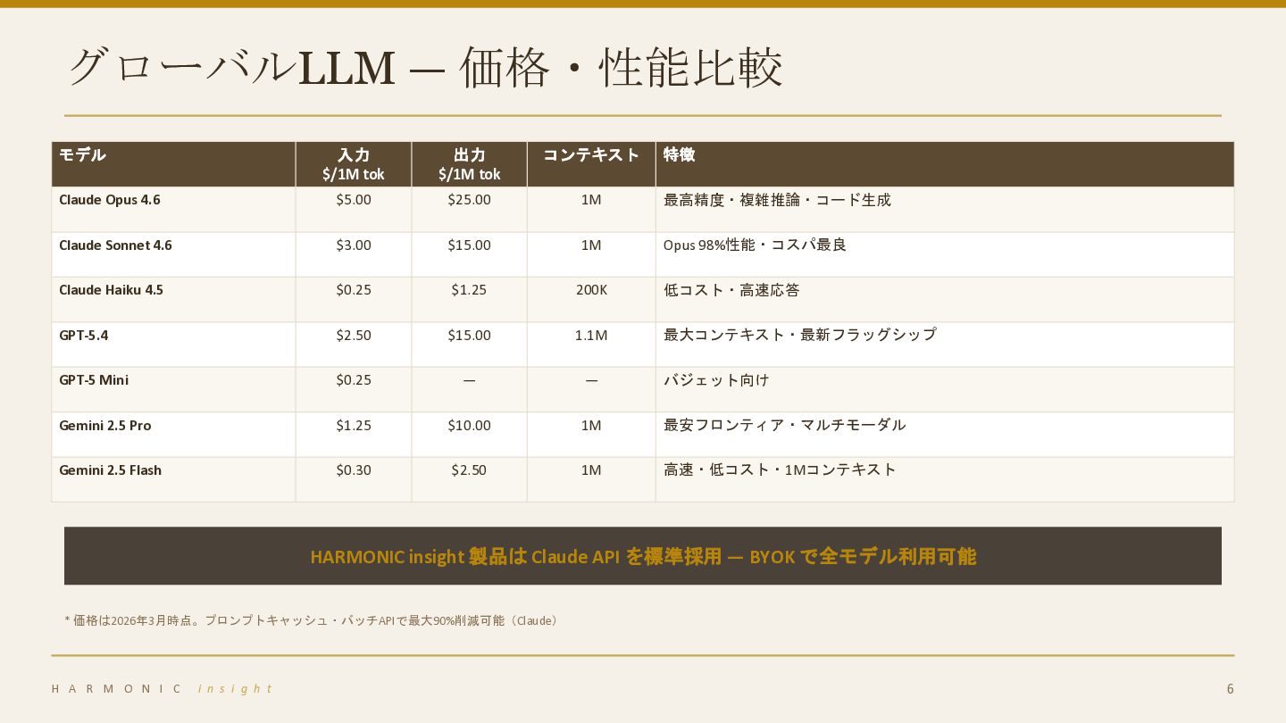 コンテキスト 特徴 Claude Opus 4.6 $5.00 $25.00 1M 最高精度・複雑推論・コード生成 Claude Sonnet 4.6 $3.00 $15.00 1M Opus 98%性能・コスパ最良 Claude Haiku 4.5 $0.25 $1.25 200K 低コスト・高速応答 GPT-5.4 $2.50 $15.00 1.1M 最大コンテキスト・最新フラッグシップ GPT-5 Mini $0.25 — — バジェット向け Gemini 2.5 Pro $1.25 $10.00 1M 最安フロンティア・マルチモーダル Gemini 2.5 Flash $0.30 $2.50 1M 高速・低コスト・1Mコンテキスト HARMONIC insight 製品は Claude API を標準採用 — BYOK で全モデル利用可能 * 価格は2026年3月時点。プロンプトキャッシュ・バッチAPIで最大90%削減可能(Claude) H A R M O N I C i n s i g h t 6