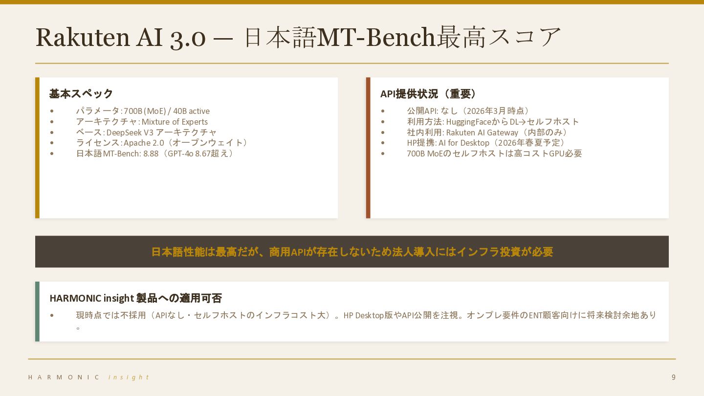 / 40B active • アーキテクチャ: Mixture of Experts • ベース: DeepSeek V3 アーキテクチャ • ライセンス: Apache 2.0(オープンウェイト) • 日本語MT-Bench: 8.88(GPT-4o 8.67超え) API提供状況(重要) • 公開API: なし(2026年3月時点) • 利用方法: HuggingFaceからDL→セルフホスト • 社内利用: Rakuten AI Gateway(内部のみ) • HP提携: AI for Desktop(2026年春夏予定) • 700B MoEのセルフホストは高コストGPU必要 日本語性能は最高だが、商用APIが存在しないため法人導入にはインフラ投資が必要 HARMONIC insight 製品への適用可否 • 現時点では不採用(APIなし・セルフホストのインフラコスト大)。HP Desktop版やAPI公開を注視。オンプレ要件のENT顧客向けに将来検討余地あり 。 H A R M O N I C i n s i g h t 9