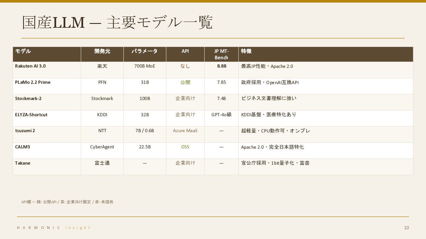 特徴 Rakuten AI 3.0 楽天 700B MoE なし 8.88 最高JP性能・Apache 2.0 PLaMo 2.2 Prime PFN 31B 公開 7.85 政府採用・OpenAI互換API Stockmark-2 Stockmark 100B 企業向け 7.48 ビジネス文書理解に強い ELYZA-Shortcut KDDI 32B 企業向け GPT-4o級 KDDI基盤・医療特化あり tsuzumi 2 NTT 7B / 0.6B Azure MaaS — 超軽量・CPU動作可・オンプレ CALM3 CyberAgent 22.5B OSS — Apache 2.0・完全日本語特化 Takane 富士通 — 企業向け — 官公庁採用・1bit量子化・富岳 API欄 — 緑: 公開API / 茶: 企業向け限定 / 赤: 未提供 H A R M O N I C i n s i g h t 10