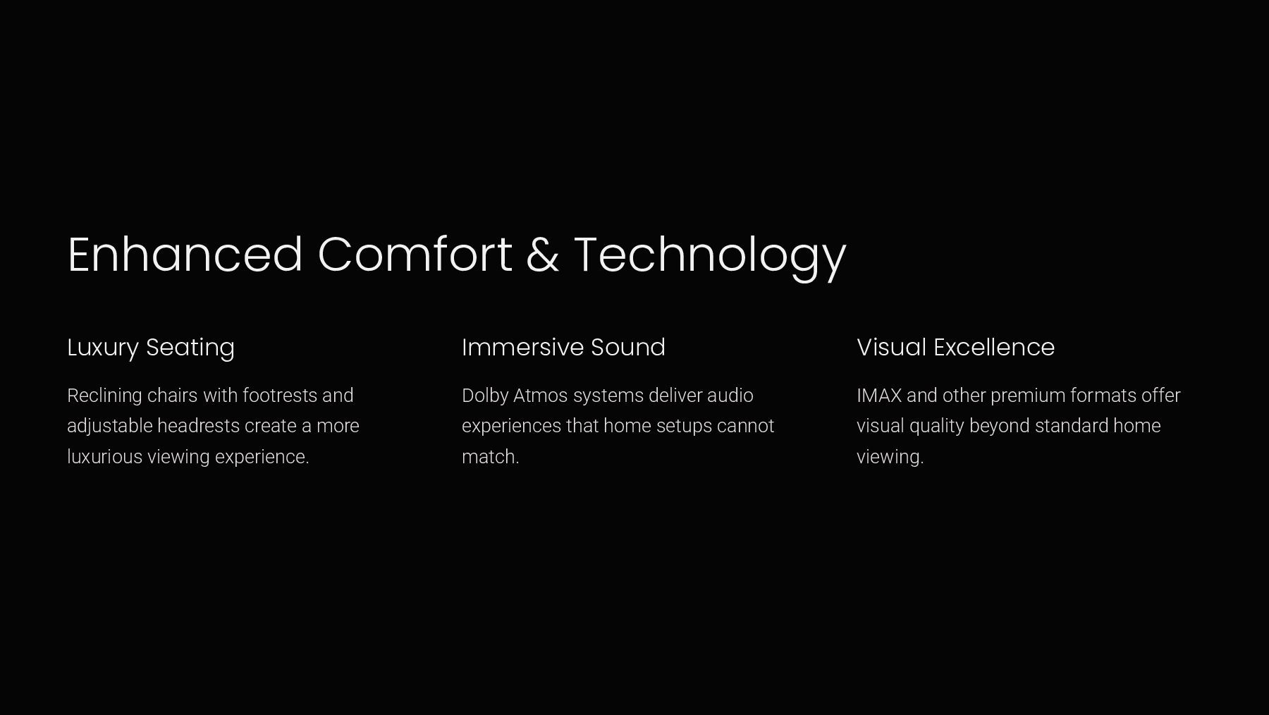 and adjustable headrests create a more luxurious viewing experience. Immersive Sound Dolby Atmos systems deliver audio experiences that home setups cannot match. Visual Excellence IMAX and other premium formats offer visual quality beyond standard home viewing.