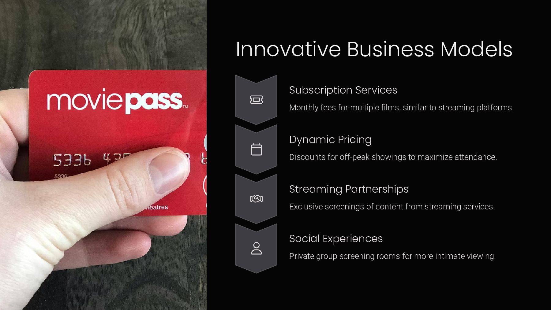 similar to streaming platforms. Dynamic Pricing Discounts for off-peak showings to maximize attendance. Streaming Partnerships Exclusive screenings of content from streaming services. Social Experiences Private group screening rooms for more intimate viewing.