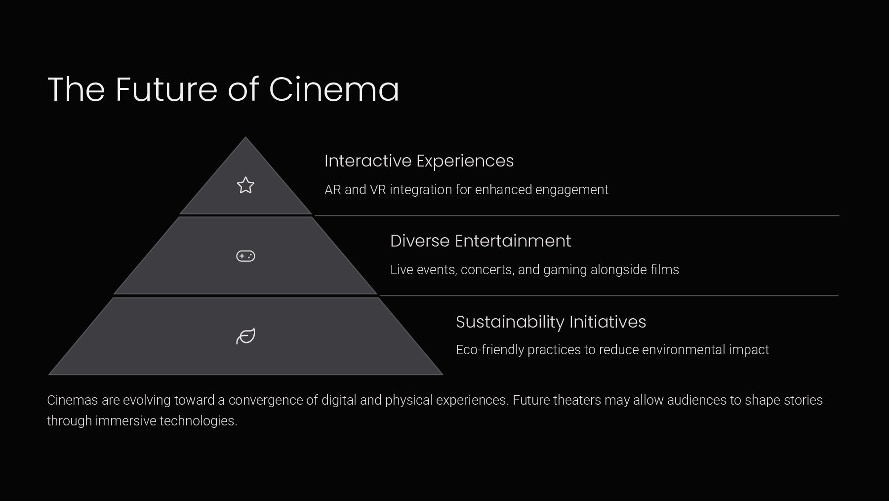 for enhanced engagement Diverse Entertainment Live events, concerts, and gaming alongside films Sustainability Initiatives Eco-friendly practices to reduce environmental impact Cinemas are evolving toward a convergence of digital and physical experiences. Future theaters may allow audiences to shape stories through immersive technologies.