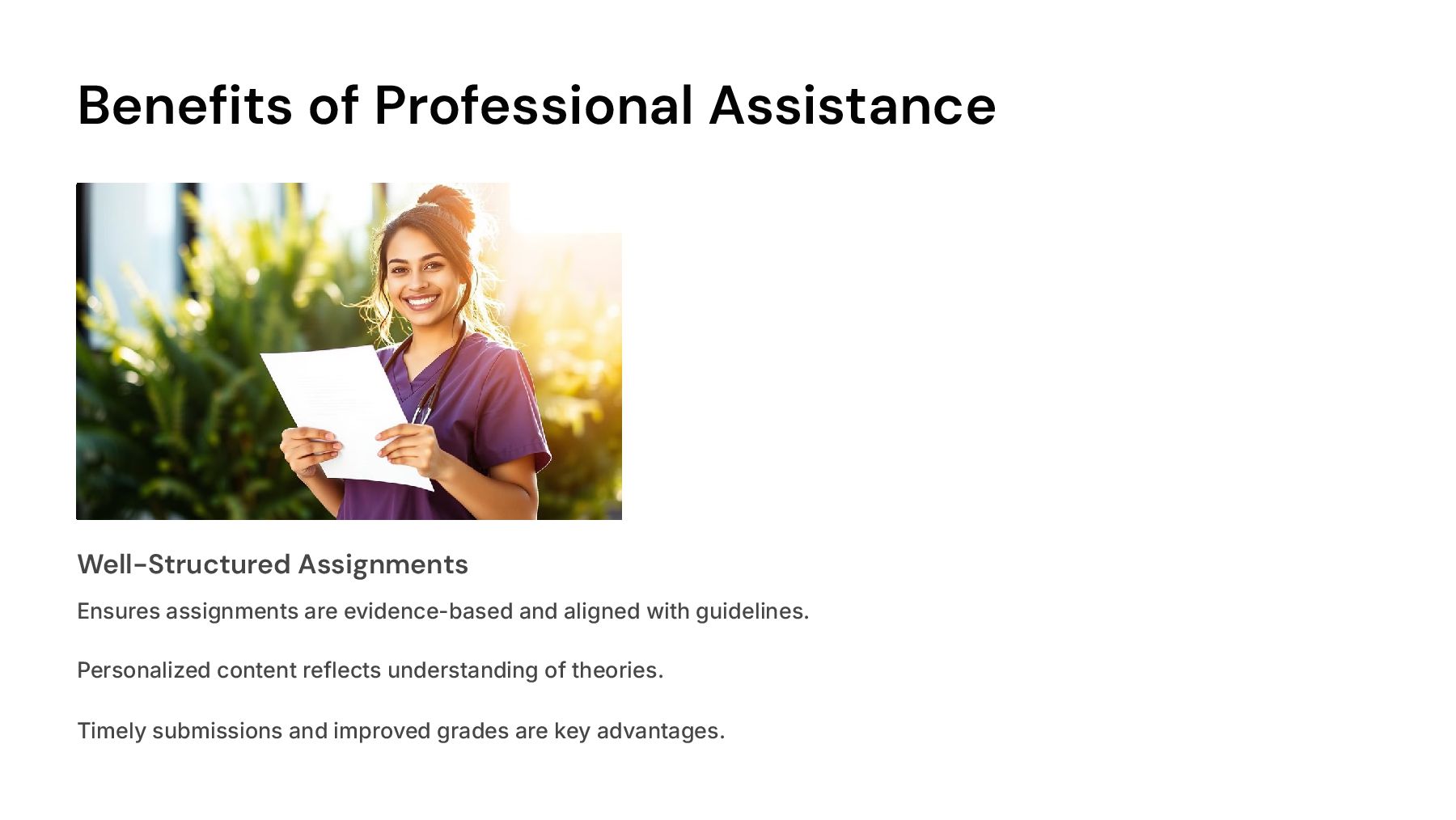 Benefits of Professional Assistance Well-Structured Assignments Ensures assignments are evidence-based