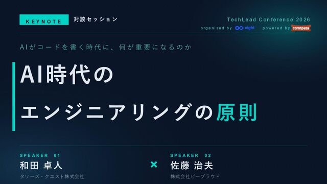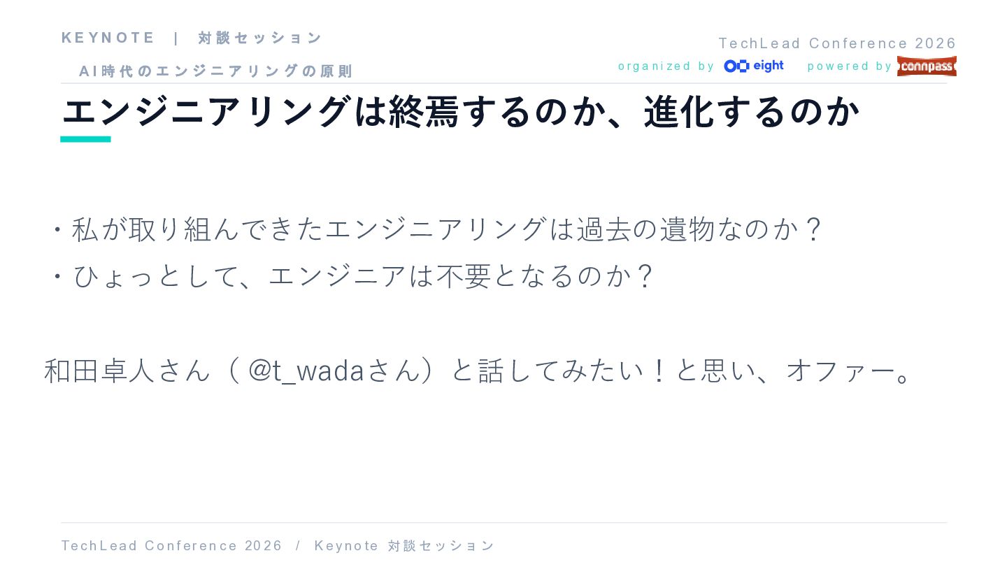fe r e n c e 2 0 2 6 エンジニアリングは終焉するのか、進化するのか T e c h L ea d C o nf er e n c e 20 2 6 / K e y no t e 対 談 セ ッ シ ョ ン o r g a n i z e d b y p o w e r e d b y ・私が取り組んできたエンジニアリングは過去の遺物なのか? ・ひょっとして、エンジニアは不要となるのか? 和田卓人さん( @t_wadaさん)と話してみたい!と思い、オファー。 K E Y N O T E | 対 談 セ ッ シ ョ ン A I 時 代 の エ ン ジ ニ ア リ ン グ の 原 則