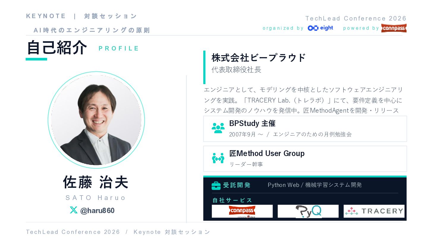 セ ッ シ ョ ン A I 時 代 の エ ン ジ ニ ア リ ン グ の 原 則 T e ch L e a d C o n fe r e n c e 2 0 2 6 自己紹介 P R O F I L E 佐藤 治夫 S A T O H a r u o @haru860 株式会社ビープラウド 代表取締役社長 BPStudy 主催 2007年9月 〜 / エンジニアのための月例勉強会 匠Method User Group リーダー幹事 受 託開 発 Python Web / 機械学習システム開発 自 社 サ ー ビ ス T e c h L ea d C o nf er e n c e 20 2 6 / K e y no t e 対 談 セ ッ シ ョ ン o r g a n i z e d b y p o w e r e d b y エンジニアとして、モデリングを中核としたソフトウェアエンジニアリ ングを実践。「TRACERY Lab.(トレラボ)」にて、要件定義を中心に システム開発のノウハウを発信中。匠MethodAgentを開発・リリース