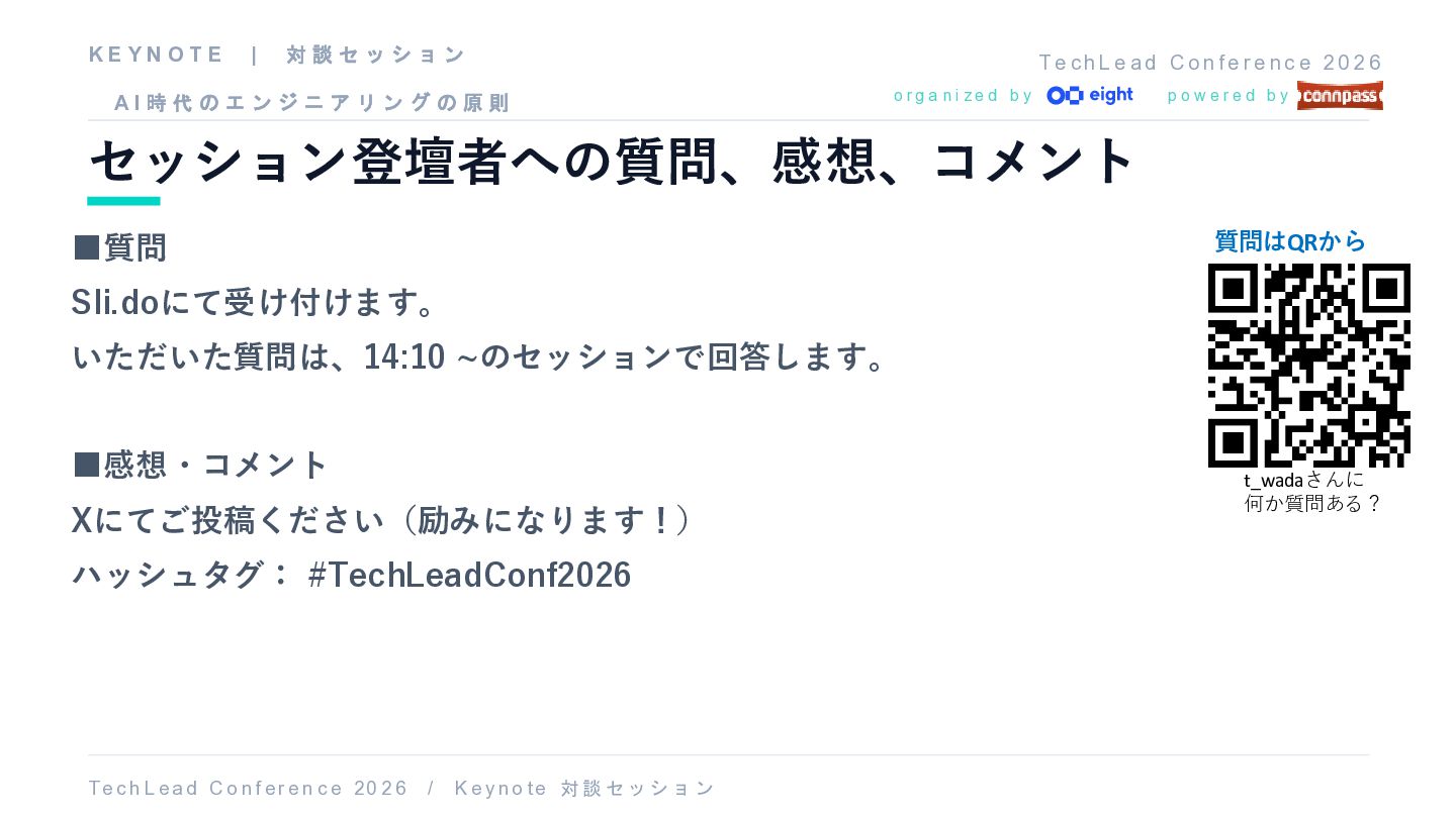 fe r e n c e 2 0 2 6 セッション登壇者への質問、感想、コメント T e c h L ea d C o nf er e n c e 20 2 6 / K e y no t e 対 談 セ ッ シ ョ ン o r g a n i z e d b y p o w e r e d b y ▪質問 Sli.doにて受け付けます。 いただいた質問は、14:10 ~のセッションで回答します。 ▪感想・コメント Xにてご投稿ください(励みになります!) ハッシュタグ: #TechLeadConf2026 K E Y N O T E | 対 談 セ ッ シ ョ ン A I 時 代 の エ ン ジ ニ ア リ ン グ の 原 則 質問はQRから t_wadaさんに 何か質問ある?