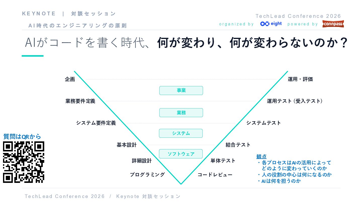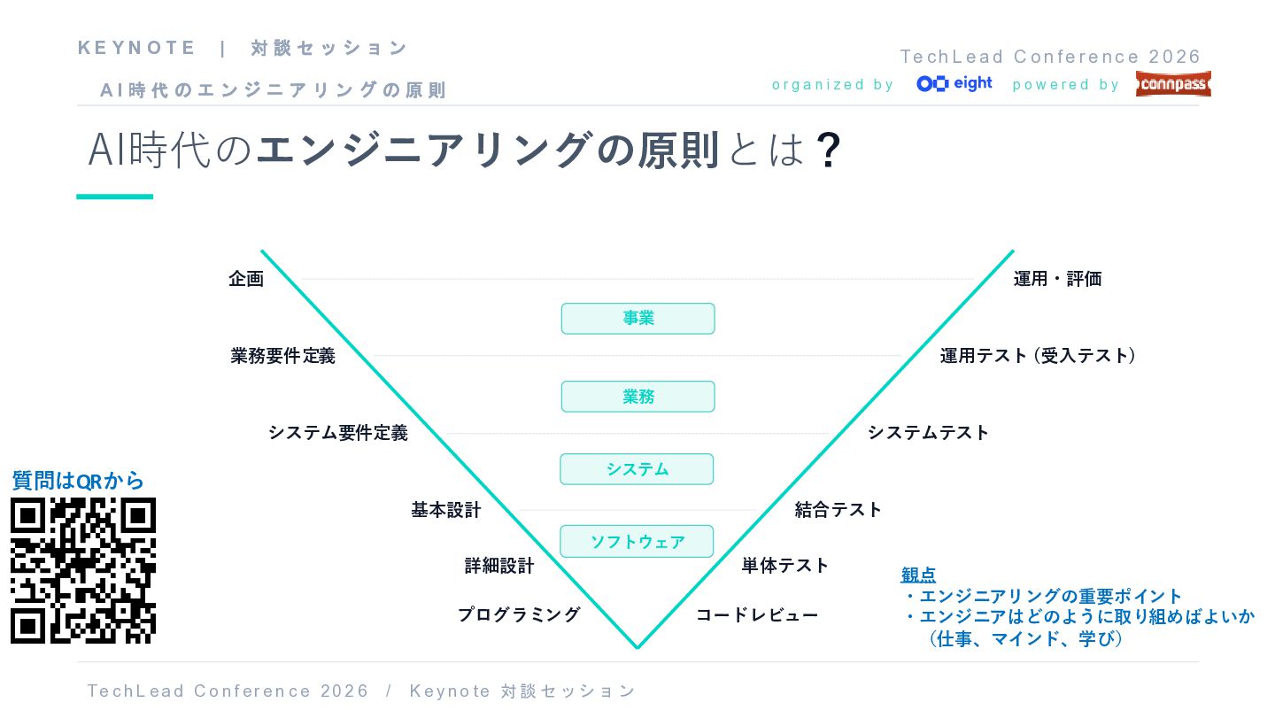 f e r e n c e 2 0 2 6 o r g a n i z e d b y p o w e r e d b y AI時代のエンジニアリングの原則とは? 事業 企画 運用・評価 業務 業務要件定義 運用テスト (受入テスト) システム システム要件定義 システムテスト ソフトウェア 基本設計 結合テスト 詳細設計 単体テスト プログラミング コードレビュー T e c h L ea d C o nf er e n c e 20 2 6 / K e y no t e 対談 セッショ ン 観点 ・エンジニアリングの重要ポイント ・エンジニアはどのように取り組めばよいか (仕事、マインド、学び) 質問はQRから K E Y N O T E | 対 談 セ ッ シ ョ ン A I 時 代 の エ ン ジ ニ ア リ ン グ の 原 則