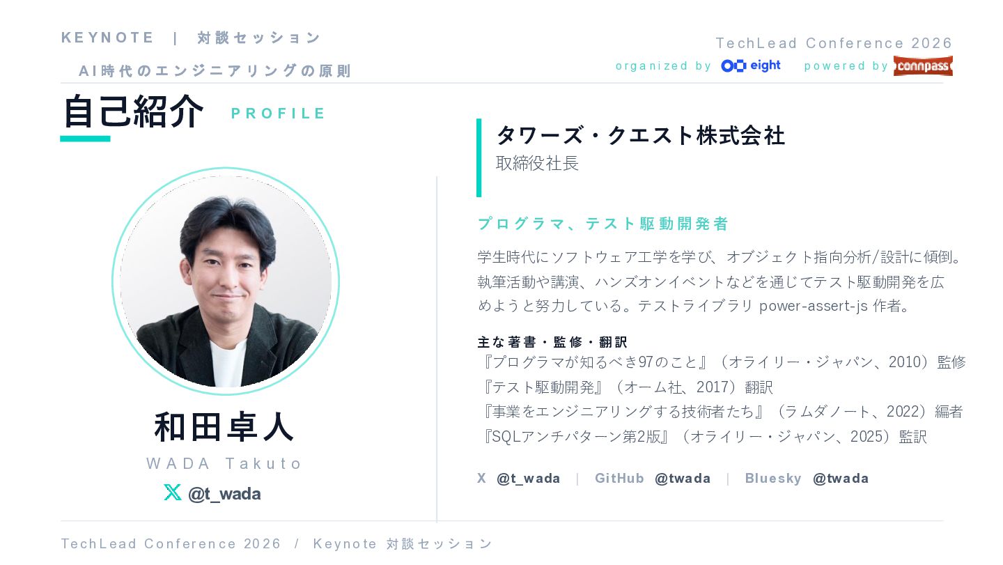 fe r e n c e 2 0 2 6 自己紹介 P R O F I L E 和田卓人 W A D A T a k u t o @t_wada プ ロ グ ラ マ 、 テ ス ト 駆 動 開 発 者 学生時代にソフトウェア工学を学び、オブジェクト指向分析/設計に傾倒。 執筆活動や講演、ハンズオンイベントなどを通じてテスト駆動開発を広 めようと努力している。テストライブラリ power-assert-js 作者。 主な 著書・監 修・翻訳 『プログラマが知るべき97のこと』(オライリー・ジャパン、2010)監修 『テスト駆動開発』(オーム社、2017)翻訳 『事業をエンジニアリングする技術者たち』(ラムダノート、2022)編者 『SQLアンチパターン第2版』(オライリー・ジャパン、2025)監訳 X @t_wada | GitHub @twada | Bluesky @twada T e c h L ea d C o nf er e n c e 20 2 6 / K e y no t e 対 談 セ ッ シ ョ ン o r g a n i z e d b y p o w e r e d b y K E Y N O T E | 対 談 セ ッ シ ョ ン A I 時 代 の エ ン ジ ニ ア リ ン グ の 原 則 タワーズ・クエスト株式会社 取締役社長