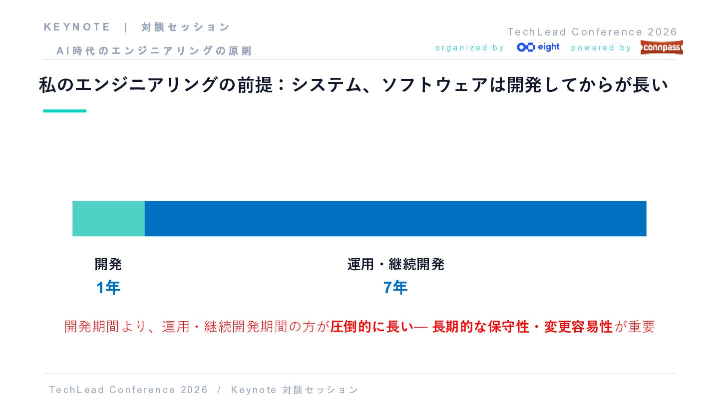 f e r e n c e 2 0 2 6 o r g a n i z e d b y p o w e r e d b y 私のエンジニアリングの前提:システム、ソフトウェアは開発してからが長い 開発 1年 運用・継続開発 7年 開発期間より、運用・継続開発期間の方が圧倒的に長い— 長期的な保守性・変更容易性が重要 T e c h L ea d C o nf er e n c e 20 2 6 / K e y no t e 対談 セッショ ン K E Y N O T E | 対 談 セ ッ シ ョ ン A I 時 代 の エ ン ジ ニ ア リ ン グ の 原 則