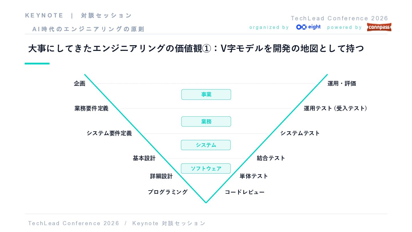 f e r e n c e 2 0 2 6 o r g a n i z e d b y p o w e r e d b y 大事にしてきたエンジニアリングの価値観①:V字モデルを開発の地図として持つ 事業 企画 運用・評価 業務 業務要件定義 運用テスト (受入テスト) システム システム要件定義 システムテスト ソフトウェア 基本設計 結合テスト 詳細設計 単体テスト プログラミング コードレビュー T e c h L ea d C o nf er e n c e 20 2 6 / K e y no t e 対談 セッショ ン K E Y N O T E | 対 談 セ ッ シ ョ ン A I 時 代 の エ ン ジ ニ ア リ ン グ の 原 則
