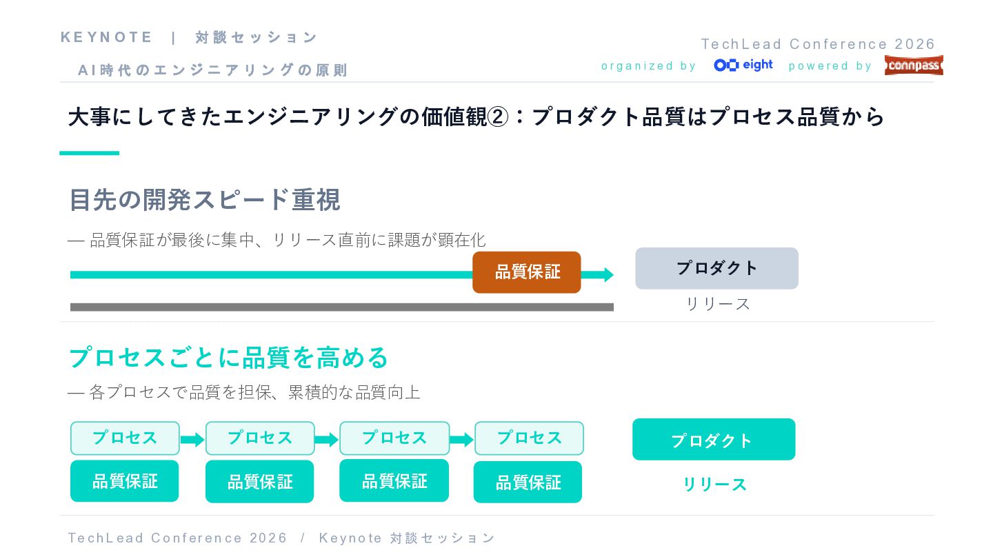 f e r e n c e 2 0 2 6 o r g a n i z e d b y p o w e r e d b y 大事にしてきたエンジニアリングの価値観②:プロダクト品質はプロセス品質から 目先の開発スピード重視 — 品質保証が最後に集中、リリース直前に課題が顕在化 プロダクト リリース プロセスごとに品質を高める — 各プロセスで品質を担保、累積的な品質向上 プロセス プロセス プロセス プロセス 品質保証 プロダクト リリース T e c h L ea d C o nf er e n c e 20 2 6 / K e y no t e 対談 セッショ ン 品質保証 品質保証 品質保証 K E Y N O T E | 対 談 セ ッ シ ョ ン A I 時 代 の エ ン ジ ニ ア リ ン グ の 原 則 品質保証