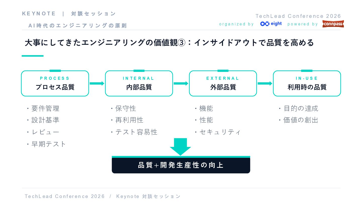 f e r e n c e 2 0 2 6 o r g a n i z e d b y p o w e r e d b y 大事にしてきたエンジニアリングの価値観③:インサイドアウトで品質を高める P R O C E S S プロセス品質 ・要件管理 ・設計基準 ・レビュー ・早期テスト I N T E R N A L 内部品質 ・保守性 ・再利用性 ・テスト容易性 E X T E R N A L 外部品質 ・機能 ・性能 ・セキュリティ I N - U S E 利用時の品質 ・目的の達成 ・価値の創出 品 質 + 開 発 生 産 性 の 向 上 T e c h L ea d C o nf er e n c e 20 2 6 / K e y no t e 対談 セッショ ン K E Y N O T E | 対 談 セ ッ シ ョ ン A I 時 代 の エ ン ジ ニ ア リ ン グ の 原 則