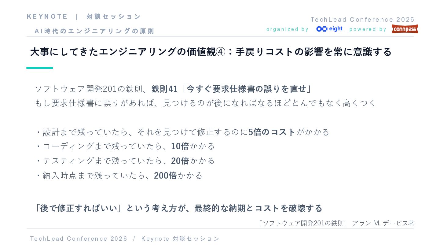 f e r e n c e 2 0 2 6 o r g a n i z e d b y p o w e r e d b y 大事にしてきたエンジニアリングの価値観④:手戻りコストの影響を常に意識する T e c h L ea d C o nf er e n c e 20 2 6 / K e y no t e 対談 セッショ ン K E Y N O T E | 対 談 セ ッ シ ョ ン A I 時 代 の エ ン ジ ニ ア リ ン グ の 原 則 ソフトウェア開発201の鉄則、鉄則41「今すぐ要求仕様書の誤りを直せ」 もし要求仕様書に誤りがあれば、見つけるのが後になればなるほどとんでもなく高くつく ・設計まで残っていたら、それを見つけて修正するのに5倍のコストがかかる ・コーディングまで残っていたら、10倍かかる ・テスティングまで残っていたら、20倍かかる ・納入時点まで残っていたら、200倍かかる 「ソフトウェア開発201の鉄則」 アラン M. デービス著 「後で修正すればいい」という考え方が、最終的な納期とコストを破壊する