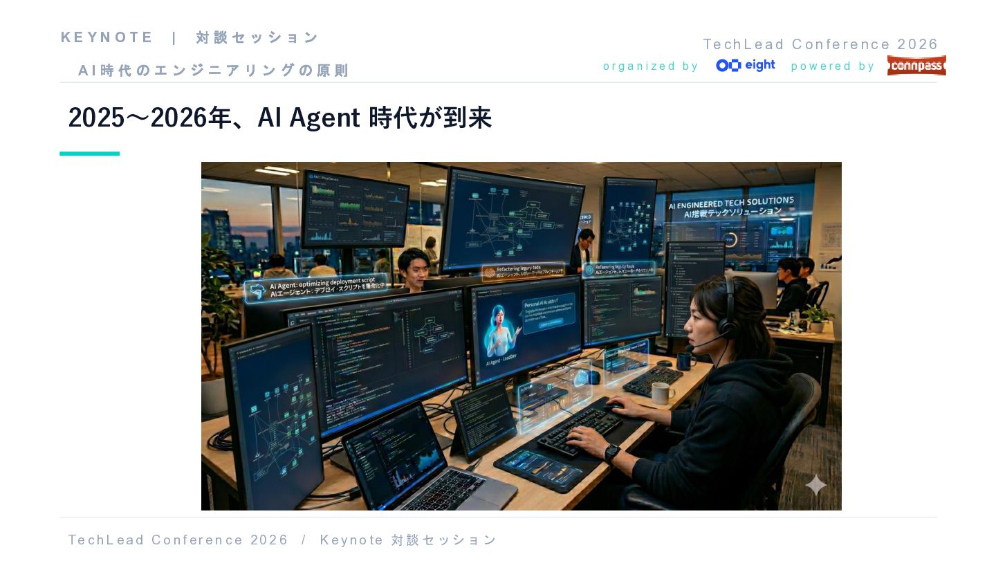 f e r e n c e 2 0 2 6 o r g a n i z e d b y p o w e r e d b y 2025〜2026年、AI Agent 時代が到来 T e c h L ea d C o nf er e n c e 20 2 6 / K e y no t e 対談 セッショ ン K E Y N O T E | 対 談 セ ッ シ ョ ン A I 時 代 の エ ン ジ ニ ア リ ン グ の 原 則
