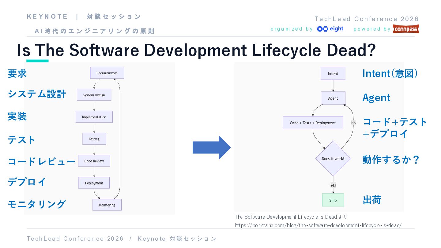 fe r e n c e 2 0 2 6 Is The Software Development Lifecycle Dead? T e c h L ea d C o nf er e n c e 20 2 6 / K e y no t e 対 談 セ ッ シ ョ ン o r g a n i z e d b y p o w e r e d b y The Software Development Lifecycle Is Dead より https://boristane.com/blog/the-software-development-lifecycle-is-dead/ システム設計 要求 実装 テスト コードレビュー デプロイ モニタリング Intent(意図) Agent コード+テスト +デプロイ 動作するか? 出荷 K E Y N O T E | 対 談 セ ッ シ ョ ン A I 時 代 の エ ン ジ ニ ア リ ン グ の 原 則