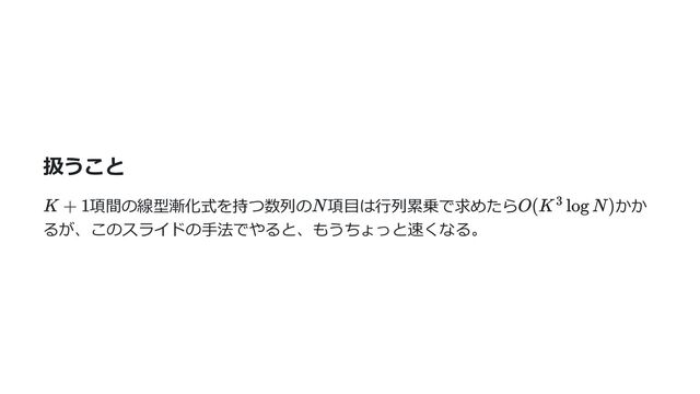 K+1項間の線型漸化式を持つ数列のN項目は行列累乗を使うと O(K^3 log N)の計算量で求めることができるということはよく知られています。しかし、このスライドで紹介するFiducciaのアルゴリズムを使うと、(FFTができたりする良い条件のもとで) O(K log K log N)で計算できます。 (FFTができないなどの理由で愚直な筆算をする場合はO(K^2 log N)になる)