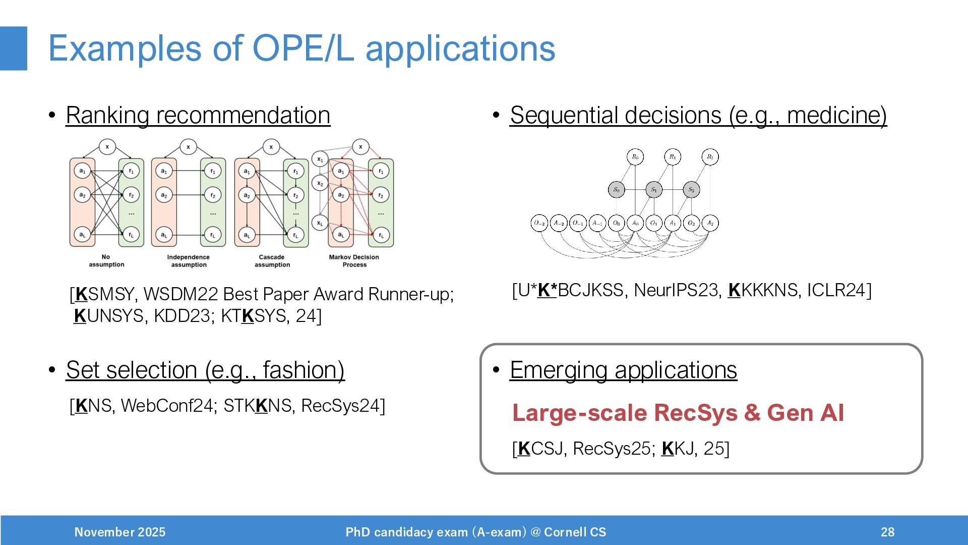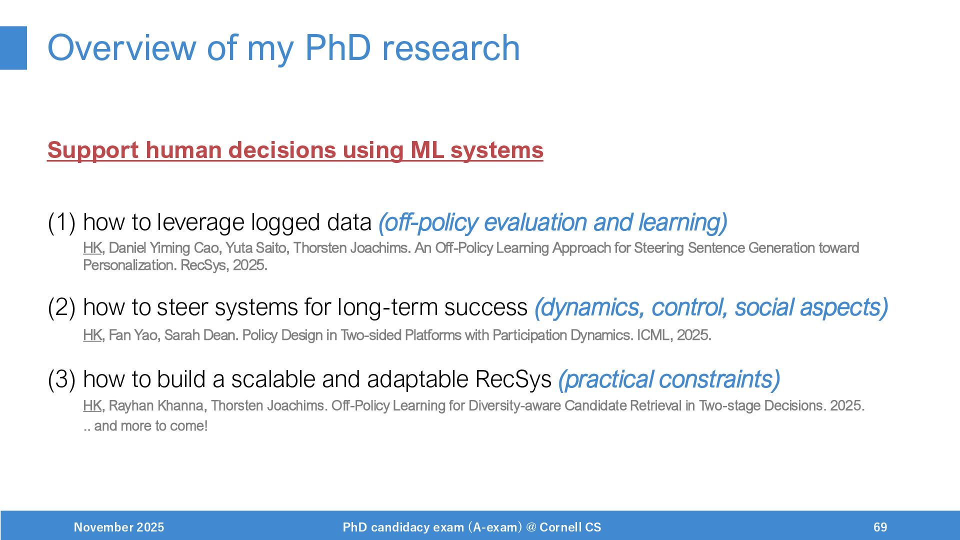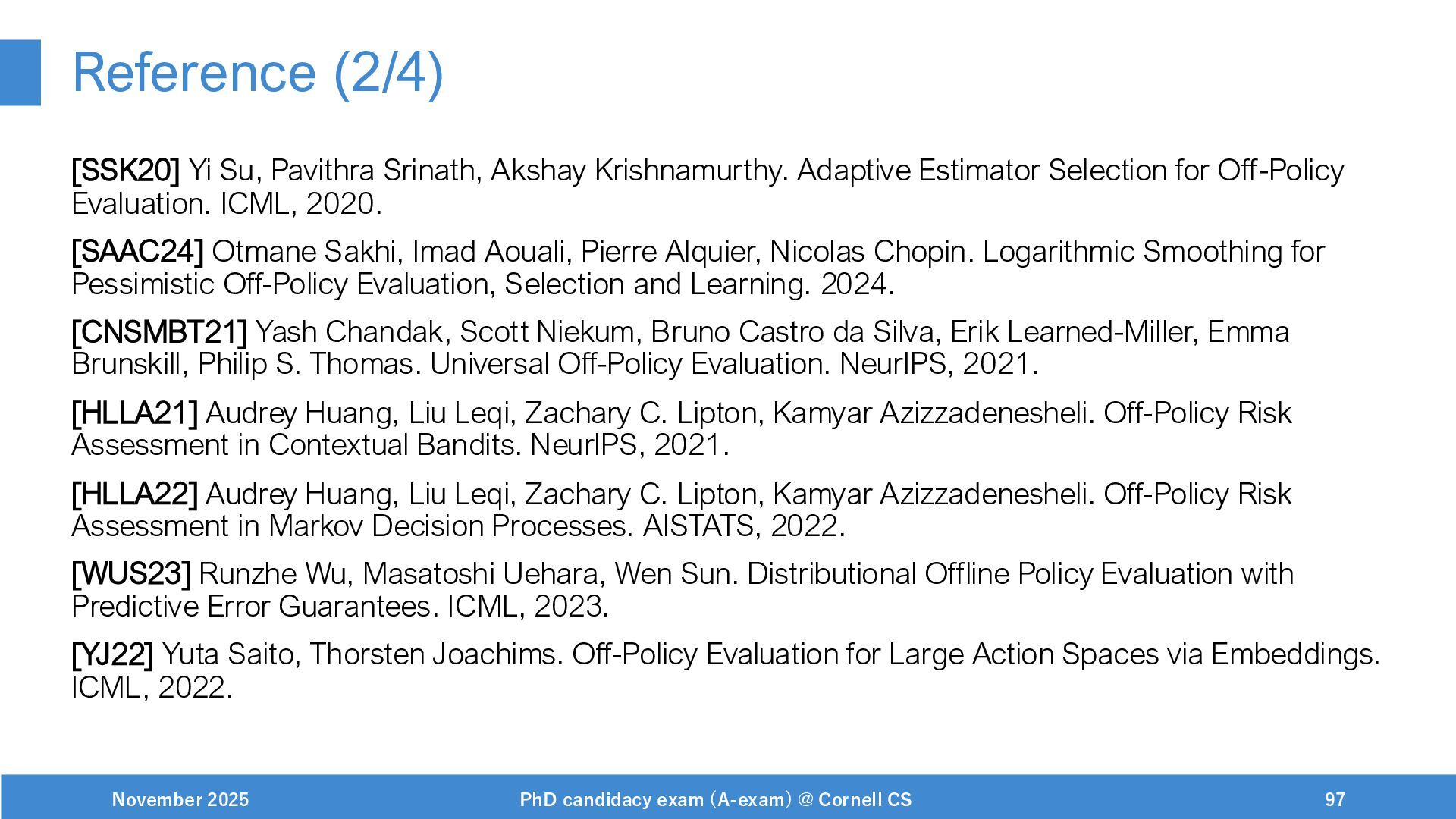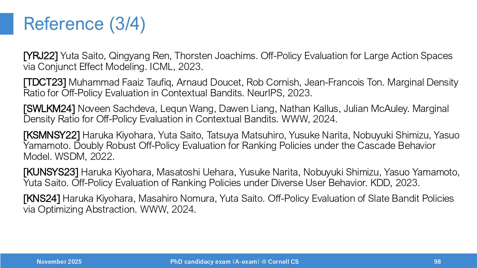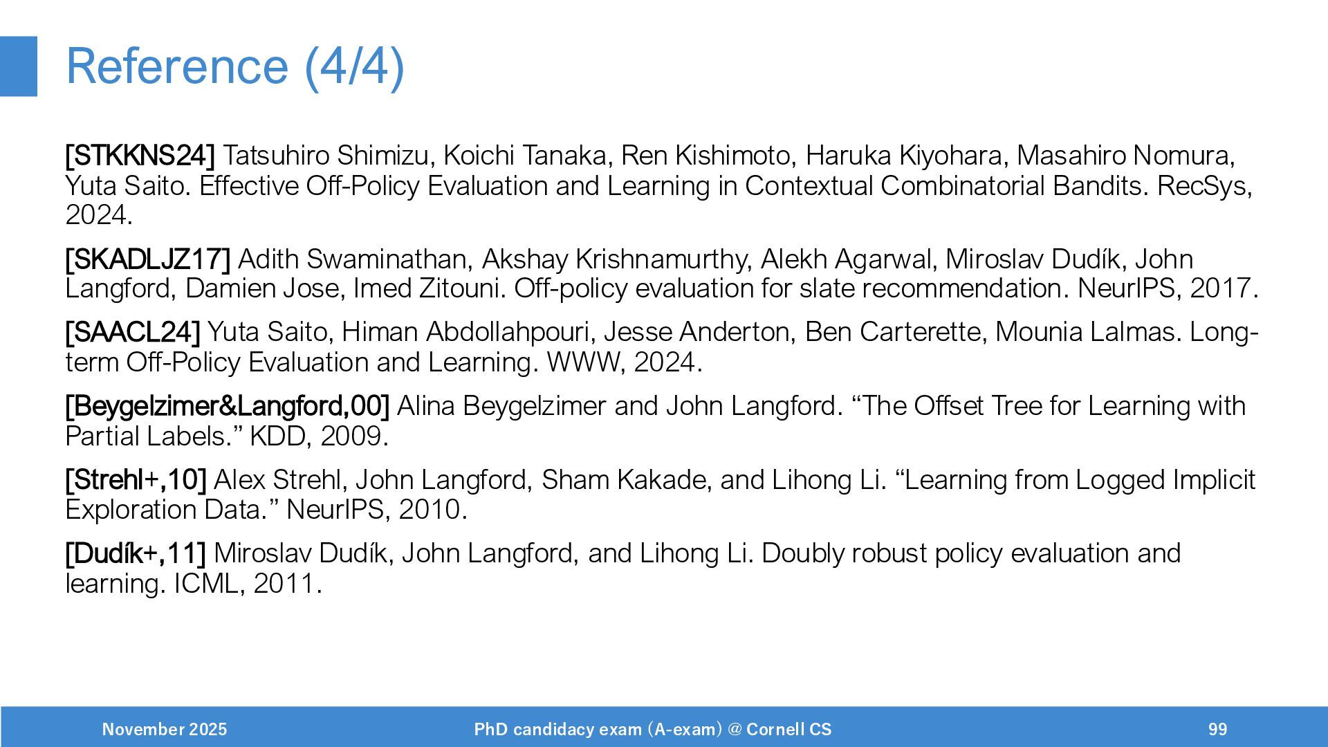 NeurIPS, 1999. [Swaminathan&Joachims,16] Adith Swaminathan and Thorsten Joachims. Batch learning from logged bandit feedback through counterfactual risk minimization. JMLR, 2016. [Dudík+,11] Miroslav Dudík, John Langford, and Lihong Li. Doubly robust policy evaluation and learning. ICML, 2011. [Saito+,24] Yuta Saito, Jihan Yao, and Thorsten Joachims. Potec: Off-policy learning for large action spaces via two-stage policy decomposition. 2024. [Brown+,20] Tom Brown, Benjamin Mann, Nick Ryder, Melanie Subbiah, Jared Kaplan, Prafulla Dhariwal, Arvind Neelakantan, Pranav Shyam, Girish Sastry, Amanda Askell, Sandhini Agarwal, Ariel Herbert-Voss, Gretchen Krueger, Tom Henighan, Rewon Child, Aditya Ramesh, Daniel M. Ziegler, Jeffrey Wu, Clemens Winter, Christopher Hesse, Mark Chen, Eric Sigler, Mateusz Litwin, Scott Gray, Benjamin Chess, Jack Clark, Christopher Berner, Sam McCandlish, Alec Radford, Ilya Sutskever, and Dario Amodei. Language models are few-shot learners. NeurIPS, 2020. November 2025 PhD candidacy exam (A-exam) @ Cornell CS 100
