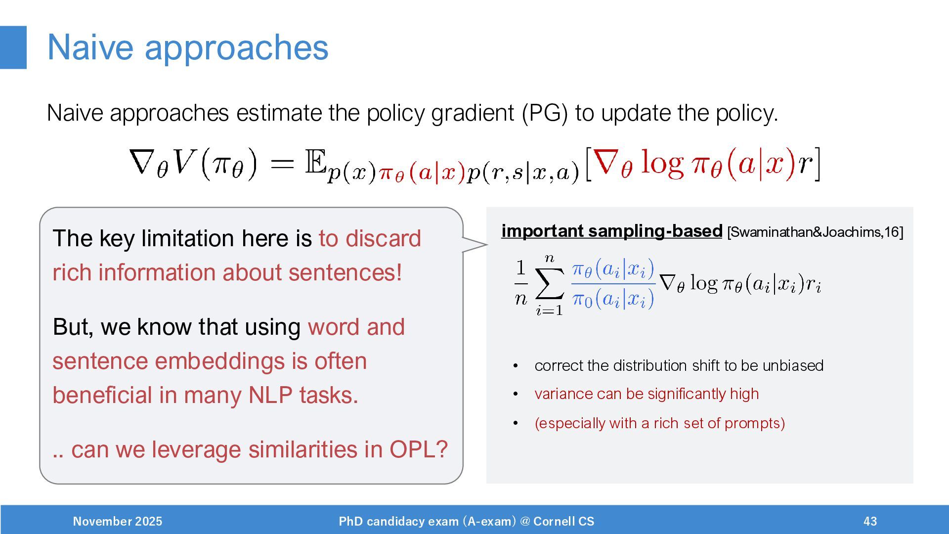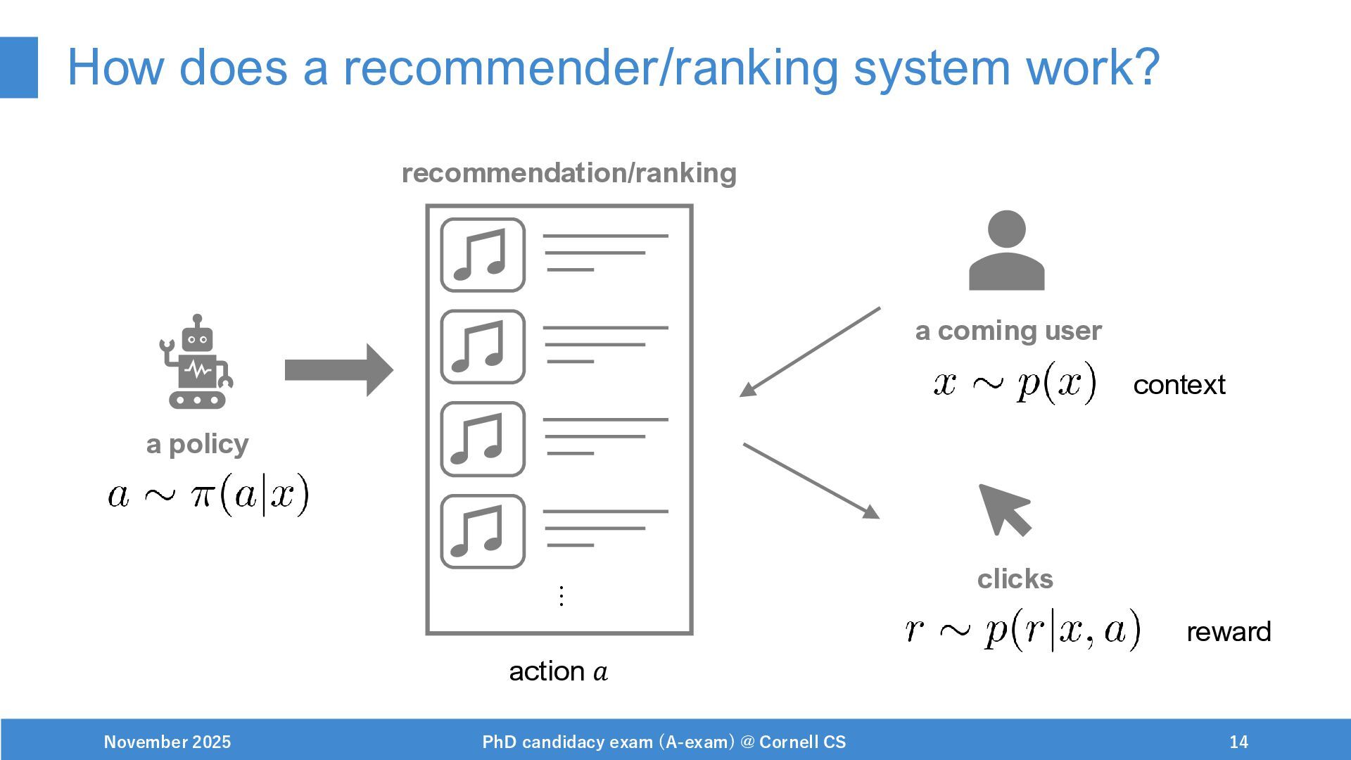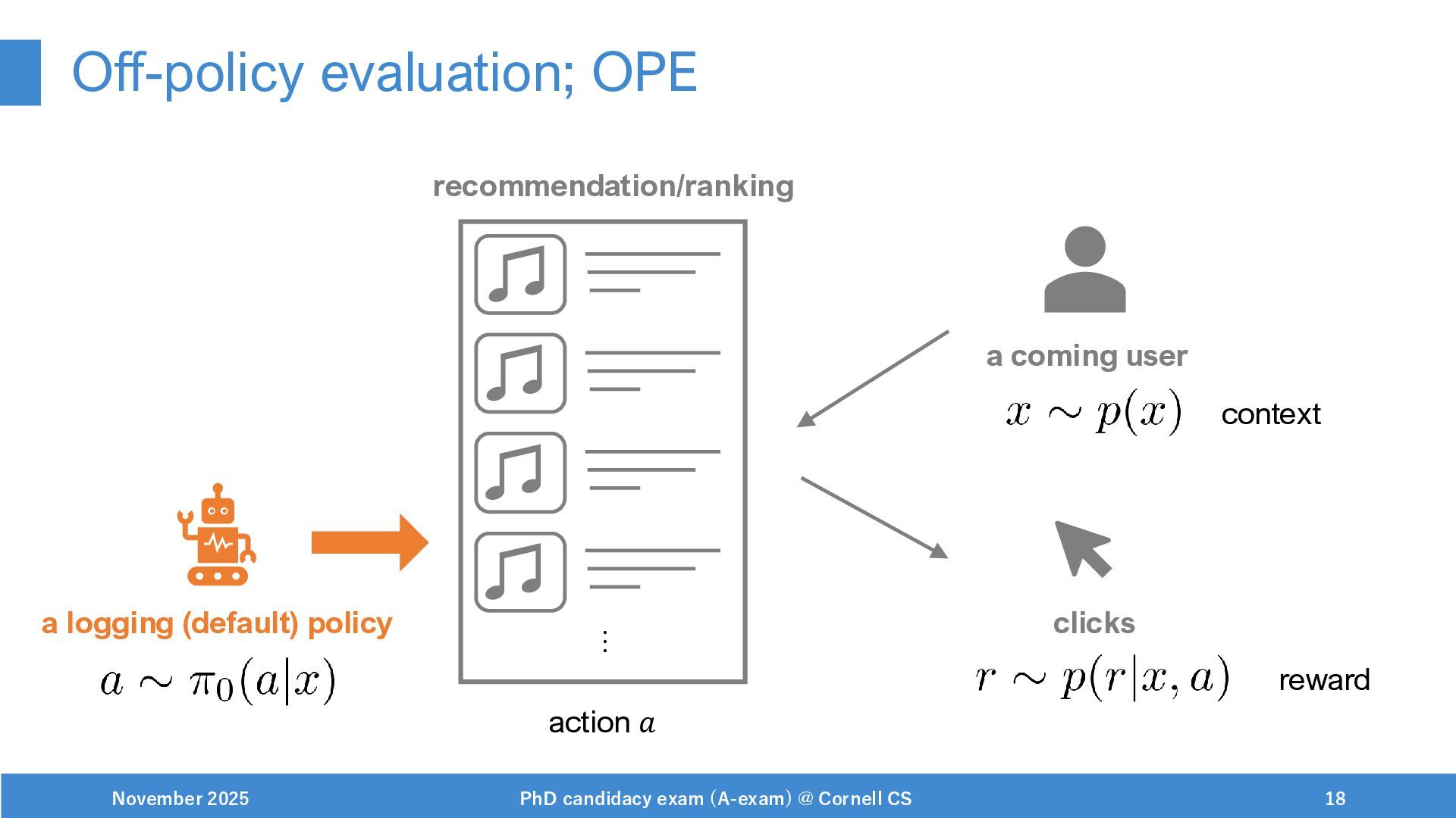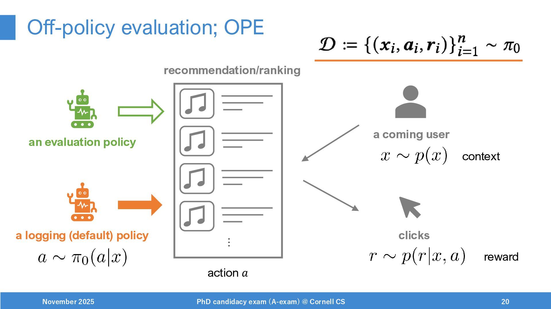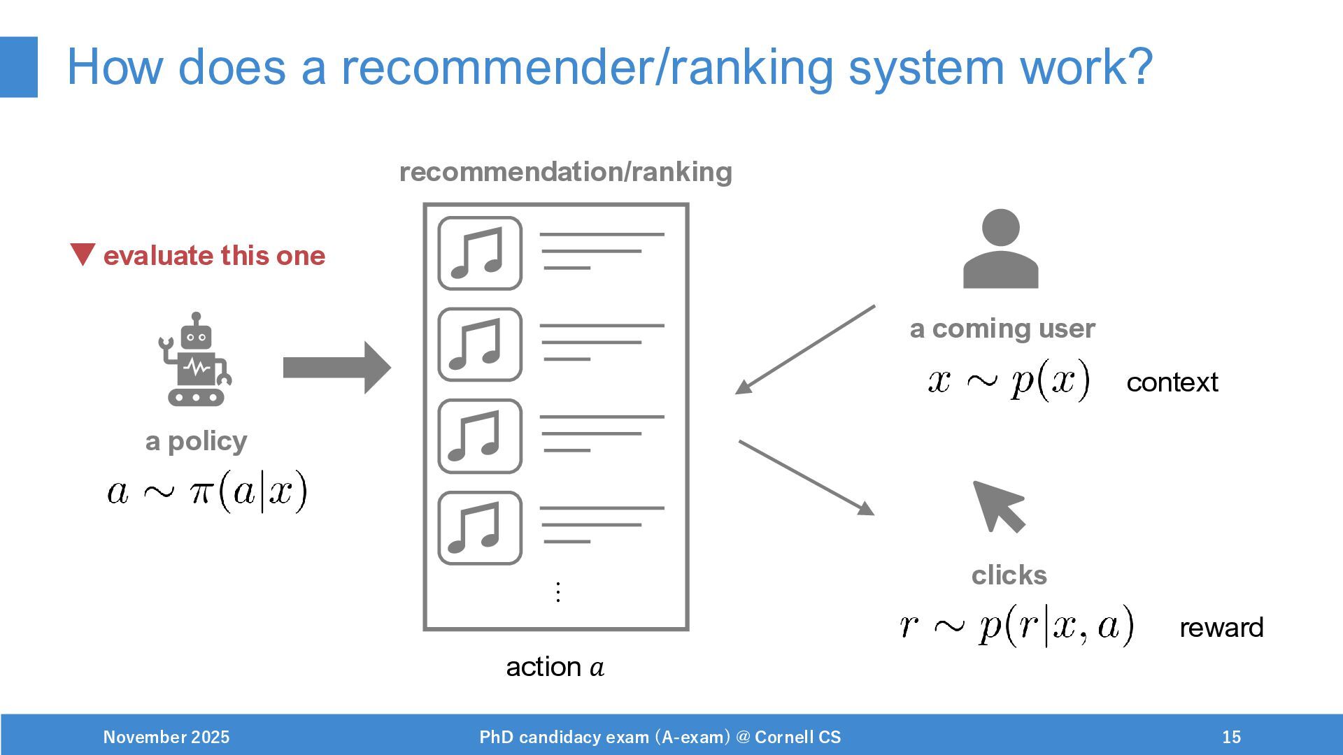NeurIPS, 1999. [Swaminathan&Joachims,16] Adith Swaminathan and Thorsten Joachims. Batch learning from logged bandit feedback through counterfactual risk minimization. JMLR, 2016. [Dudík+,11] Miroslav Dudík, John Langford, and Lihong Li. Doubly robust policy evaluation and learning. ICML, 2011. [Saito+,24] Yuta Saito, Jihan Yao, and Thorsten Joachims. Potec: Off-policy learning for large action spaces via two-stage policy decomposition. 2024. [Brown+,20] Tom Brown, Benjamin Mann, Nick Ryder, Melanie Subbiah, Jared Kaplan, Prafulla Dhariwal, Arvind Neelakantan, Pranav Shyam, Girish Sastry, Amanda Askell, Sandhini Agarwal, Ariel Herbert-Voss, Gretchen Krueger, Tom Henighan, Rewon Child, Aditya Ramesh, Daniel M. Ziegler, Jeffrey Wu, Clemens Winter, Christopher Hesse, Mark Chen, Eric Sigler, Mateusz Litwin, Scott Gray, Benjamin Chess, Jack Clark, Christopher Berner, Sam McCandlish, Alec Radford, Ilya Sutskever, and Dario Amodei. Language models are few-shot learners. NeurIPS, 2020. November 2025 PhD candidacy exam (A-exam) @ Cornell CS 100