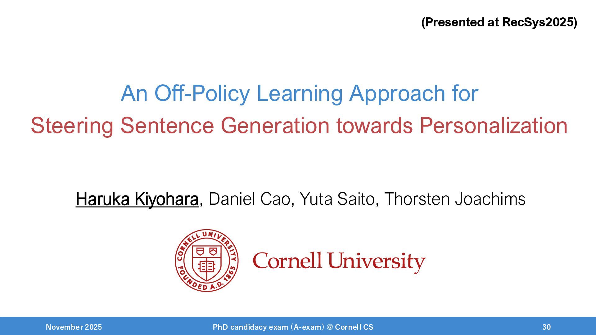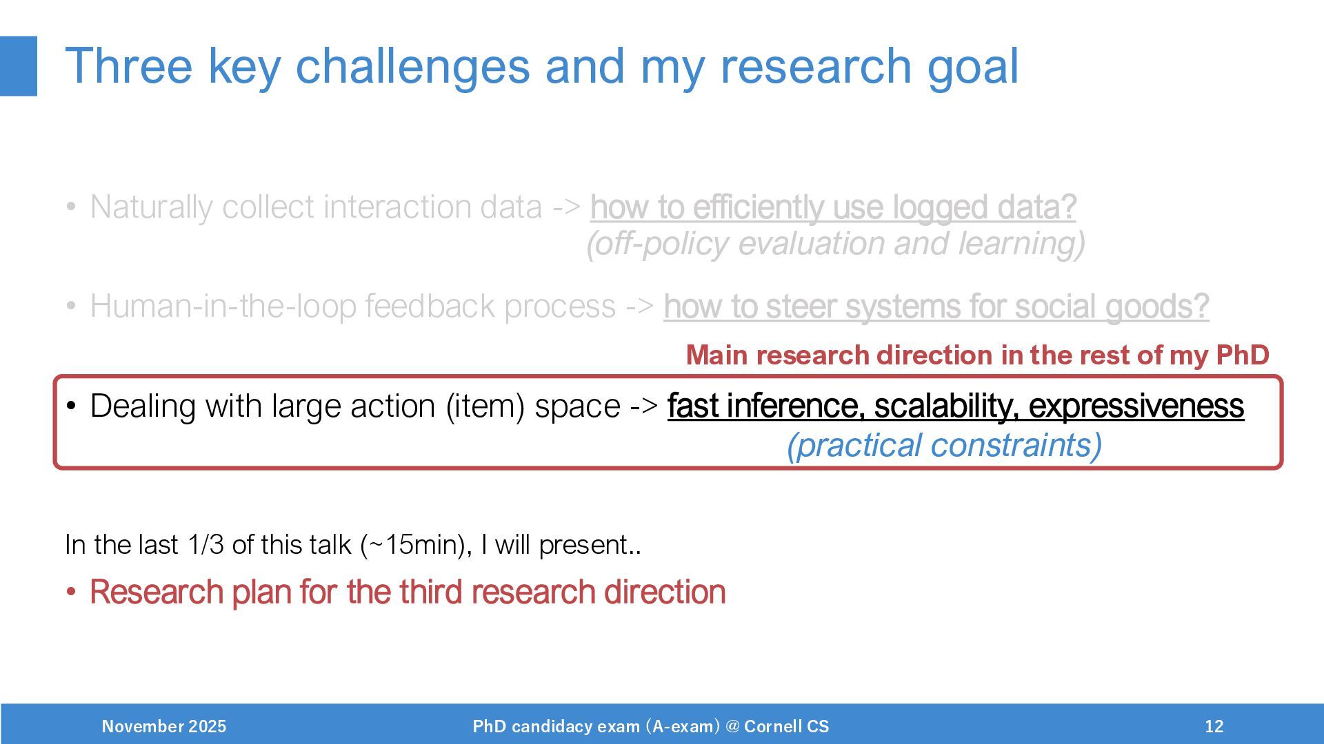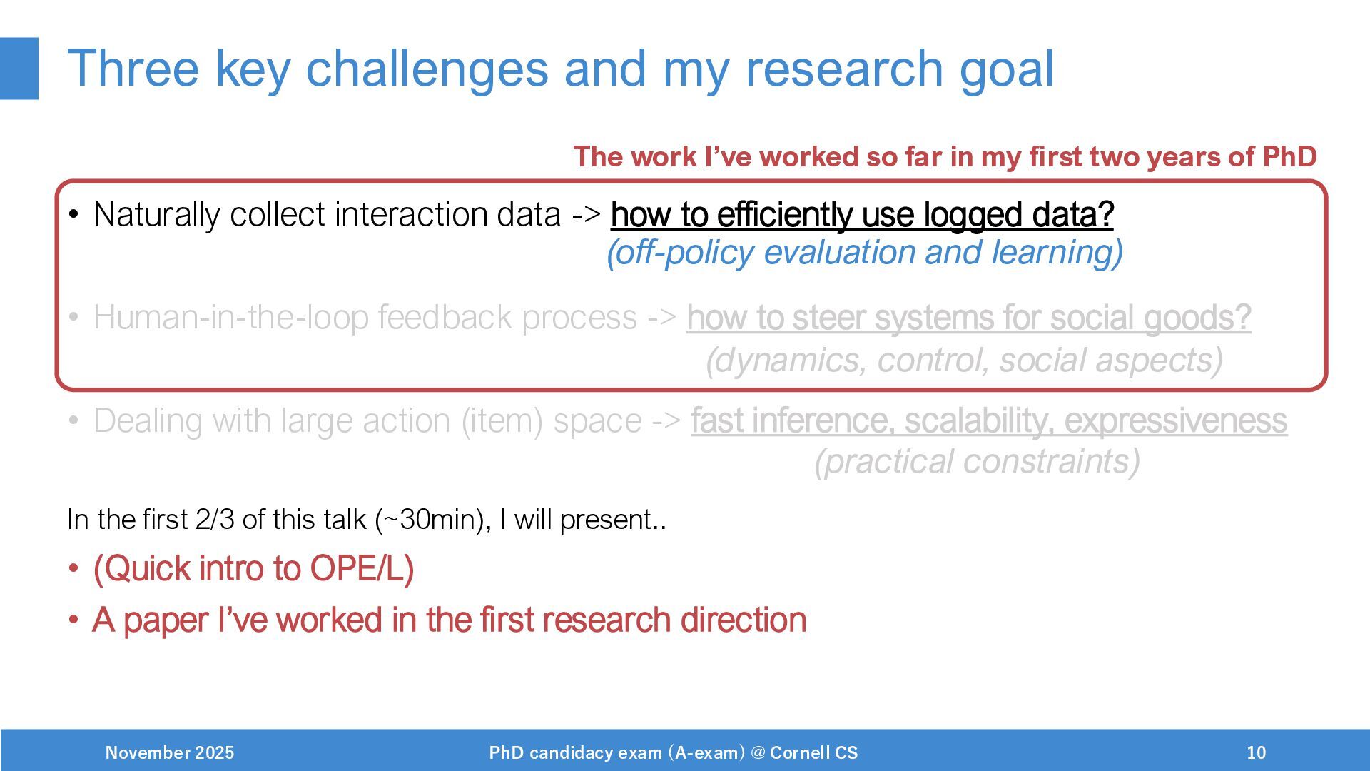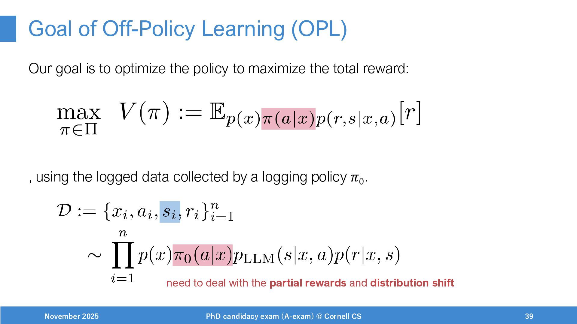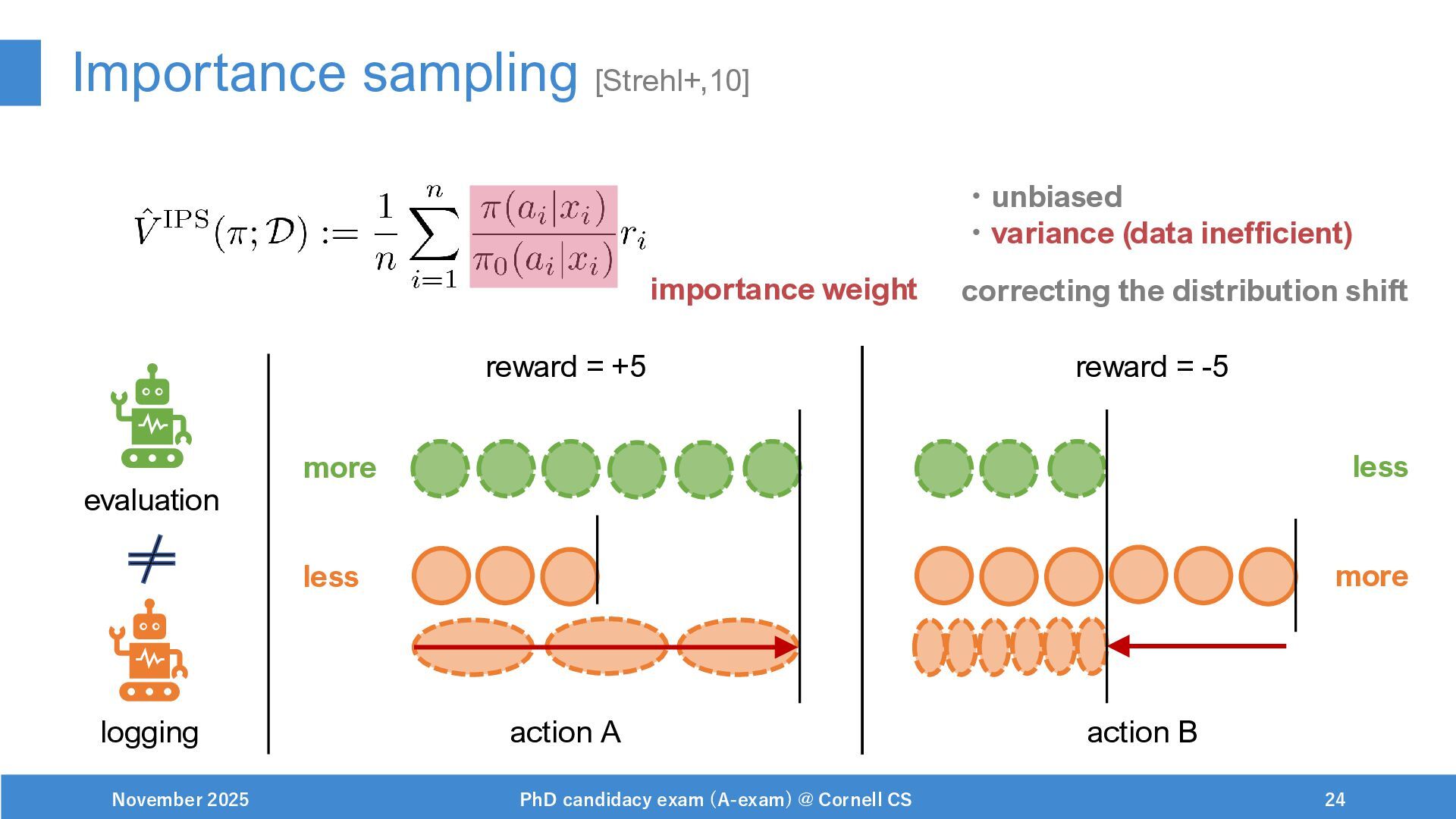 NeurIPS, 1999. [Swaminathan&Joachims,16] Adith Swaminathan and Thorsten Joachims. Batch learning from logged bandit feedback through counterfactual risk minimization. JMLR, 2016. [Dudík+,11] Miroslav Dudík, John Langford, and Lihong Li. Doubly robust policy evaluation and learning. ICML, 2011. [Saito+,24] Yuta Saito, Jihan Yao, and Thorsten Joachims. Potec: Off-policy learning for large action spaces via two-stage policy decomposition. 2024. [Brown+,20] Tom Brown, Benjamin Mann, Nick Ryder, Melanie Subbiah, Jared Kaplan, Prafulla Dhariwal, Arvind Neelakantan, Pranav Shyam, Girish Sastry, Amanda Askell, Sandhini Agarwal, Ariel Herbert-Voss, Gretchen Krueger, Tom Henighan, Rewon Child, Aditya Ramesh, Daniel M. Ziegler, Jeffrey Wu, Clemens Winter, Christopher Hesse, Mark Chen, Eric Sigler, Mateusz Litwin, Scott Gray, Benjamin Chess, Jack Clark, Christopher Berner, Sam McCandlish, Alec Radford, Ilya Sutskever, and Dario Amodei. Language models are few-shot learners. NeurIPS, 2020. November 2025 PhD candidacy exam (A-exam) @ Cornell CS 100