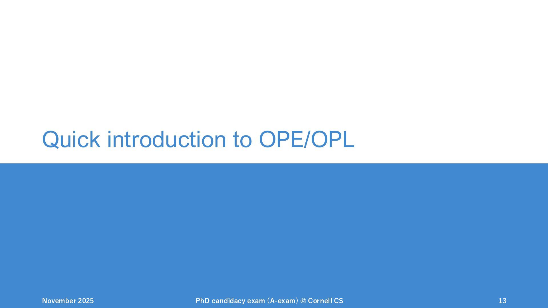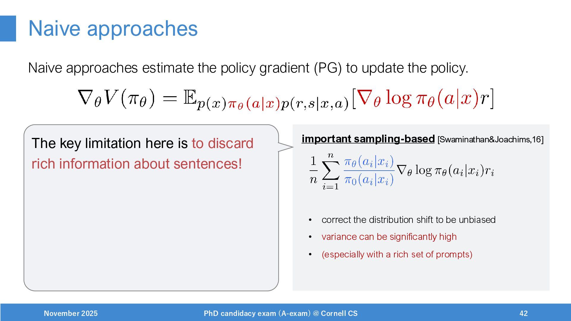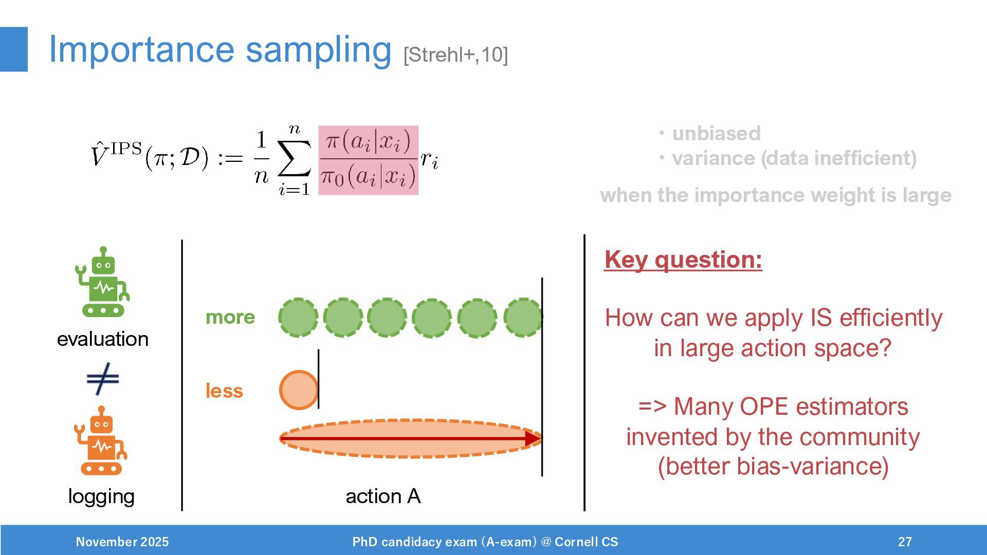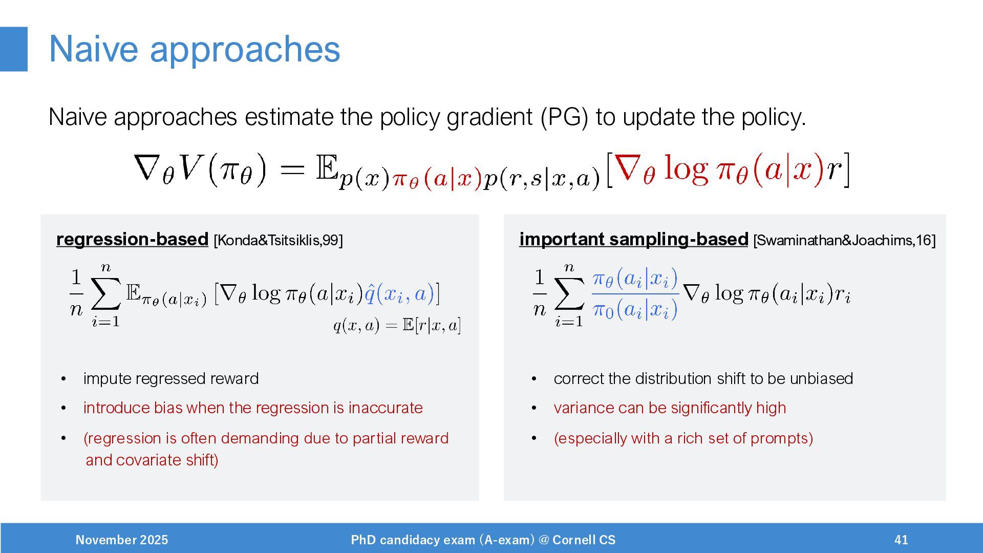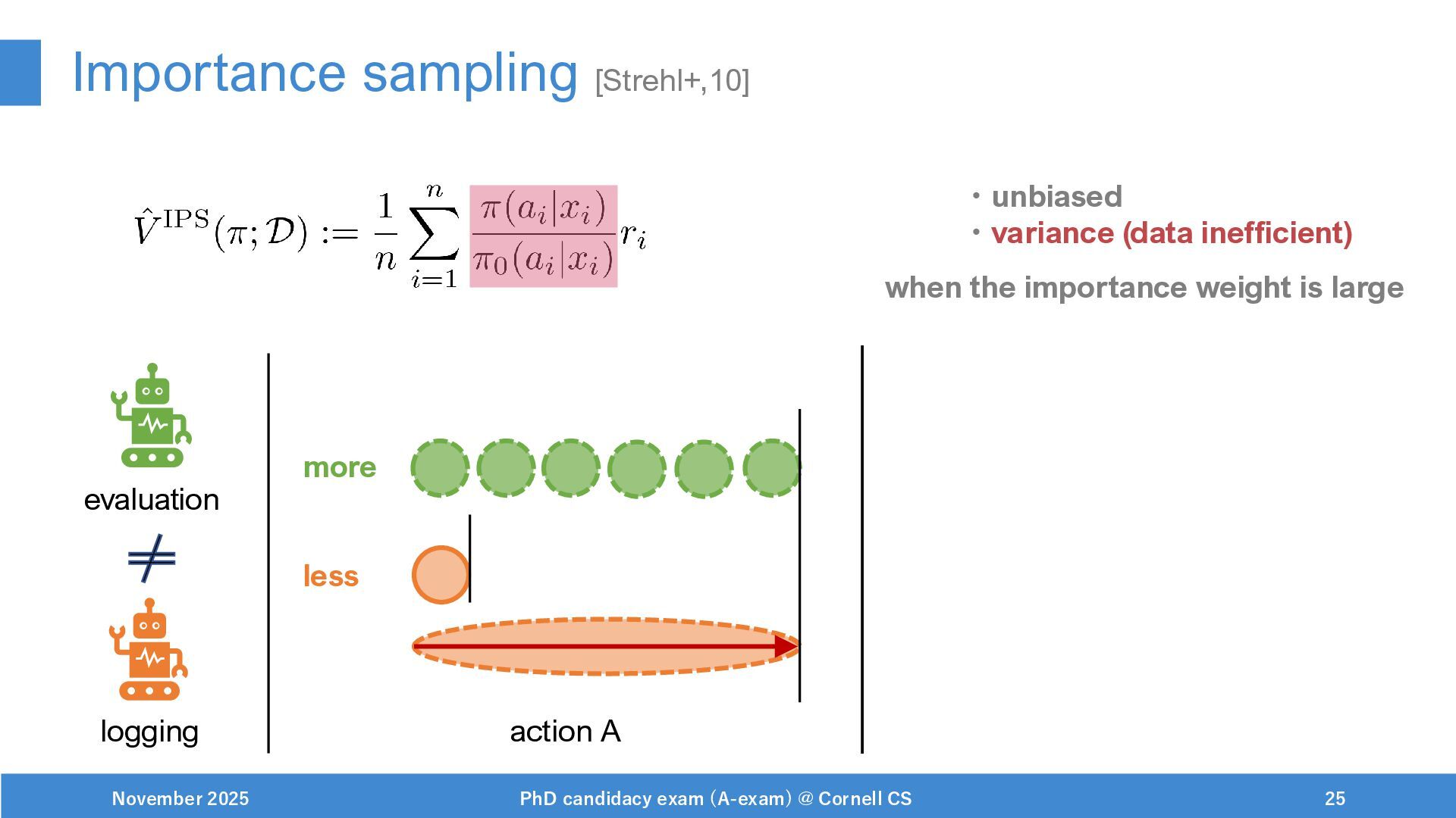 NeurIPS, 1999. [Swaminathan&Joachims,16] Adith Swaminathan and Thorsten Joachims. Batch learning from logged bandit feedback through counterfactual risk minimization. JMLR, 2016. [Dudík+,11] Miroslav Dudík, John Langford, and Lihong Li. Doubly robust policy evaluation and learning. ICML, 2011. [Saito+,24] Yuta Saito, Jihan Yao, and Thorsten Joachims. Potec: Off-policy learning for large action spaces via two-stage policy decomposition. 2024. [Brown+,20] Tom Brown, Benjamin Mann, Nick Ryder, Melanie Subbiah, Jared Kaplan, Prafulla Dhariwal, Arvind Neelakantan, Pranav Shyam, Girish Sastry, Amanda Askell, Sandhini Agarwal, Ariel Herbert-Voss, Gretchen Krueger, Tom Henighan, Rewon Child, Aditya Ramesh, Daniel M. Ziegler, Jeffrey Wu, Clemens Winter, Christopher Hesse, Mark Chen, Eric Sigler, Mateusz Litwin, Scott Gray, Benjamin Chess, Jack Clark, Christopher Berner, Sam McCandlish, Alec Radford, Ilya Sutskever, and Dario Amodei. Language models are few-shot learners. NeurIPS, 2020. November 2025 PhD candidacy exam (A-exam) @ Cornell CS 100