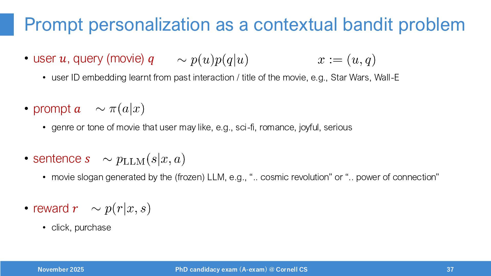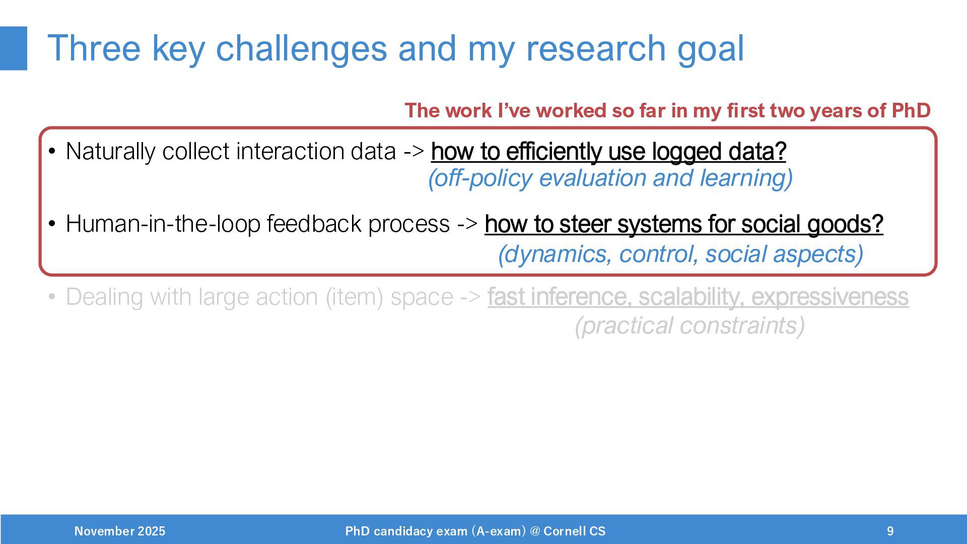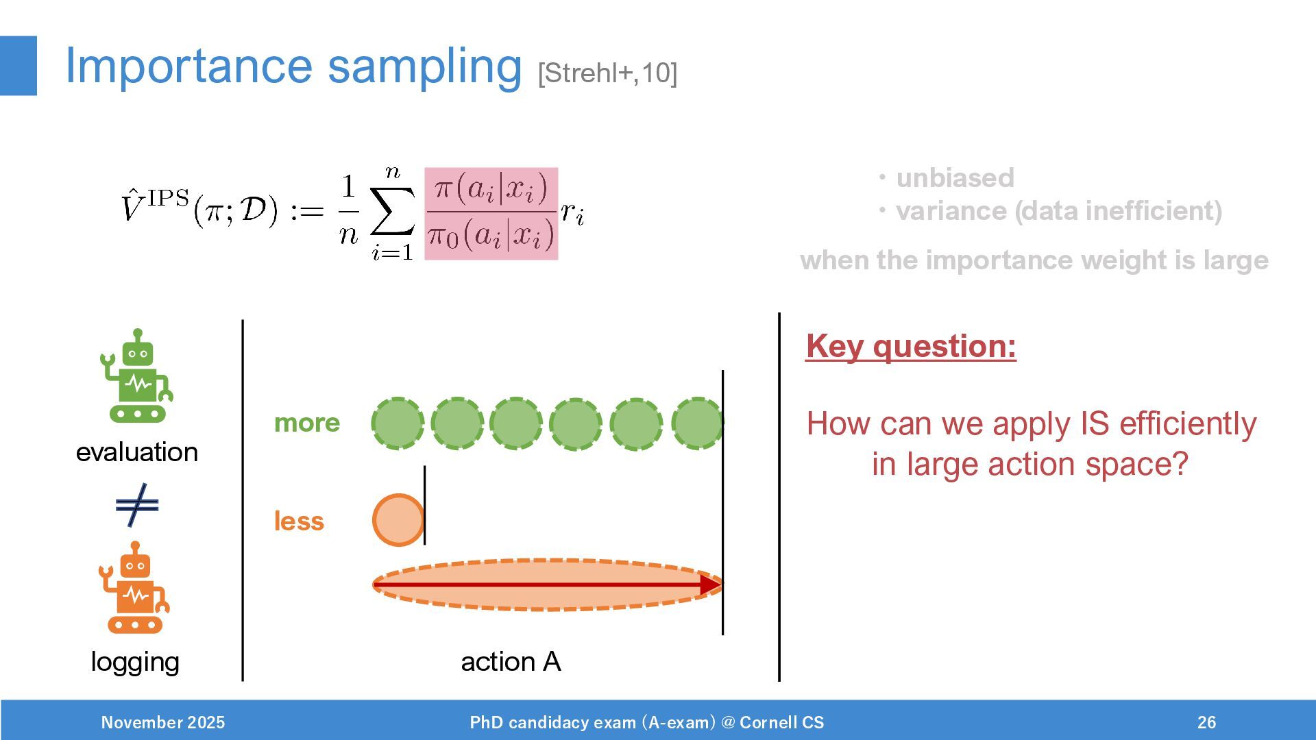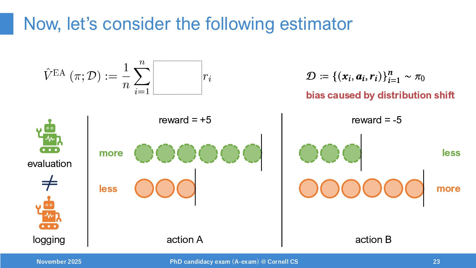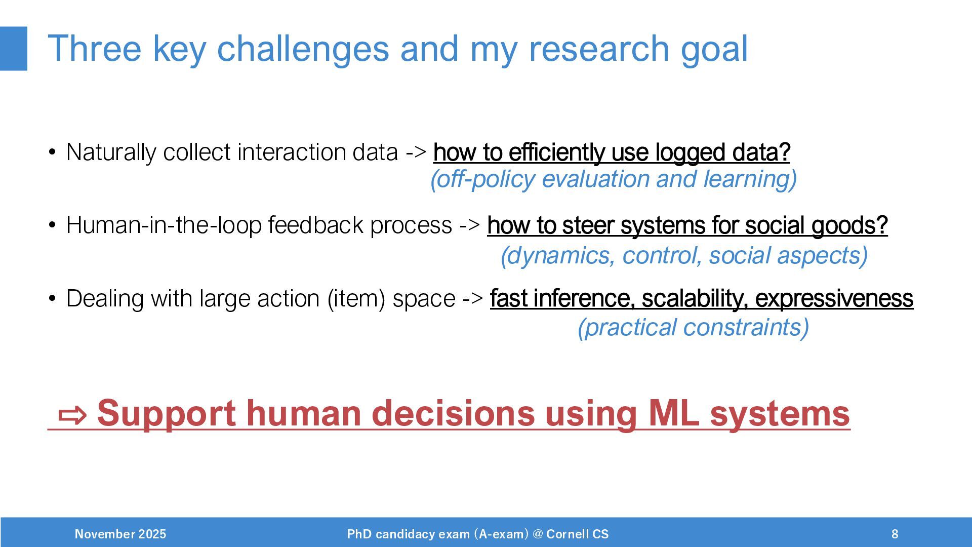 NeurIPS, 1999. [Swaminathan&Joachims,16] Adith Swaminathan and Thorsten Joachims. Batch learning from logged bandit feedback through counterfactual risk minimization. JMLR, 2016. [Dudík+,11] Miroslav Dudík, John Langford, and Lihong Li. Doubly robust policy evaluation and learning. ICML, 2011. [Saito+,24] Yuta Saito, Jihan Yao, and Thorsten Joachims. Potec: Off-policy learning for large action spaces via two-stage policy decomposition. 2024. [Brown+,20] Tom Brown, Benjamin Mann, Nick Ryder, Melanie Subbiah, Jared Kaplan, Prafulla Dhariwal, Arvind Neelakantan, Pranav Shyam, Girish Sastry, Amanda Askell, Sandhini Agarwal, Ariel Herbert-Voss, Gretchen Krueger, Tom Henighan, Rewon Child, Aditya Ramesh, Daniel M. Ziegler, Jeffrey Wu, Clemens Winter, Christopher Hesse, Mark Chen, Eric Sigler, Mateusz Litwin, Scott Gray, Benjamin Chess, Jack Clark, Christopher Berner, Sam McCandlish, Alec Radford, Ilya Sutskever, and Dario Amodei. Language models are few-shot learners. NeurIPS, 2020. November 2025 PhD candidacy exam (A-exam) @ Cornell CS 100