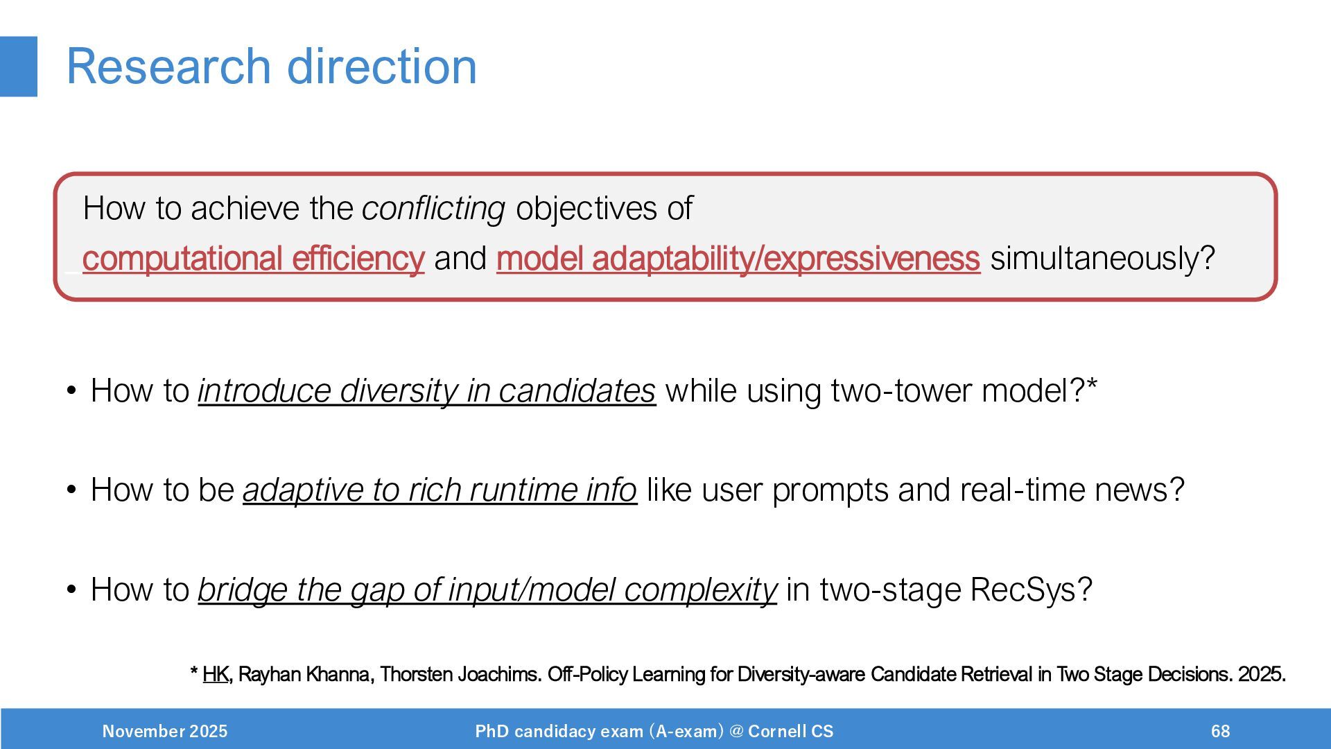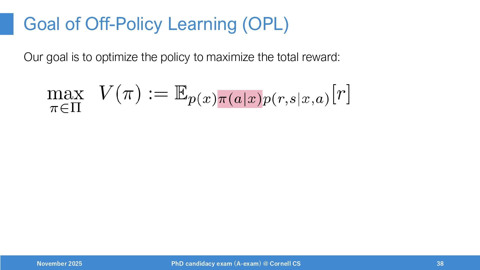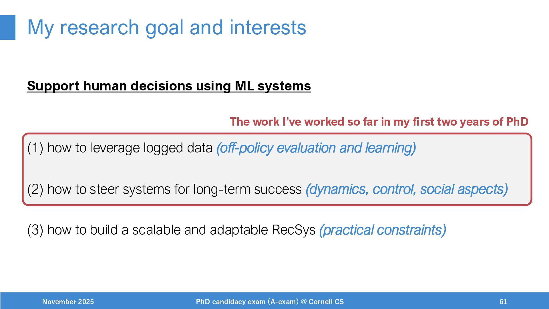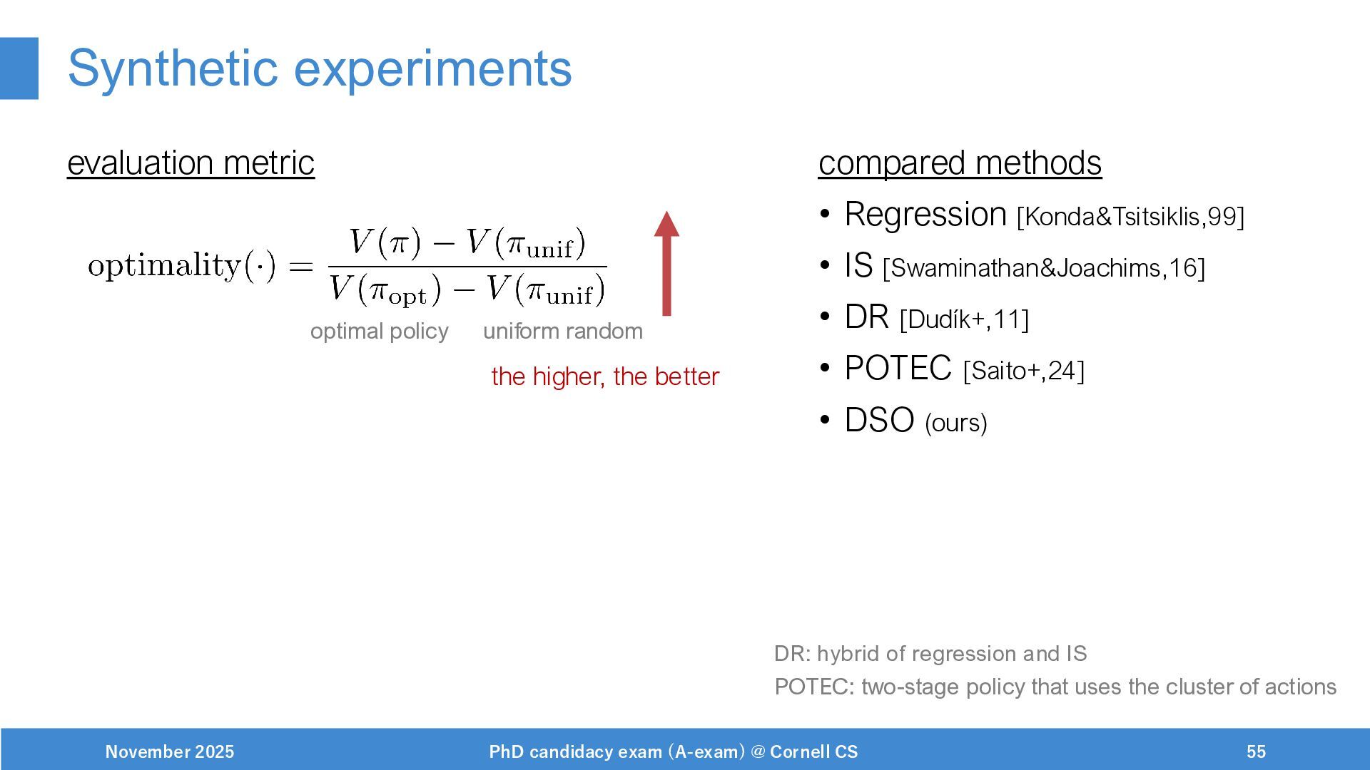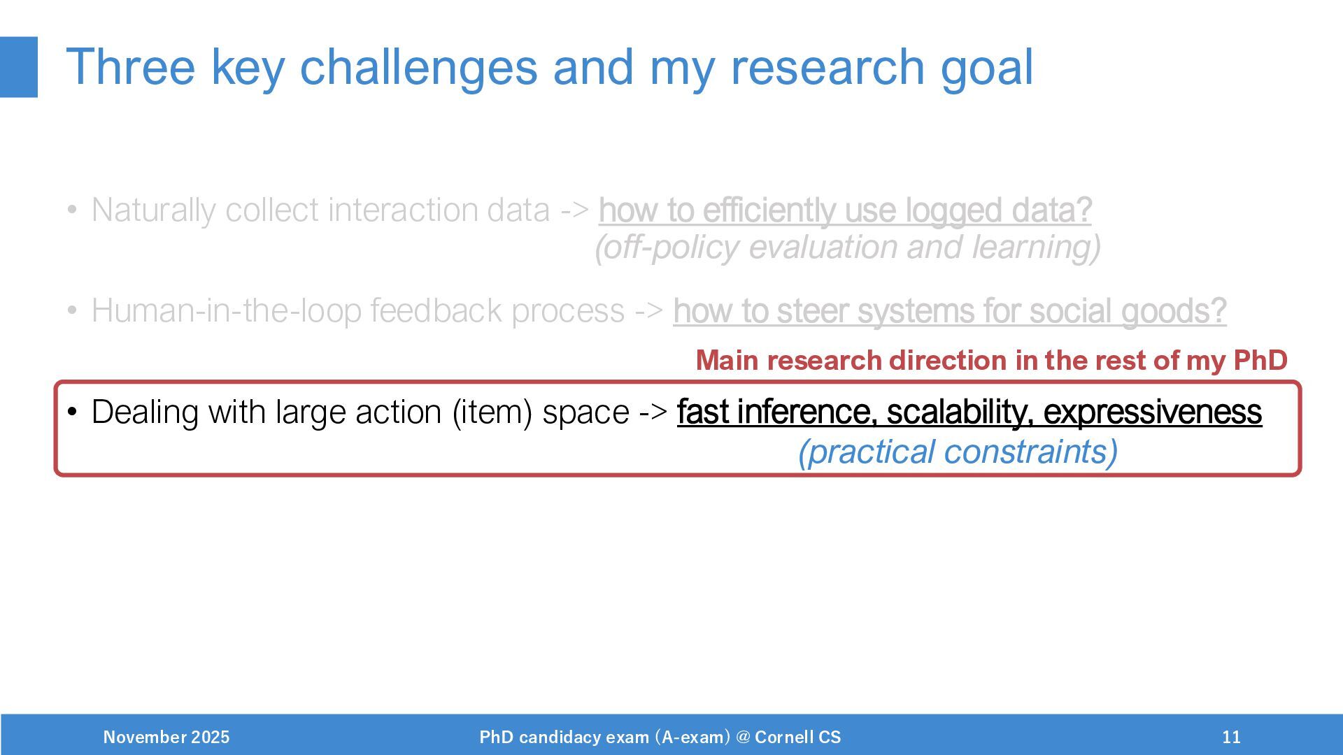 NeurIPS, 1999. [Swaminathan&Joachims,16] Adith Swaminathan and Thorsten Joachims. Batch learning from logged bandit feedback through counterfactual risk minimization. JMLR, 2016. [Dudík+,11] Miroslav Dudík, John Langford, and Lihong Li. Doubly robust policy evaluation and learning. ICML, 2011. [Saito+,24] Yuta Saito, Jihan Yao, and Thorsten Joachims. Potec: Off-policy learning for large action spaces via two-stage policy decomposition. 2024. [Brown+,20] Tom Brown, Benjamin Mann, Nick Ryder, Melanie Subbiah, Jared Kaplan, Prafulla Dhariwal, Arvind Neelakantan, Pranav Shyam, Girish Sastry, Amanda Askell, Sandhini Agarwal, Ariel Herbert-Voss, Gretchen Krueger, Tom Henighan, Rewon Child, Aditya Ramesh, Daniel M. Ziegler, Jeffrey Wu, Clemens Winter, Christopher Hesse, Mark Chen, Eric Sigler, Mateusz Litwin, Scott Gray, Benjamin Chess, Jack Clark, Christopher Berner, Sam McCandlish, Alec Radford, Ilya Sutskever, and Dario Amodei. Language models are few-shot learners. NeurIPS, 2020. November 2025 PhD candidacy exam (A-exam) @ Cornell CS 100