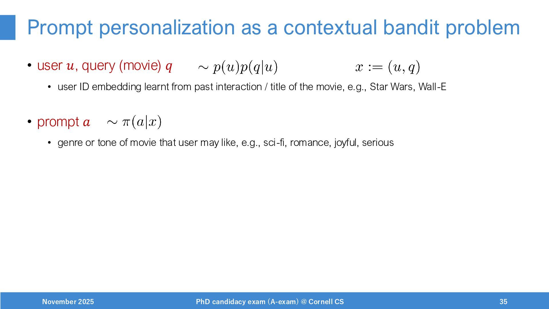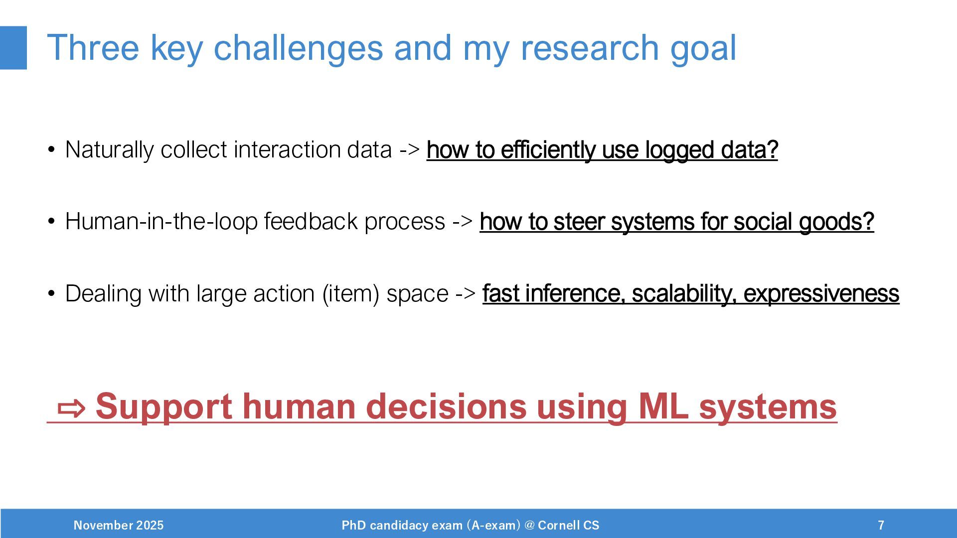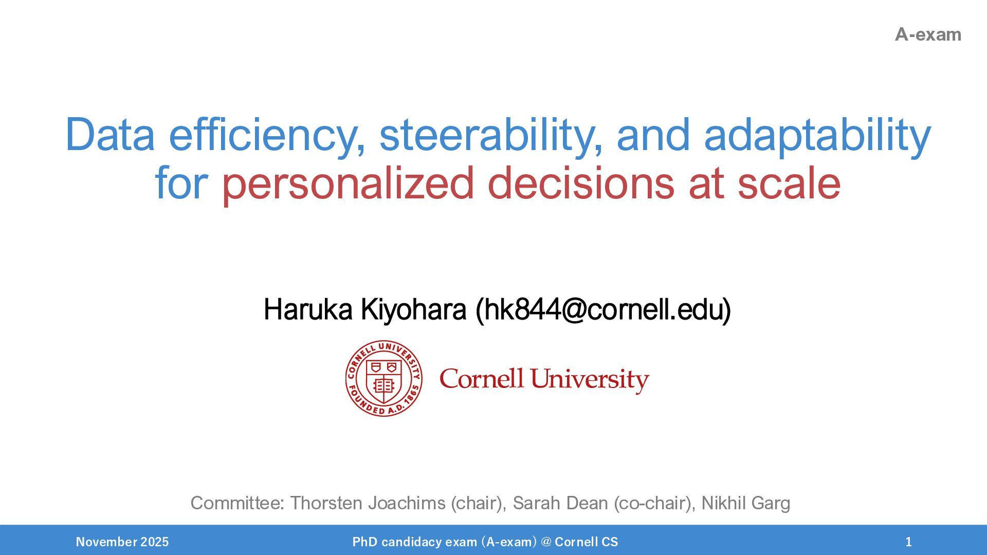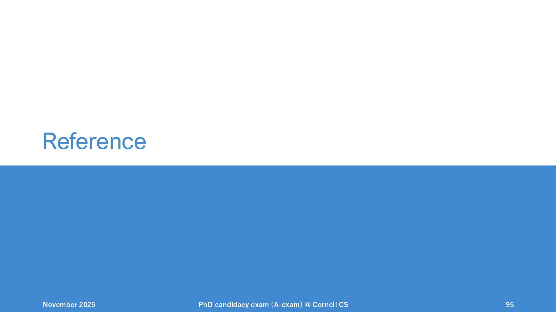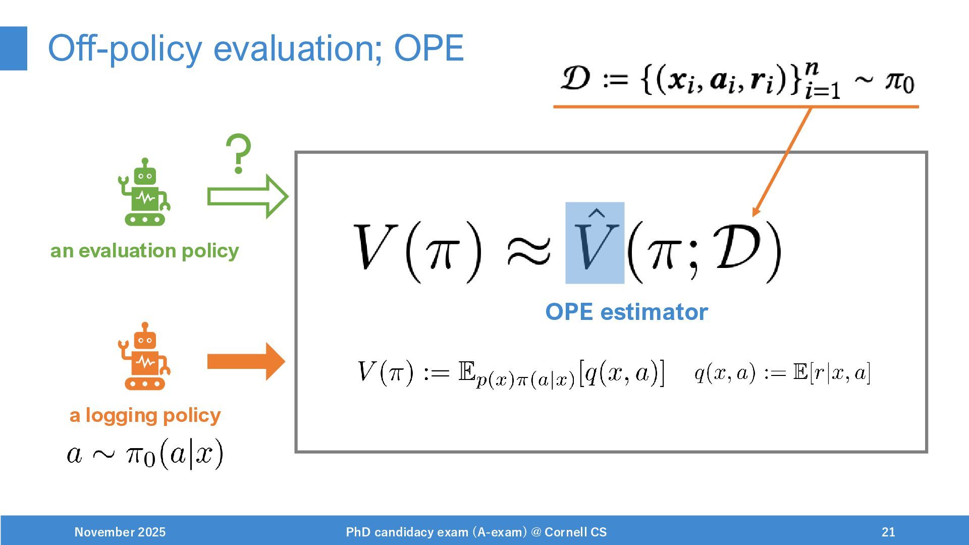 NeurIPS, 1999. [Swaminathan&Joachims,16] Adith Swaminathan and Thorsten Joachims. Batch learning from logged bandit feedback through counterfactual risk minimization. JMLR, 2016. [Dudík+,11] Miroslav Dudík, John Langford, and Lihong Li. Doubly robust policy evaluation and learning. ICML, 2011. [Saito+,24] Yuta Saito, Jihan Yao, and Thorsten Joachims. Potec: Off-policy learning for large action spaces via two-stage policy decomposition. 2024. [Brown+,20] Tom Brown, Benjamin Mann, Nick Ryder, Melanie Subbiah, Jared Kaplan, Prafulla Dhariwal, Arvind Neelakantan, Pranav Shyam, Girish Sastry, Amanda Askell, Sandhini Agarwal, Ariel Herbert-Voss, Gretchen Krueger, Tom Henighan, Rewon Child, Aditya Ramesh, Daniel M. Ziegler, Jeffrey Wu, Clemens Winter, Christopher Hesse, Mark Chen, Eric Sigler, Mateusz Litwin, Scott Gray, Benjamin Chess, Jack Clark, Christopher Berner, Sam McCandlish, Alec Radford, Ilya Sutskever, and Dario Amodei. Language models are few-shot learners. NeurIPS, 2020. November 2025 PhD candidacy exam (A-exam) @ Cornell CS 100
