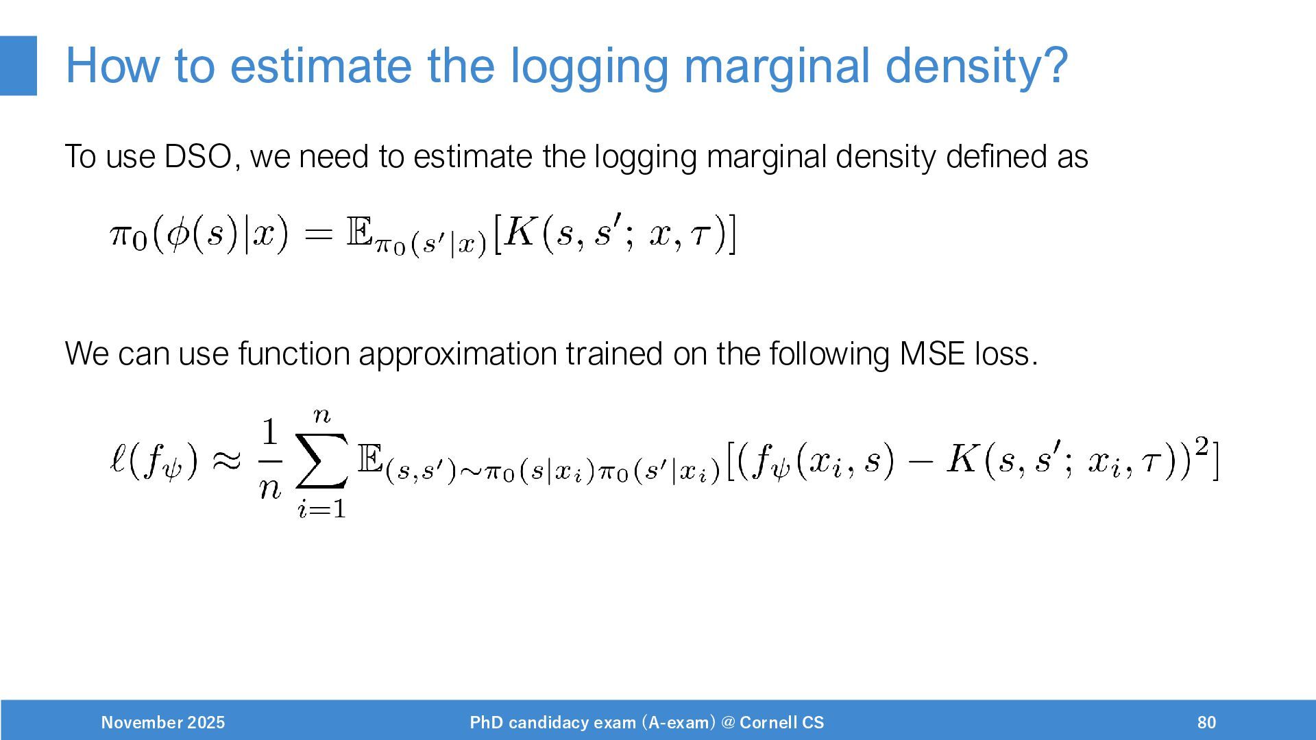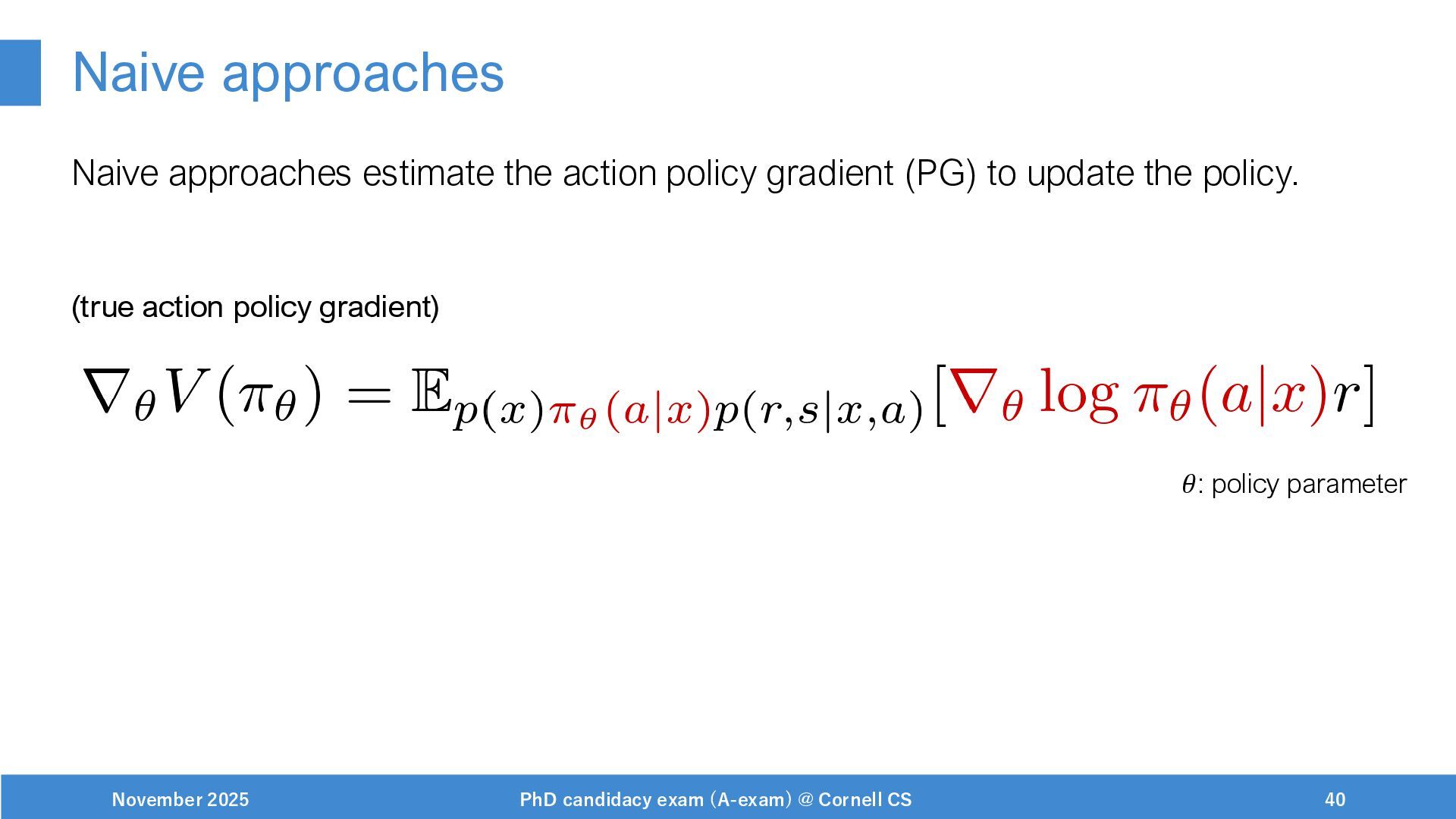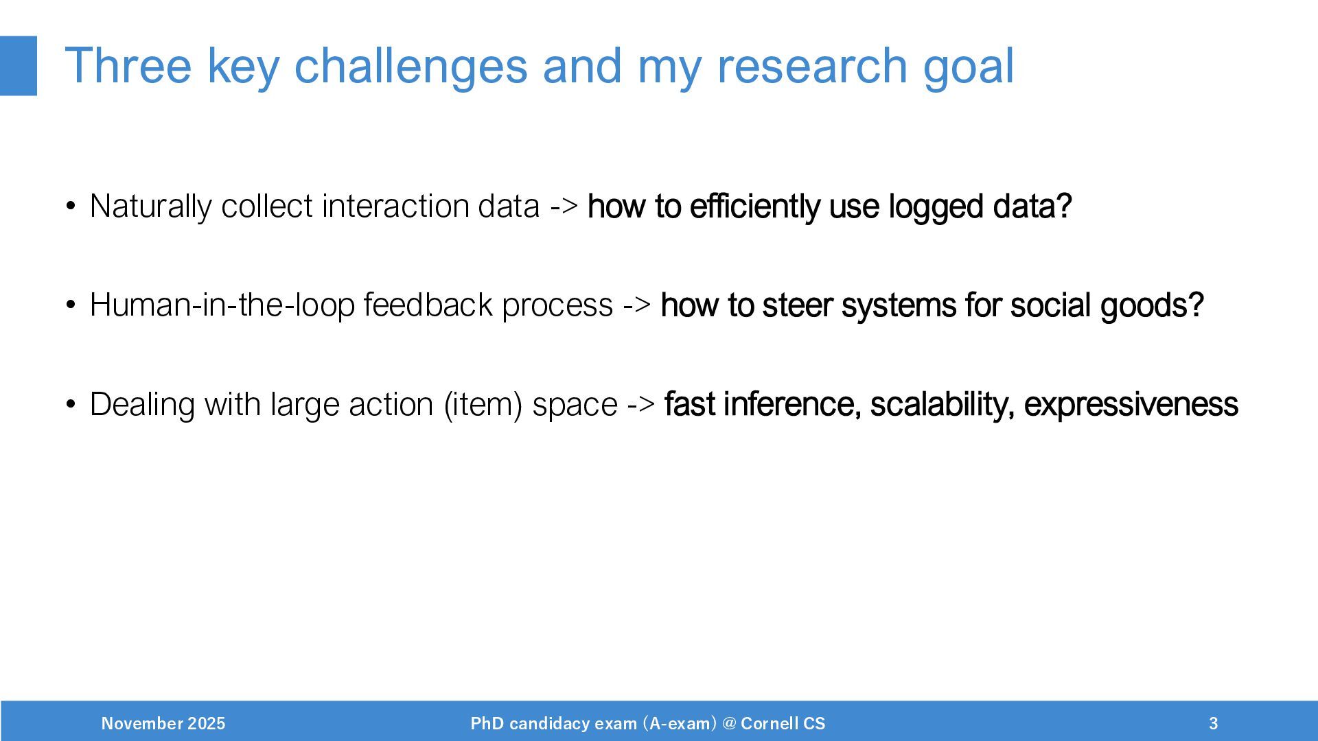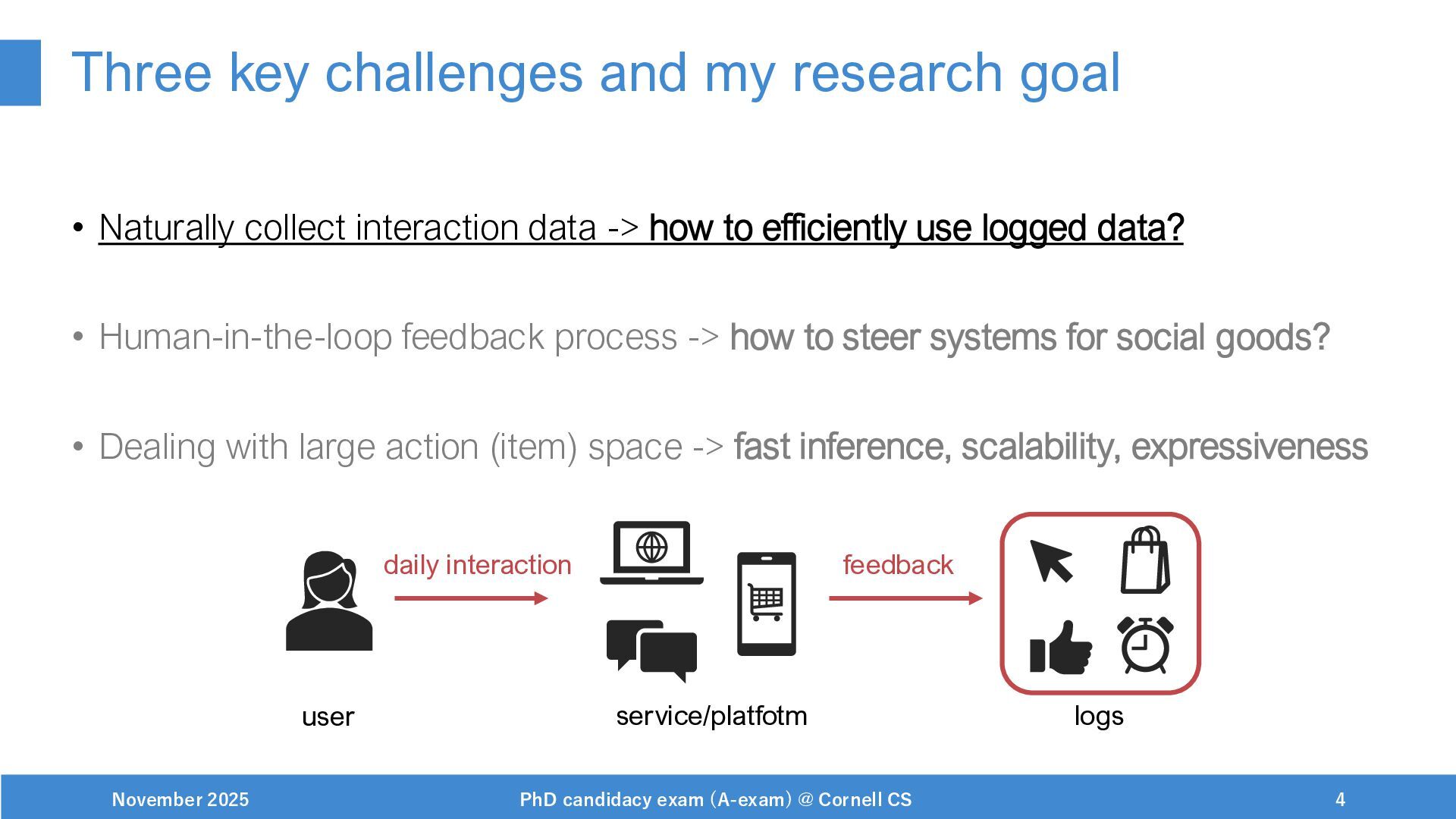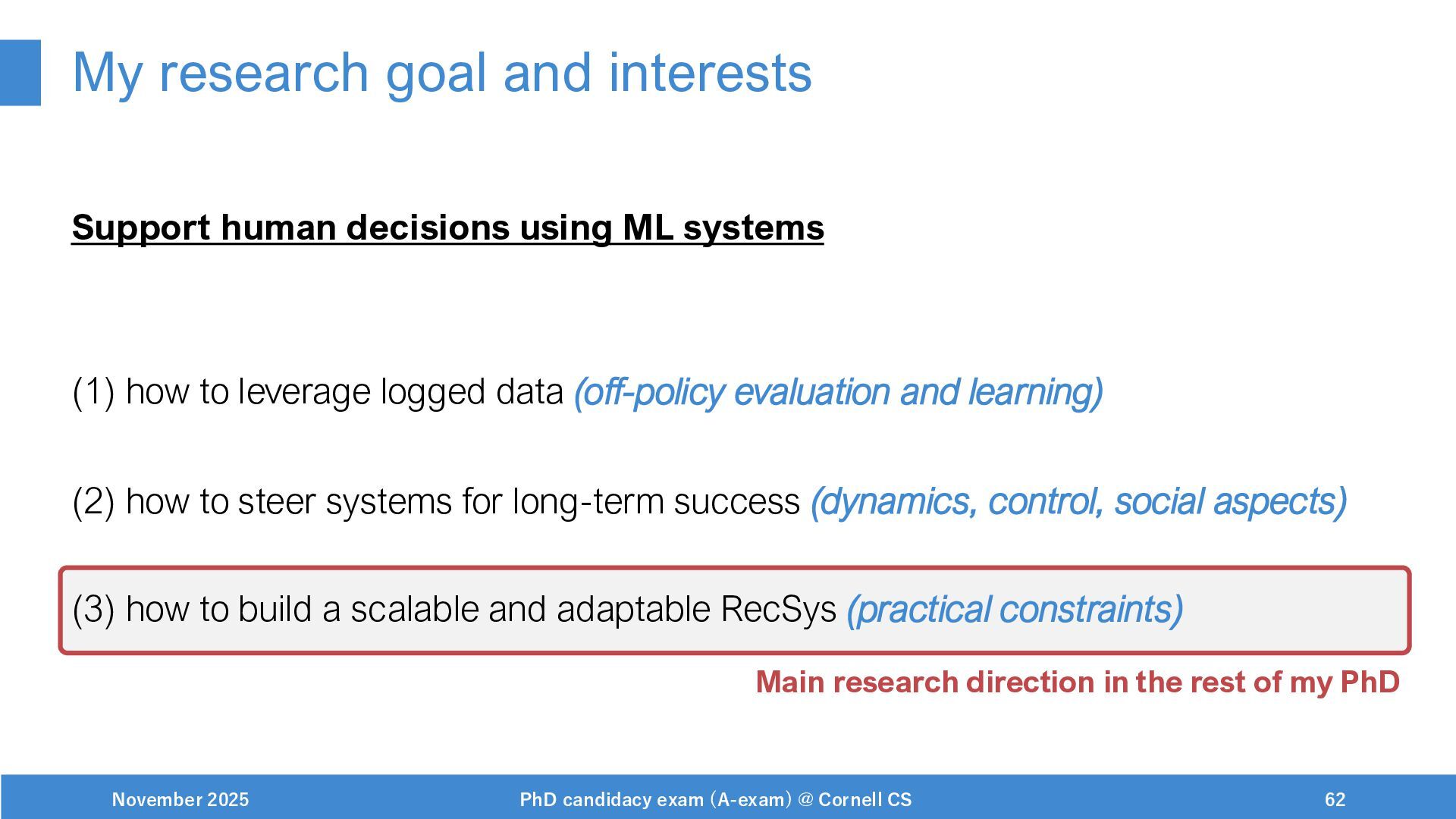NeurIPS, 1999. [Swaminathan&Joachims,16] Adith Swaminathan and Thorsten Joachims. Batch learning from logged bandit feedback through counterfactual risk minimization. JMLR, 2016. [Dudík+,11] Miroslav Dudík, John Langford, and Lihong Li. Doubly robust policy evaluation and learning. ICML, 2011. [Saito+,24] Yuta Saito, Jihan Yao, and Thorsten Joachims. Potec: Off-policy learning for large action spaces via two-stage policy decomposition. 2024. [Brown+,20] Tom Brown, Benjamin Mann, Nick Ryder, Melanie Subbiah, Jared Kaplan, Prafulla Dhariwal, Arvind Neelakantan, Pranav Shyam, Girish Sastry, Amanda Askell, Sandhini Agarwal, Ariel Herbert-Voss, Gretchen Krueger, Tom Henighan, Rewon Child, Aditya Ramesh, Daniel M. Ziegler, Jeffrey Wu, Clemens Winter, Christopher Hesse, Mark Chen, Eric Sigler, Mateusz Litwin, Scott Gray, Benjamin Chess, Jack Clark, Christopher Berner, Sam McCandlish, Alec Radford, Ilya Sutskever, and Dario Amodei. Language models are few-shot learners. NeurIPS, 2020. November 2025 PhD candidacy exam (A-exam) @ Cornell CS 100