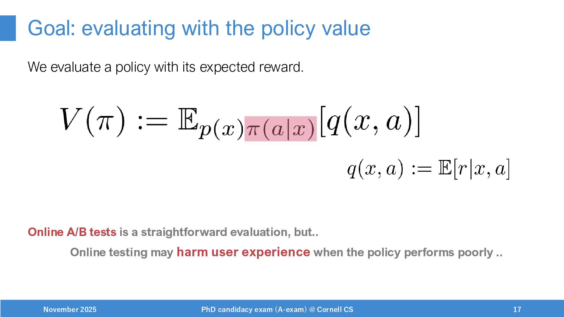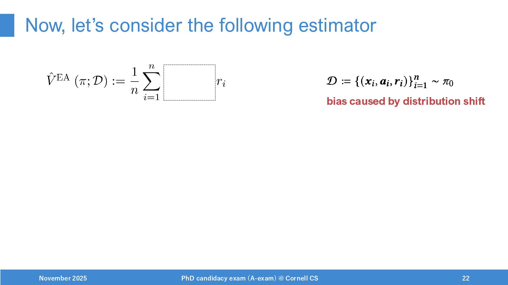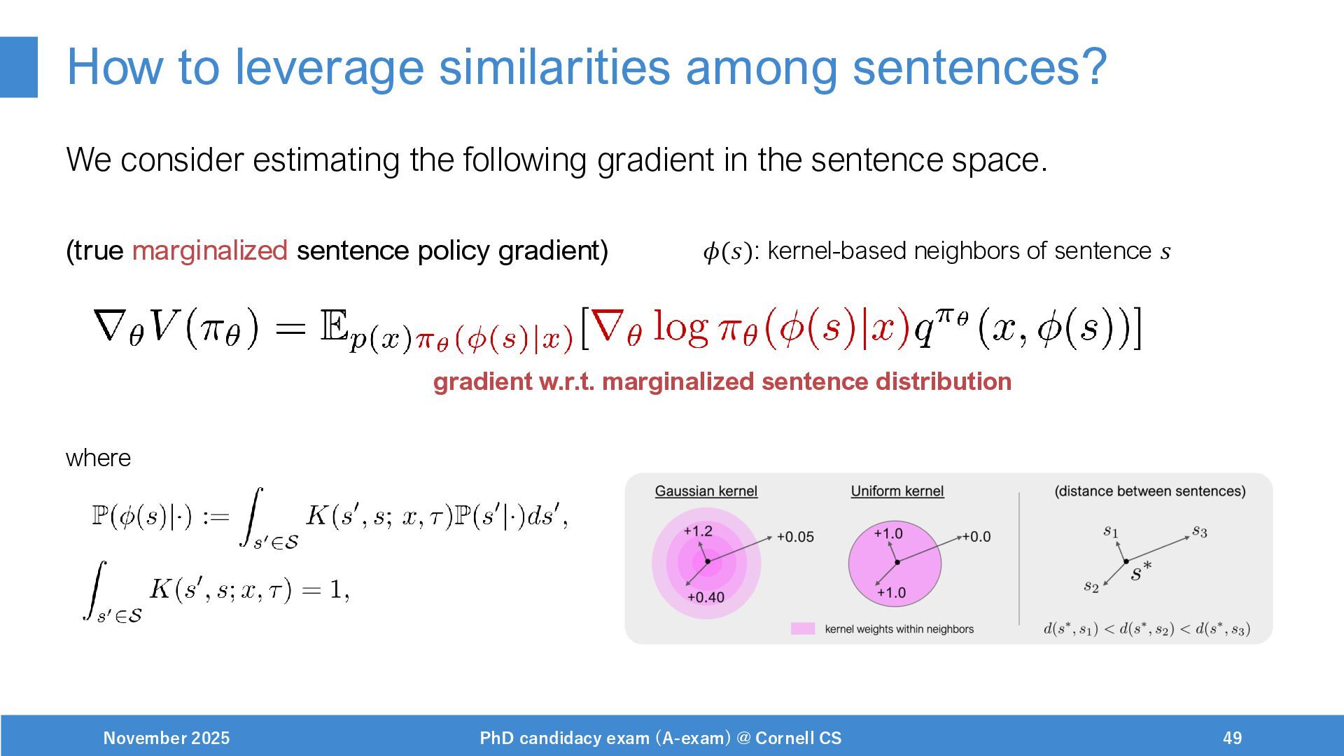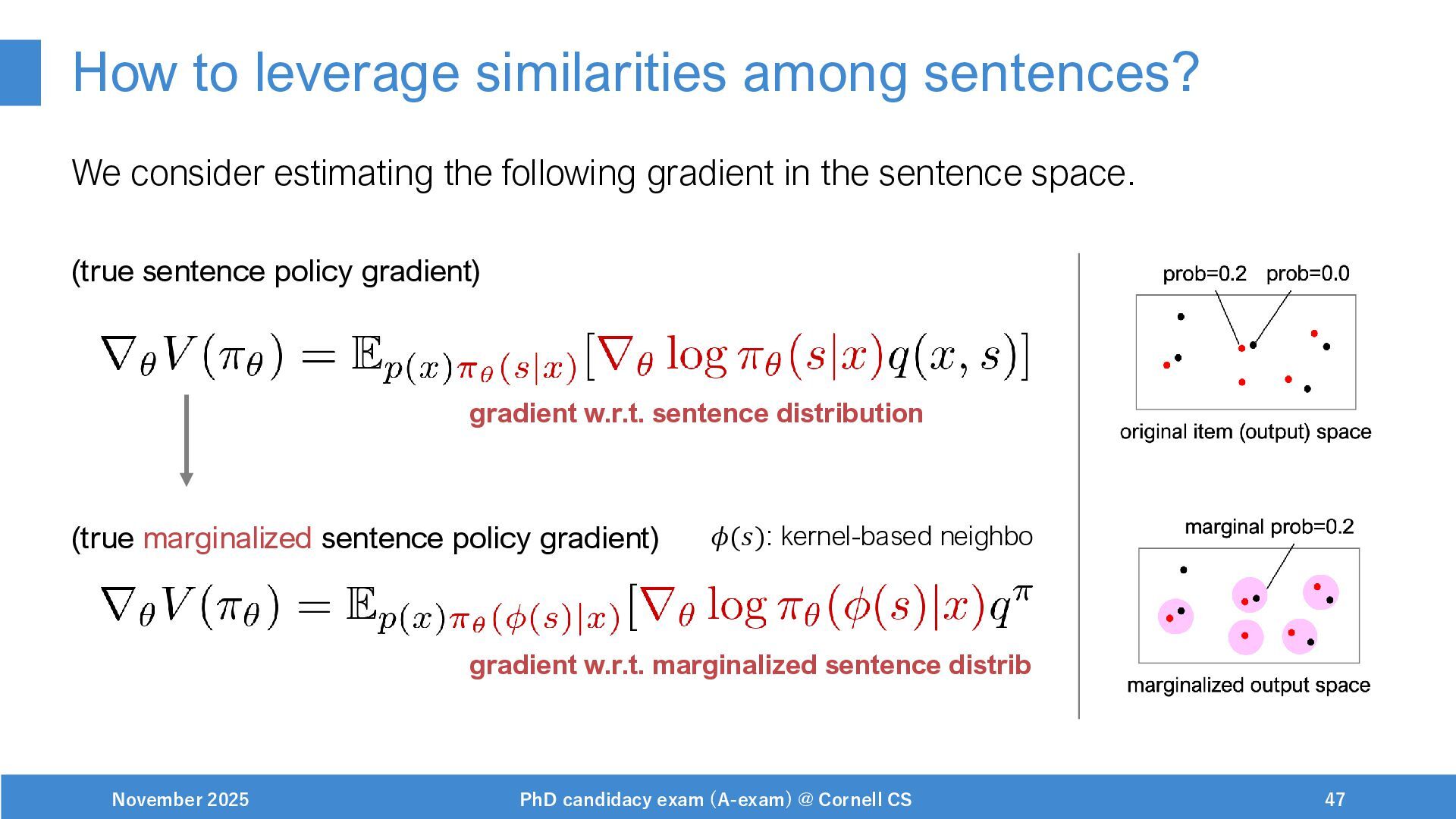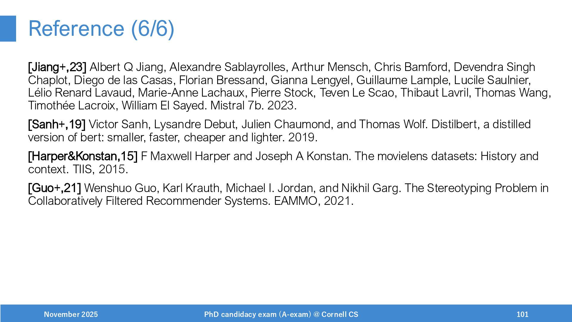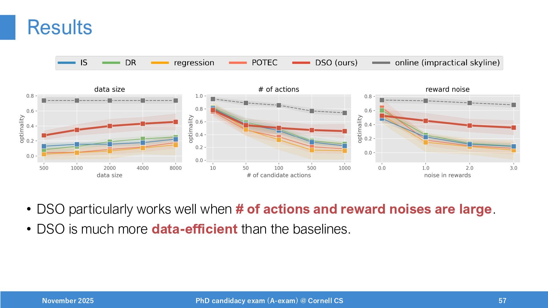 NeurIPS, 1999. [Swaminathan&Joachims,16] Adith Swaminathan and Thorsten Joachims. Batch learning from logged bandit feedback through counterfactual risk minimization. JMLR, 2016. [Dudík+,11] Miroslav Dudík, John Langford, and Lihong Li. Doubly robust policy evaluation and learning. ICML, 2011. [Saito+,24] Yuta Saito, Jihan Yao, and Thorsten Joachims. Potec: Off-policy learning for large action spaces via two-stage policy decomposition. 2024. [Brown+,20] Tom Brown, Benjamin Mann, Nick Ryder, Melanie Subbiah, Jared Kaplan, Prafulla Dhariwal, Arvind Neelakantan, Pranav Shyam, Girish Sastry, Amanda Askell, Sandhini Agarwal, Ariel Herbert-Voss, Gretchen Krueger, Tom Henighan, Rewon Child, Aditya Ramesh, Daniel M. Ziegler, Jeffrey Wu, Clemens Winter, Christopher Hesse, Mark Chen, Eric Sigler, Mateusz Litwin, Scott Gray, Benjamin Chess, Jack Clark, Christopher Berner, Sam McCandlish, Alec Radford, Ilya Sutskever, and Dario Amodei. Language models are few-shot learners. NeurIPS, 2020. November 2025 PhD candidacy exam (A-exam) @ Cornell CS 100