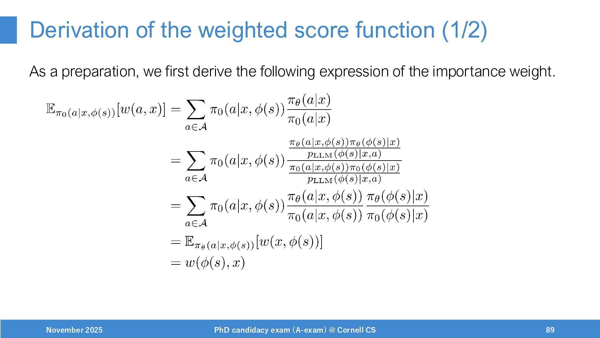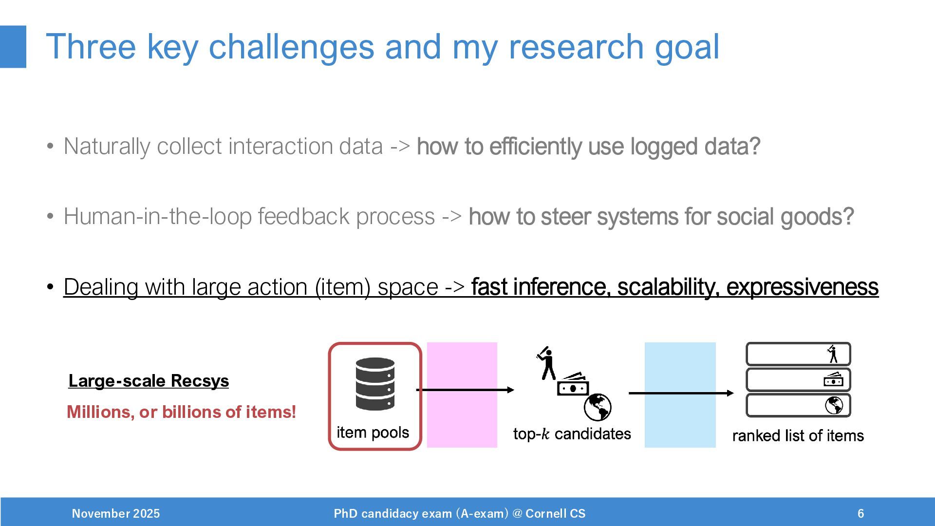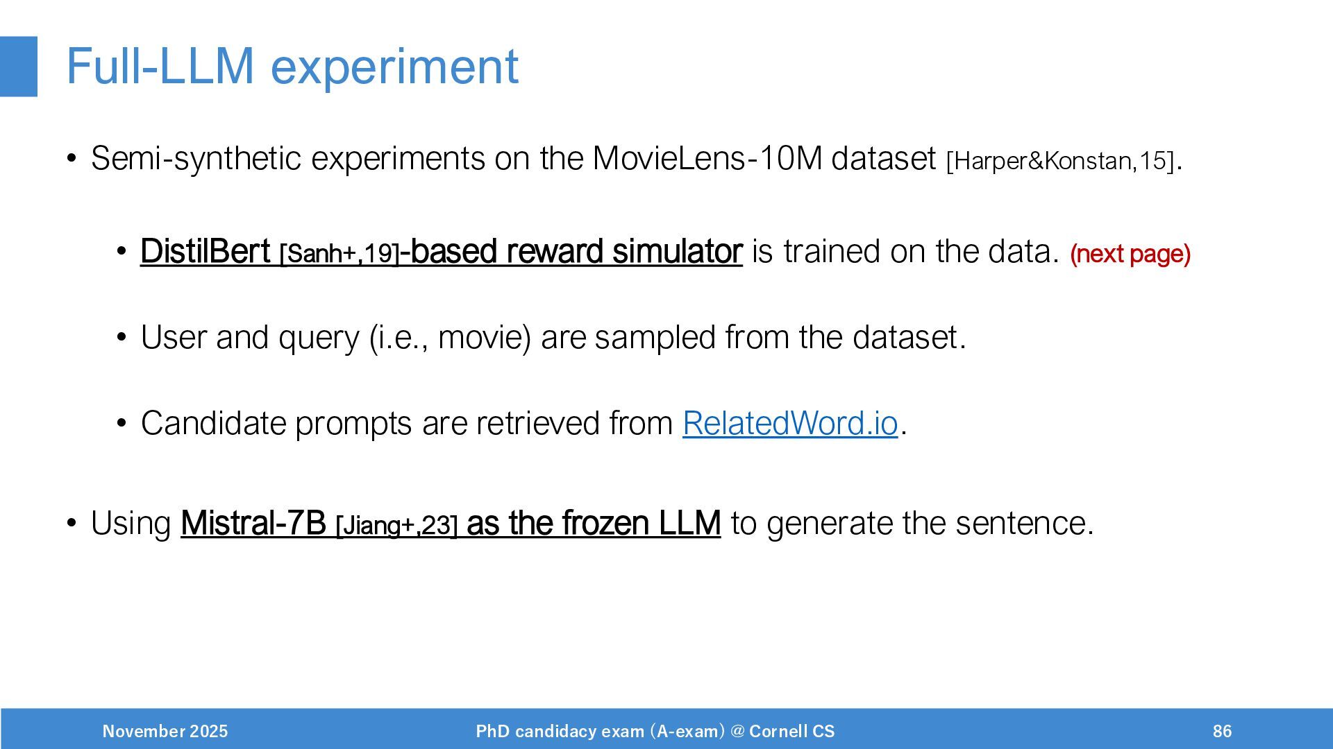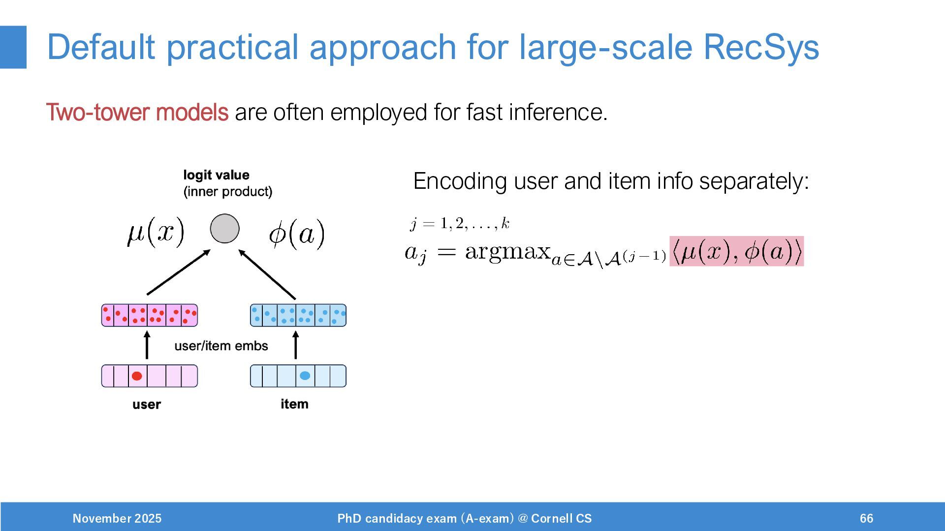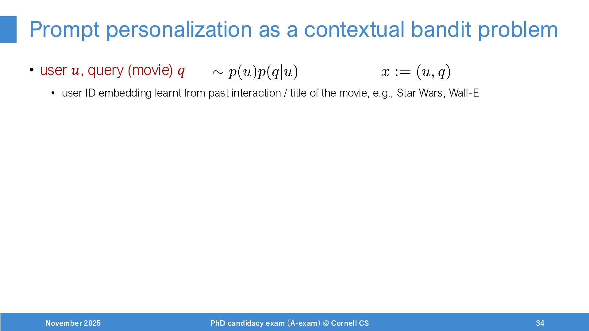NeurIPS, 1999. [Swaminathan&Joachims,16] Adith Swaminathan and Thorsten Joachims. Batch learning from logged bandit feedback through counterfactual risk minimization. JMLR, 2016. [Dudík+,11] Miroslav Dudík, John Langford, and Lihong Li. Doubly robust policy evaluation and learning. ICML, 2011. [Saito+,24] Yuta Saito, Jihan Yao, and Thorsten Joachims. Potec: Off-policy learning for large action spaces via two-stage policy decomposition. 2024. [Brown+,20] Tom Brown, Benjamin Mann, Nick Ryder, Melanie Subbiah, Jared Kaplan, Prafulla Dhariwal, Arvind Neelakantan, Pranav Shyam, Girish Sastry, Amanda Askell, Sandhini Agarwal, Ariel Herbert-Voss, Gretchen Krueger, Tom Henighan, Rewon Child, Aditya Ramesh, Daniel M. Ziegler, Jeffrey Wu, Clemens Winter, Christopher Hesse, Mark Chen, Eric Sigler, Mateusz Litwin, Scott Gray, Benjamin Chess, Jack Clark, Christopher Berner, Sam McCandlish, Alec Radford, Ilya Sutskever, and Dario Amodei. Language models are few-shot learners. NeurIPS, 2020. November 2025 PhD candidacy exam (A-exam) @ Cornell CS 100