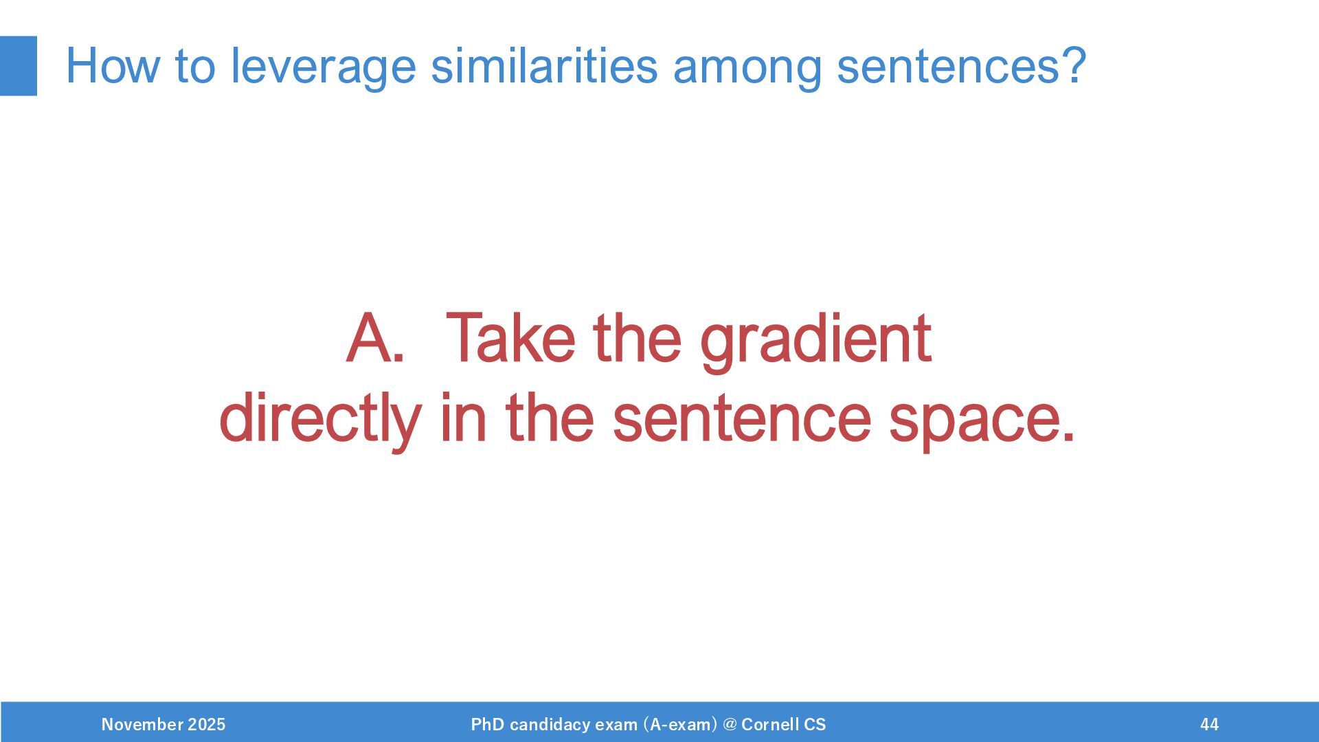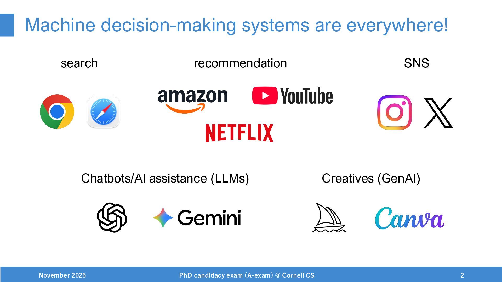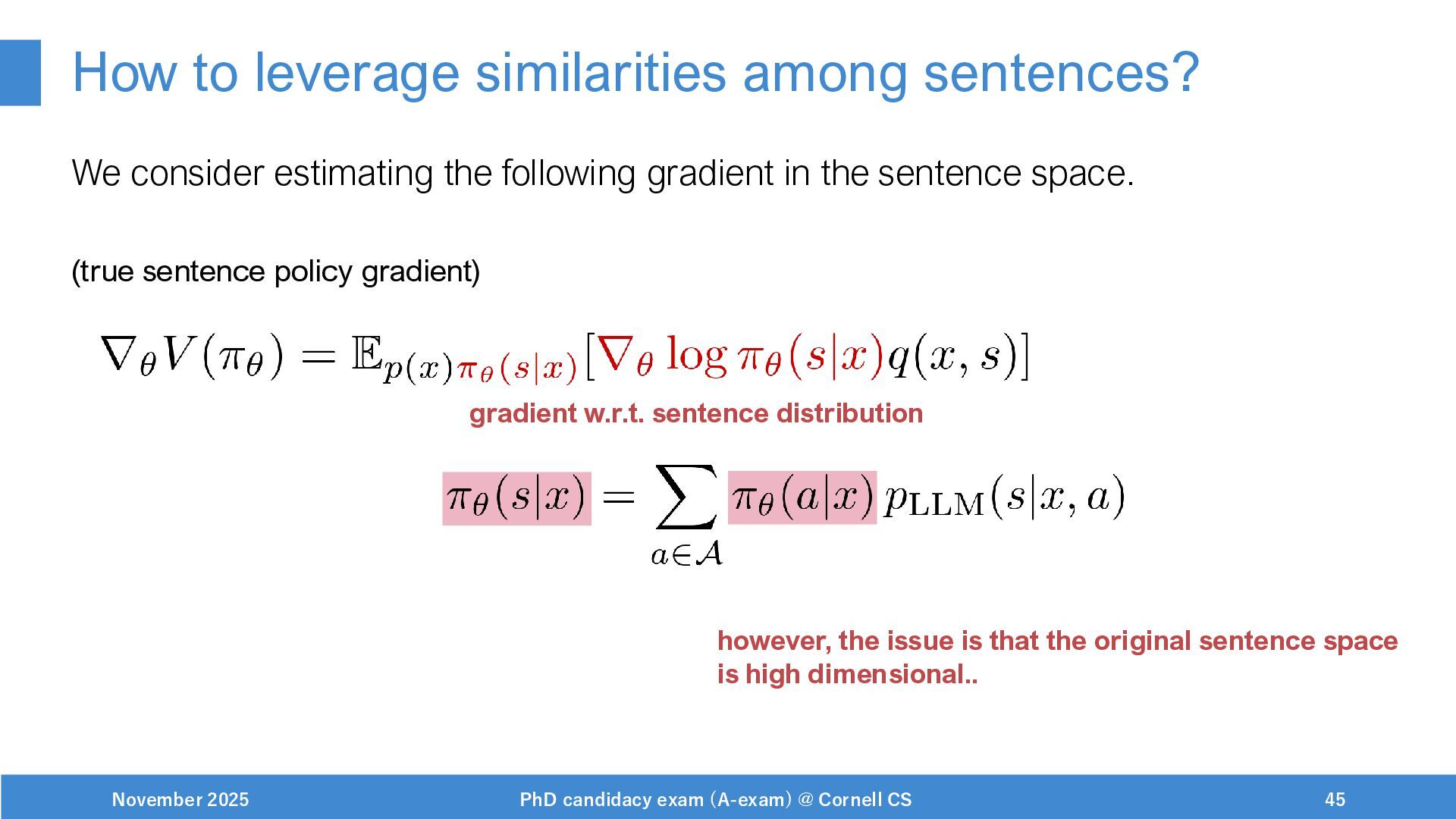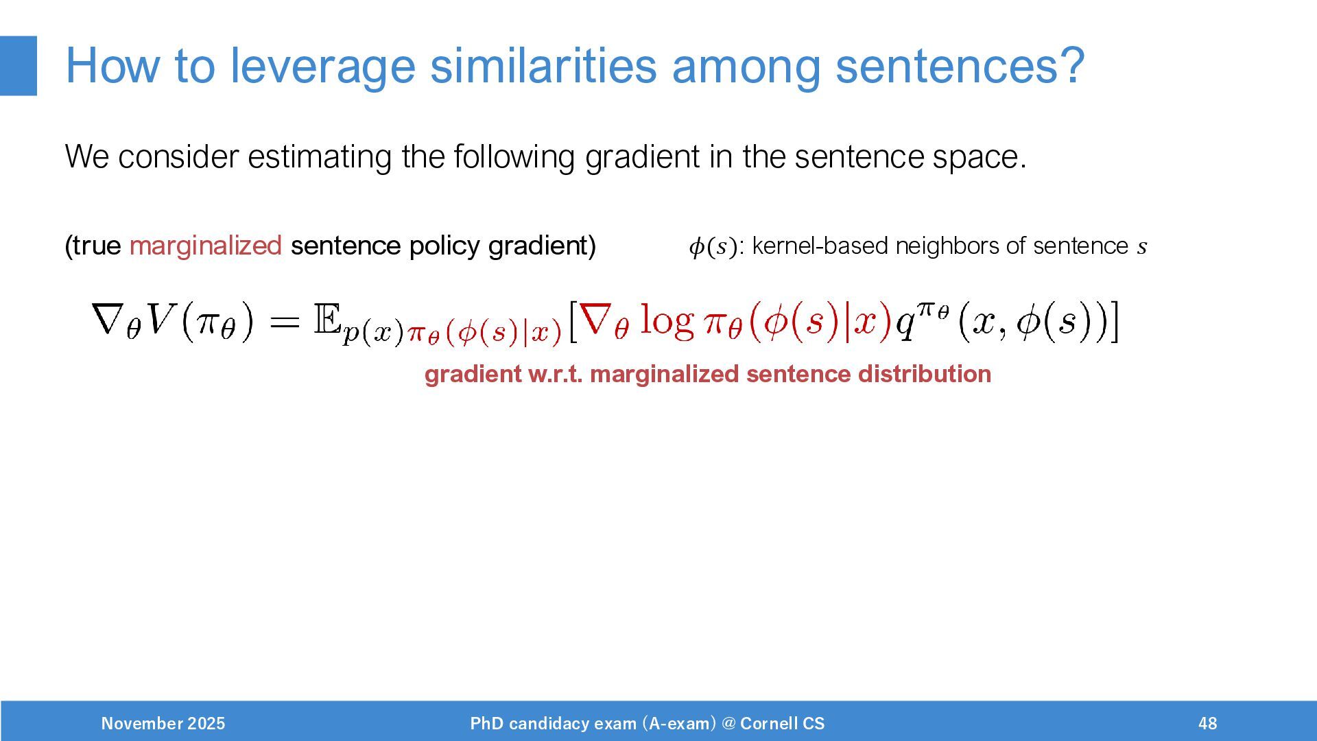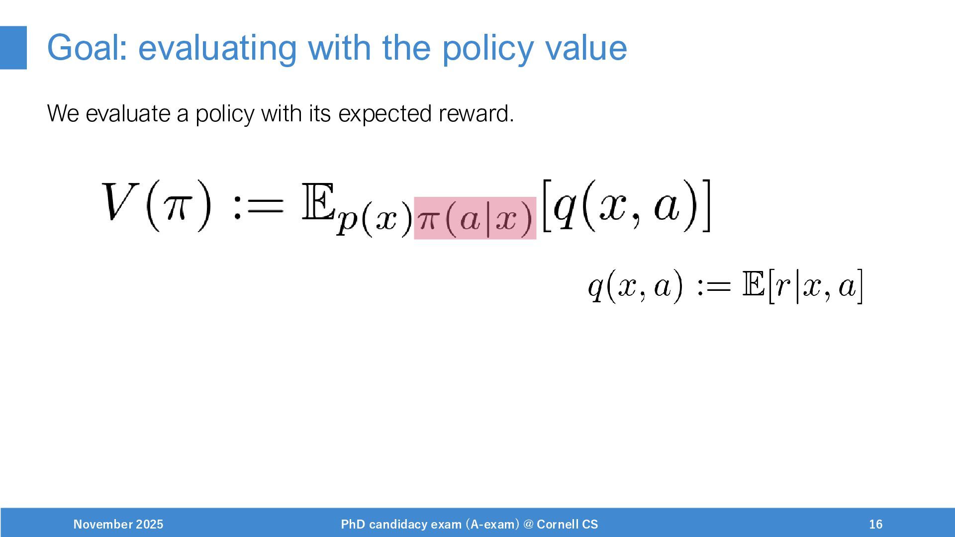 NeurIPS, 1999. [Swaminathan&Joachims,16] Adith Swaminathan and Thorsten Joachims. Batch learning from logged bandit feedback through counterfactual risk minimization. JMLR, 2016. [Dudík+,11] Miroslav Dudík, John Langford, and Lihong Li. Doubly robust policy evaluation and learning. ICML, 2011. [Saito+,24] Yuta Saito, Jihan Yao, and Thorsten Joachims. Potec: Off-policy learning for large action spaces via two-stage policy decomposition. 2024. [Brown+,20] Tom Brown, Benjamin Mann, Nick Ryder, Melanie Subbiah, Jared Kaplan, Prafulla Dhariwal, Arvind Neelakantan, Pranav Shyam, Girish Sastry, Amanda Askell, Sandhini Agarwal, Ariel Herbert-Voss, Gretchen Krueger, Tom Henighan, Rewon Child, Aditya Ramesh, Daniel M. Ziegler, Jeffrey Wu, Clemens Winter, Christopher Hesse, Mark Chen, Eric Sigler, Mateusz Litwin, Scott Gray, Benjamin Chess, Jack Clark, Christopher Berner, Sam McCandlish, Alec Radford, Ilya Sutskever, and Dario Amodei. Language models are few-shot learners. NeurIPS, 2020. November 2025 PhD candidacy exam (A-exam) @ Cornell CS 100