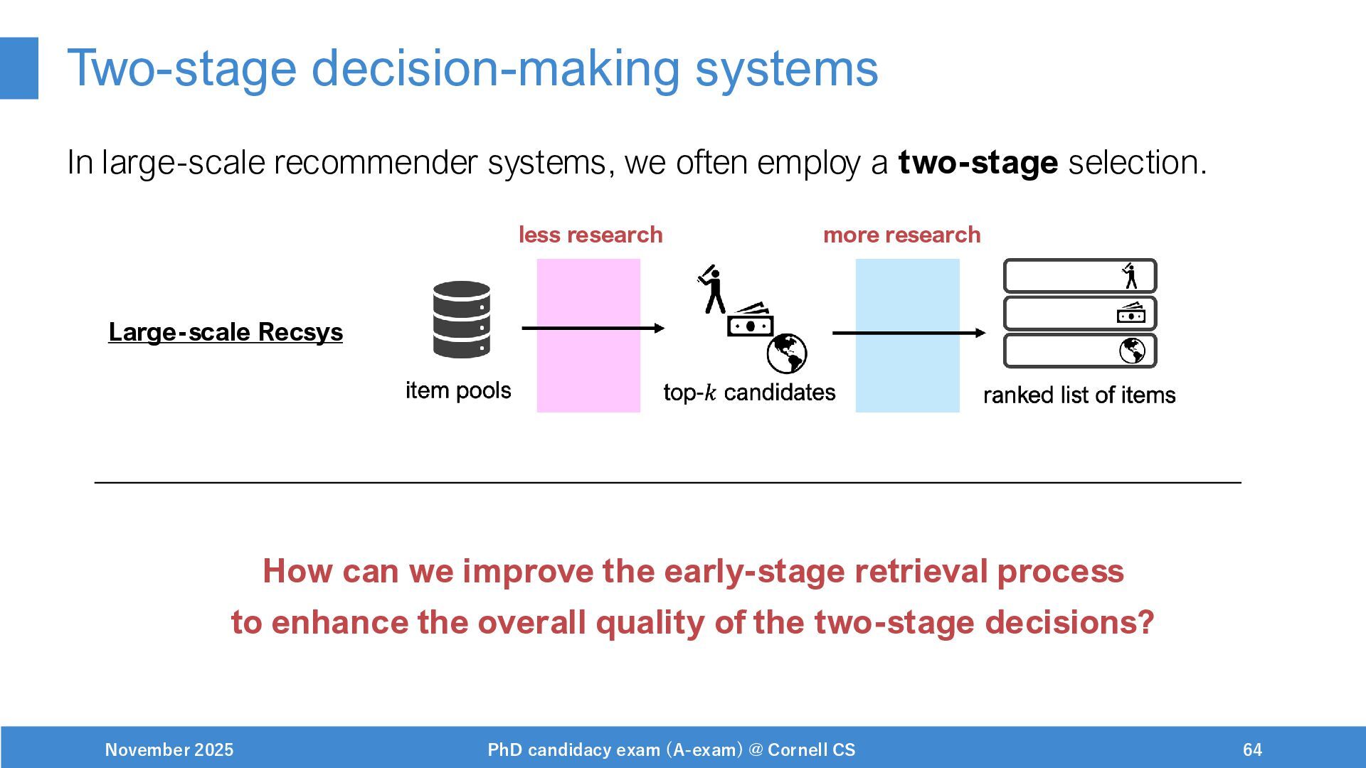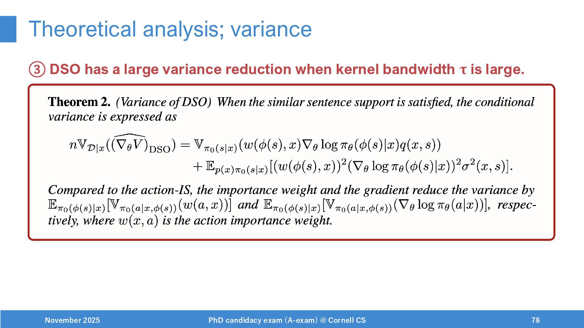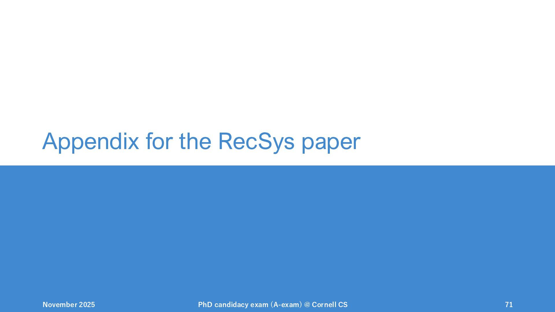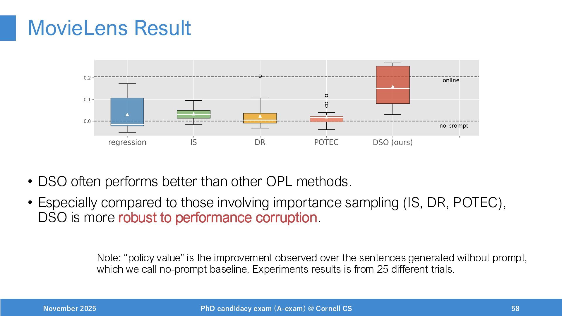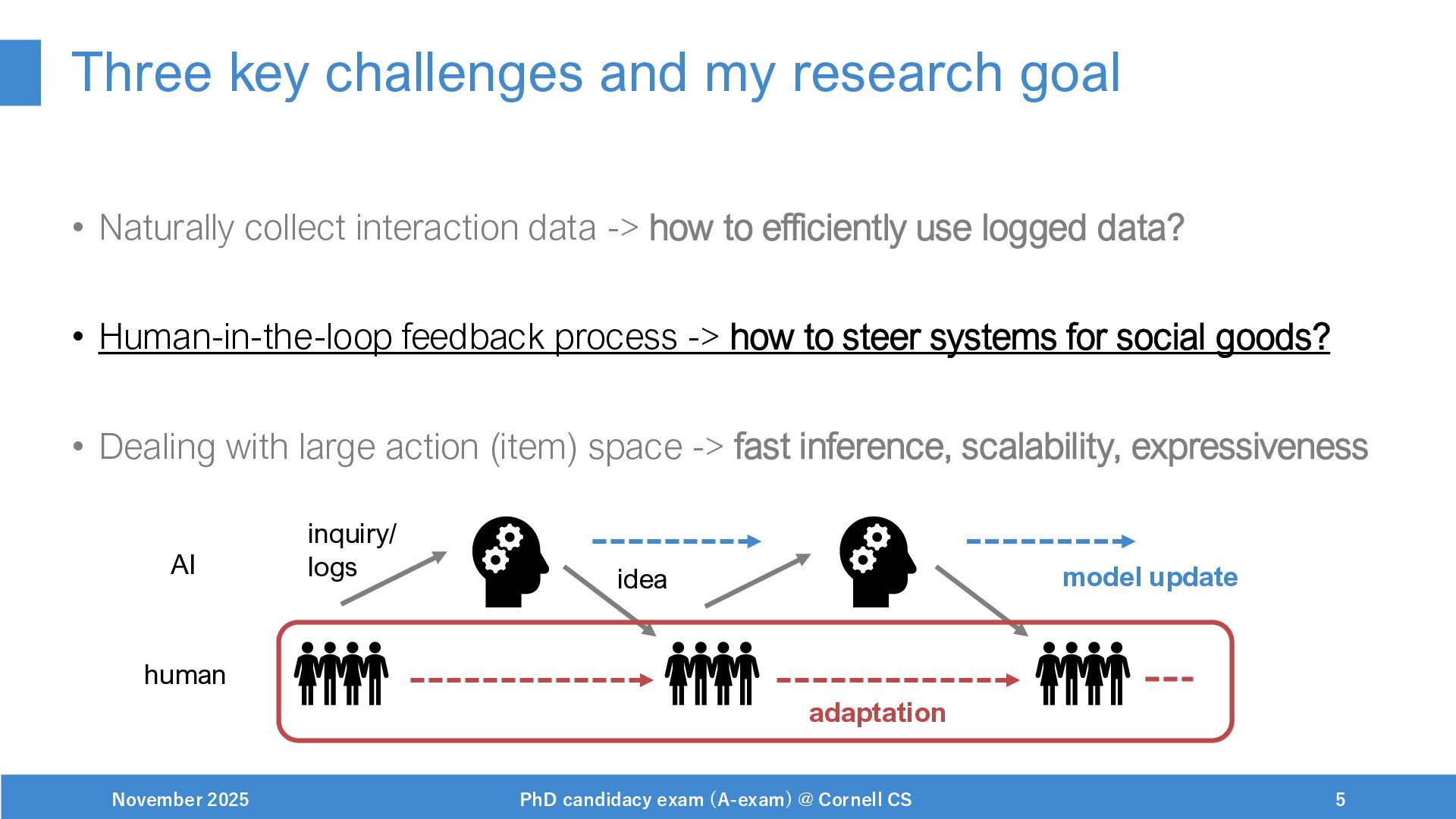 NeurIPS, 1999. [Swaminathan&Joachims,16] Adith Swaminathan and Thorsten Joachims. Batch learning from logged bandit feedback through counterfactual risk minimization. JMLR, 2016. [Dudík+,11] Miroslav Dudík, John Langford, and Lihong Li. Doubly robust policy evaluation and learning. ICML, 2011. [Saito+,24] Yuta Saito, Jihan Yao, and Thorsten Joachims. Potec: Off-policy learning for large action spaces via two-stage policy decomposition. 2024. [Brown+,20] Tom Brown, Benjamin Mann, Nick Ryder, Melanie Subbiah, Jared Kaplan, Prafulla Dhariwal, Arvind Neelakantan, Pranav Shyam, Girish Sastry, Amanda Askell, Sandhini Agarwal, Ariel Herbert-Voss, Gretchen Krueger, Tom Henighan, Rewon Child, Aditya Ramesh, Daniel M. Ziegler, Jeffrey Wu, Clemens Winter, Christopher Hesse, Mark Chen, Eric Sigler, Mateusz Litwin, Scott Gray, Benjamin Chess, Jack Clark, Christopher Berner, Sam McCandlish, Alec Radford, Ilya Sutskever, and Dario Amodei. Language models are few-shot learners. NeurIPS, 2020. November 2025 PhD candidacy exam (A-exam) @ Cornell CS 100