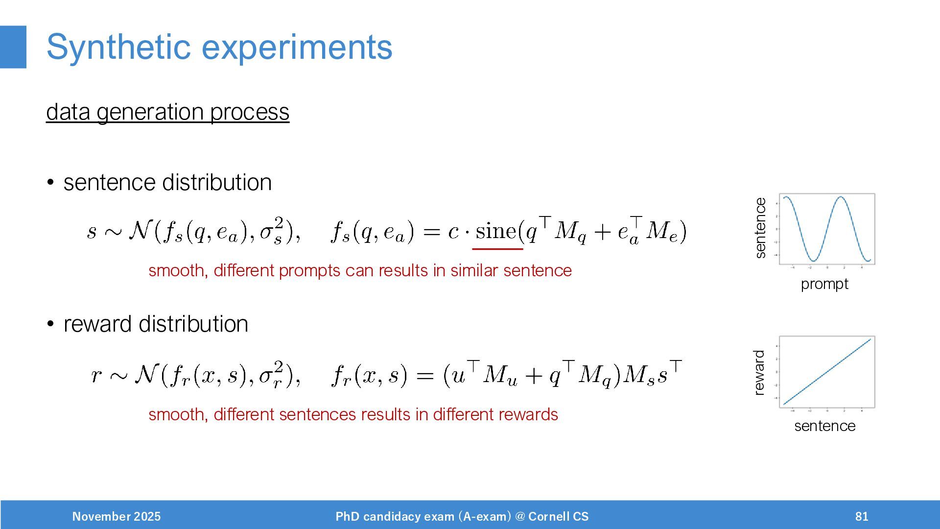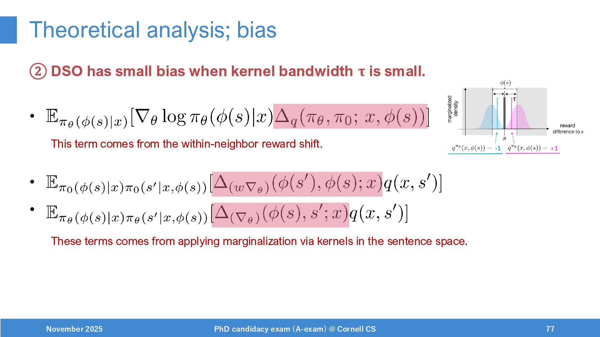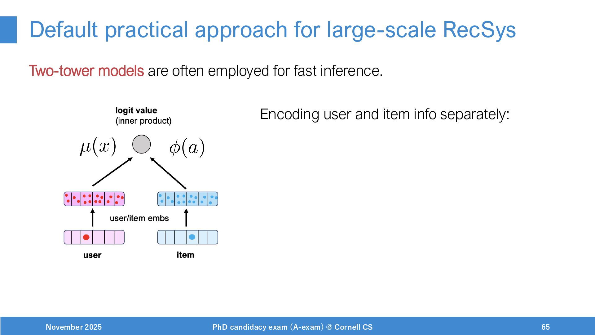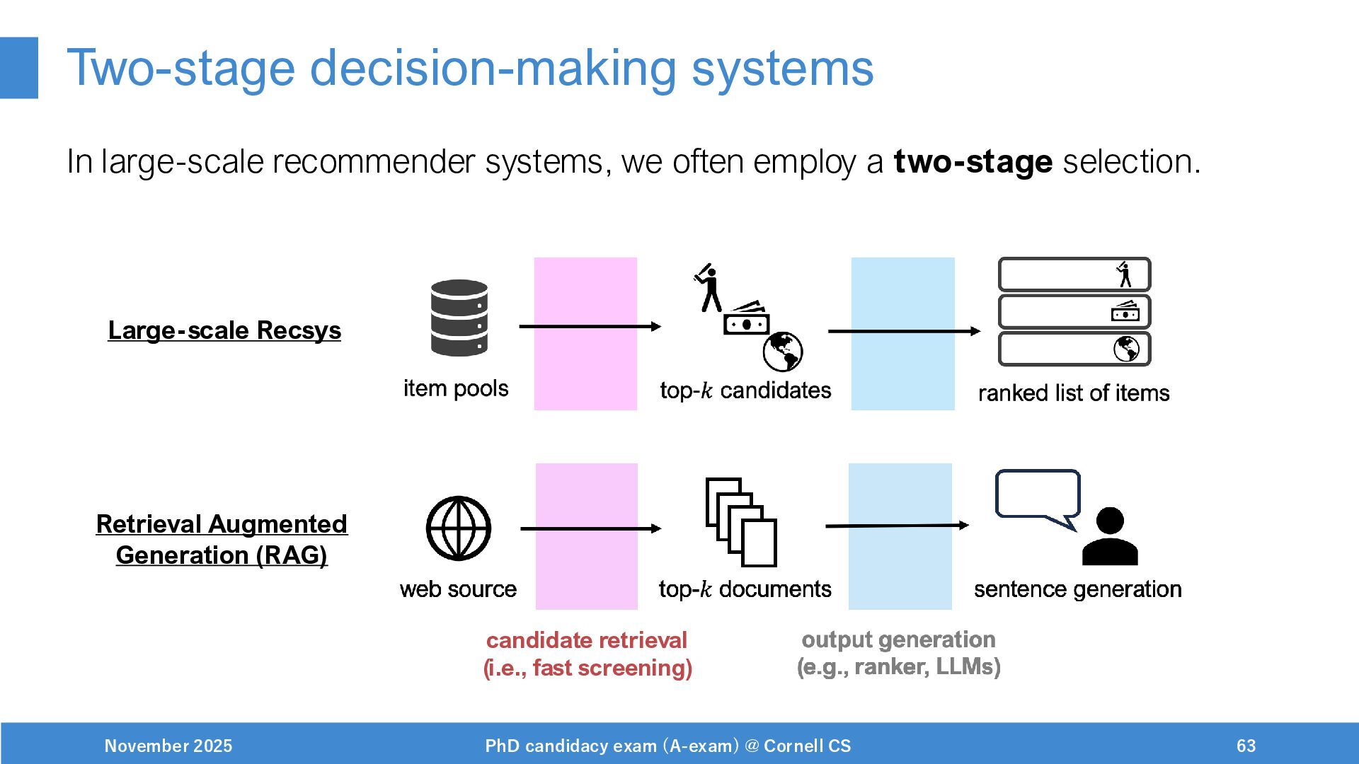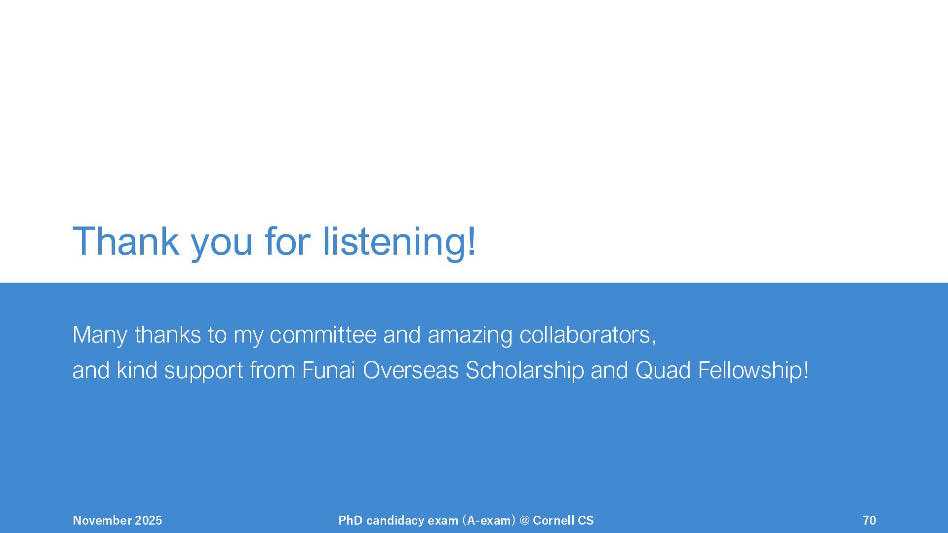 NeurIPS, 1999. [Swaminathan&Joachims,16] Adith Swaminathan and Thorsten Joachims. Batch learning from logged bandit feedback through counterfactual risk minimization. JMLR, 2016. [Dudík+,11] Miroslav Dudík, John Langford, and Lihong Li. Doubly robust policy evaluation and learning. ICML, 2011. [Saito+,24] Yuta Saito, Jihan Yao, and Thorsten Joachims. Potec: Off-policy learning for large action spaces via two-stage policy decomposition. 2024. [Brown+,20] Tom Brown, Benjamin Mann, Nick Ryder, Melanie Subbiah, Jared Kaplan, Prafulla Dhariwal, Arvind Neelakantan, Pranav Shyam, Girish Sastry, Amanda Askell, Sandhini Agarwal, Ariel Herbert-Voss, Gretchen Krueger, Tom Henighan, Rewon Child, Aditya Ramesh, Daniel M. Ziegler, Jeffrey Wu, Clemens Winter, Christopher Hesse, Mark Chen, Eric Sigler, Mateusz Litwin, Scott Gray, Benjamin Chess, Jack Clark, Christopher Berner, Sam McCandlish, Alec Radford, Ilya Sutskever, and Dario Amodei. Language models are few-shot learners. NeurIPS, 2020. November 2025 PhD candidacy exam (A-exam) @ Cornell CS 100