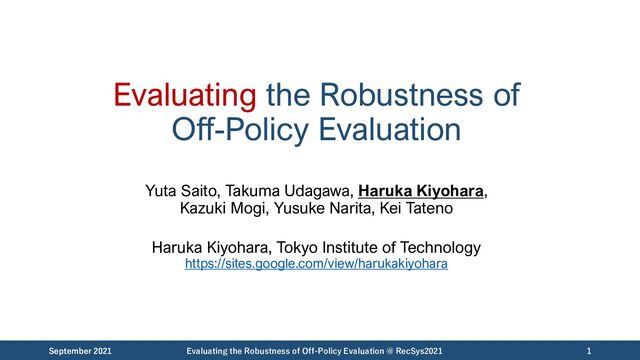 Lihong Li. Learning from Logged Implicit Exploration Data. NeurIPS, 2010. https://arxiv.org/abs/1003.0120 [Dudík+, 2014] Miroslav Dudík, Dumitru Erhan, John Langford, and Lihong Li. Doubly Robust Policy Evaluation and Optimization. Statistical Science, 2014. https://arxiv.org/abs/1503.02834 [Swaminathan & Joachims, 2015] Adith Swaminathan and Thorsten Joachims. The Self-Normalized Estimator for Counterfactual Learning. NeurIPS, 2015. https://dl.acm.org/doi/10.5555/2969442.2969600 [Wang+, 2017] Yu-Xiang Wang, Alekh Agarwal, and Miroslav Dudík. Optimal and Adaptive Off-policy Evaluation in Contextual Bandits. ICML, 2017. https://arxiv.org/abs/1612.01205 [Su+, 2020] Yi Su, Maria Dimakopoulou, Akshay Krishnamurthy, and Miroslav Dudík. Doubly Robust Off-policy Evaluation with Shrinkage. ICML, 2020. https://arxiv.org/abs/1907.09623 [Narita+, 2021] Yusuke Narita, Shota Yasui, Kohei Yata. Debiased Off-Policy Evaluation for Recommendation Systems. RecSys, 2021. https://arxiv.org/abs/2002.08536 September 2021 Evaluating the Robustness of Off-Policy Evaluation @ RecSys2021 24