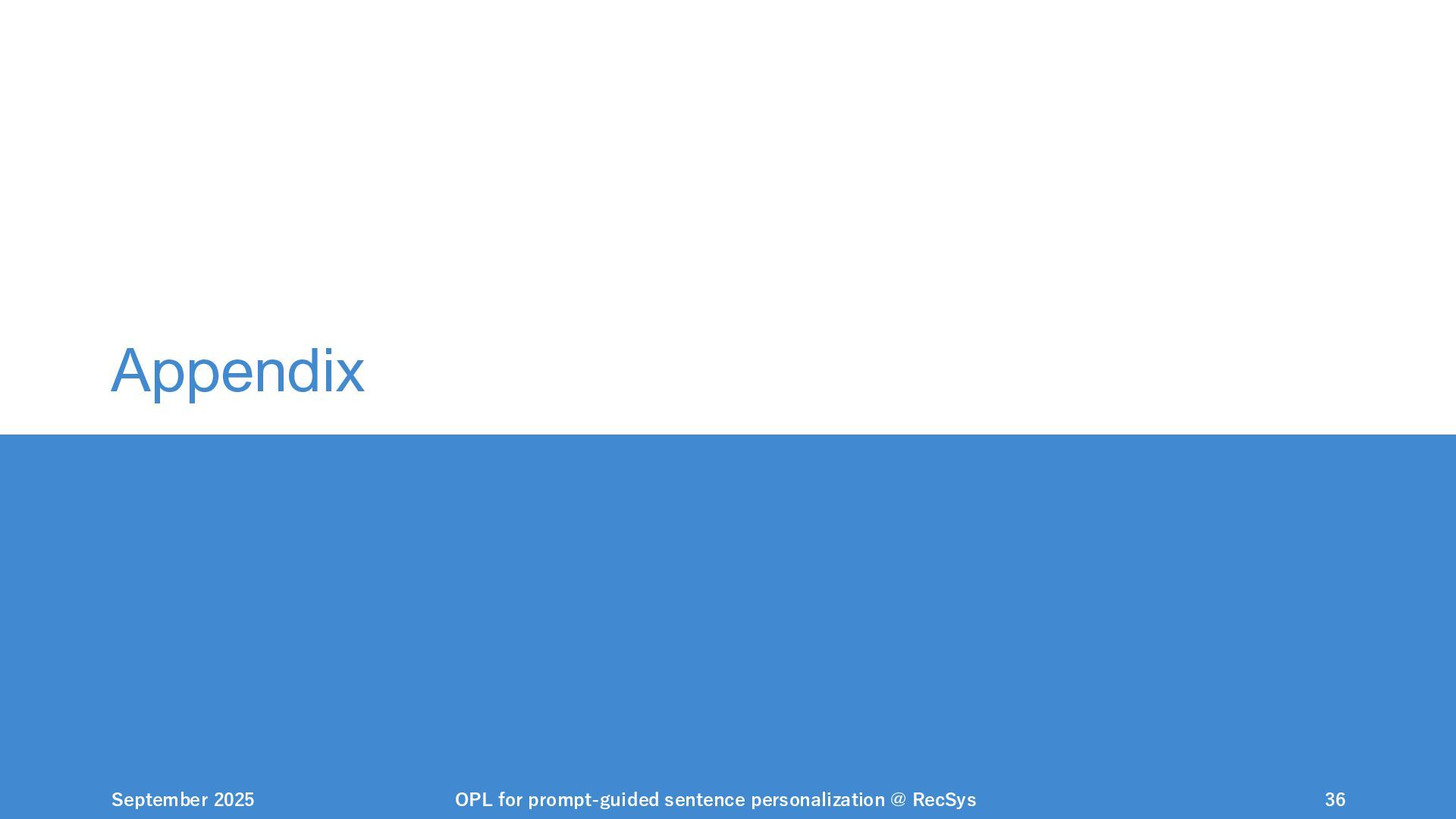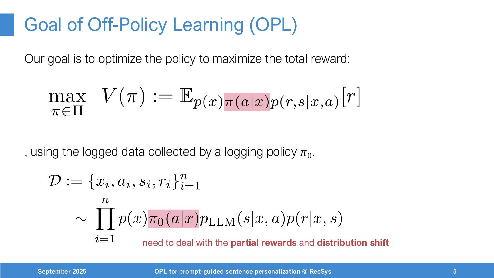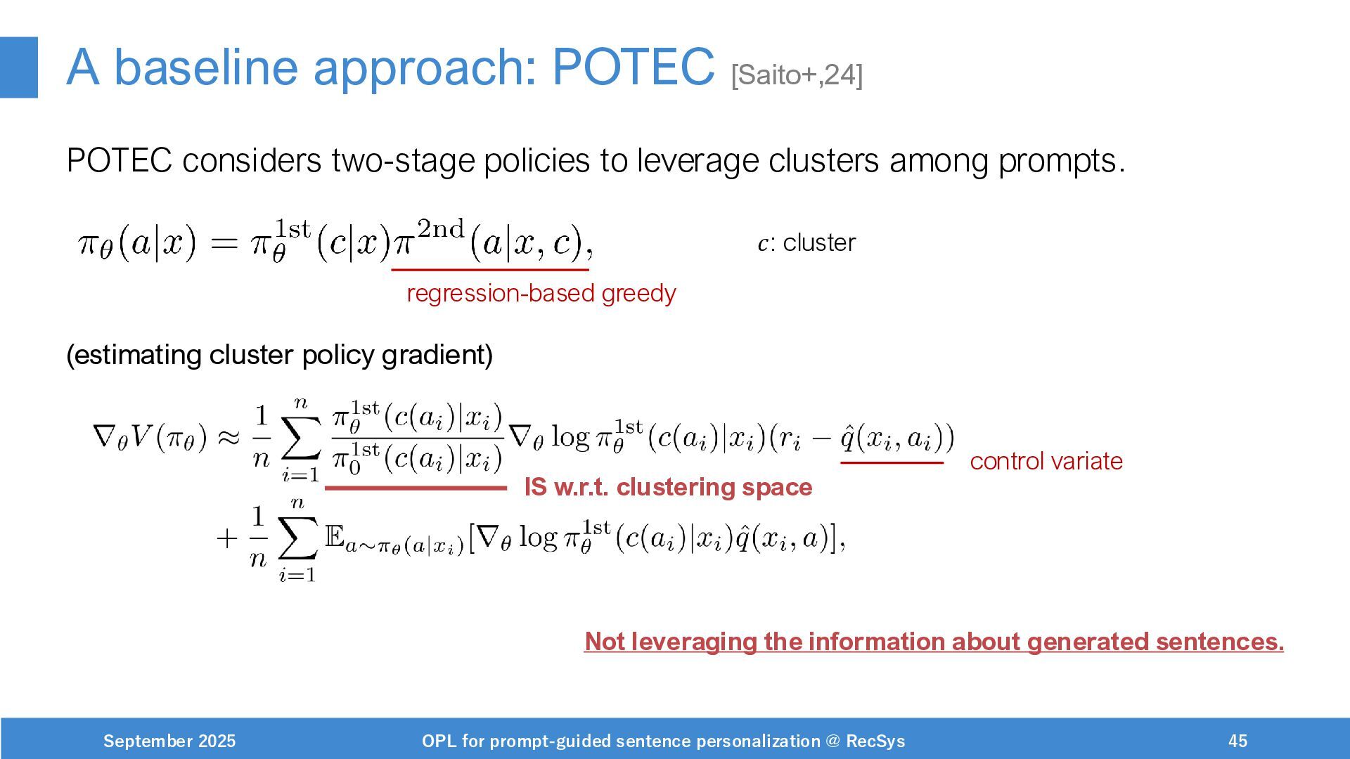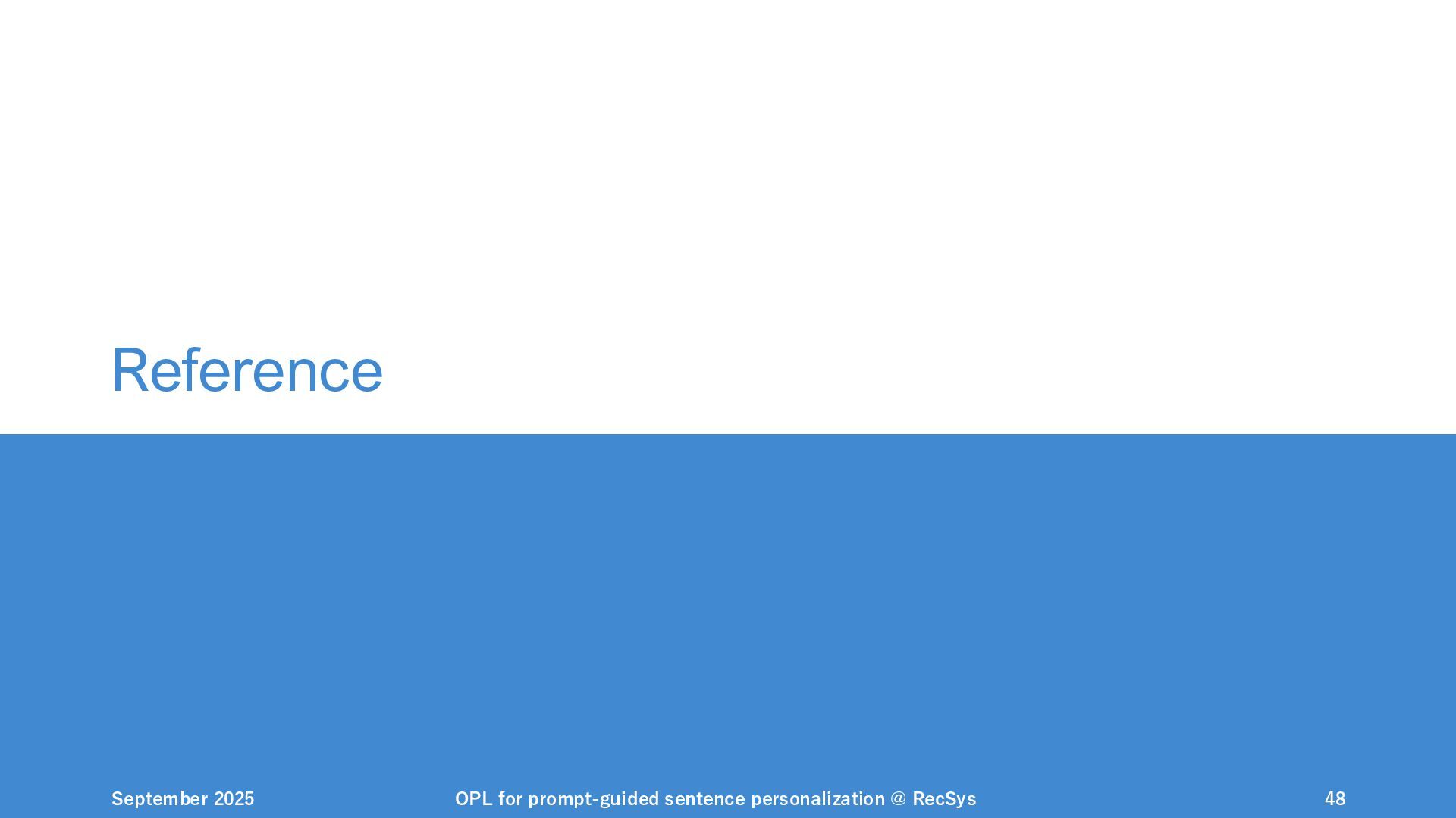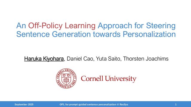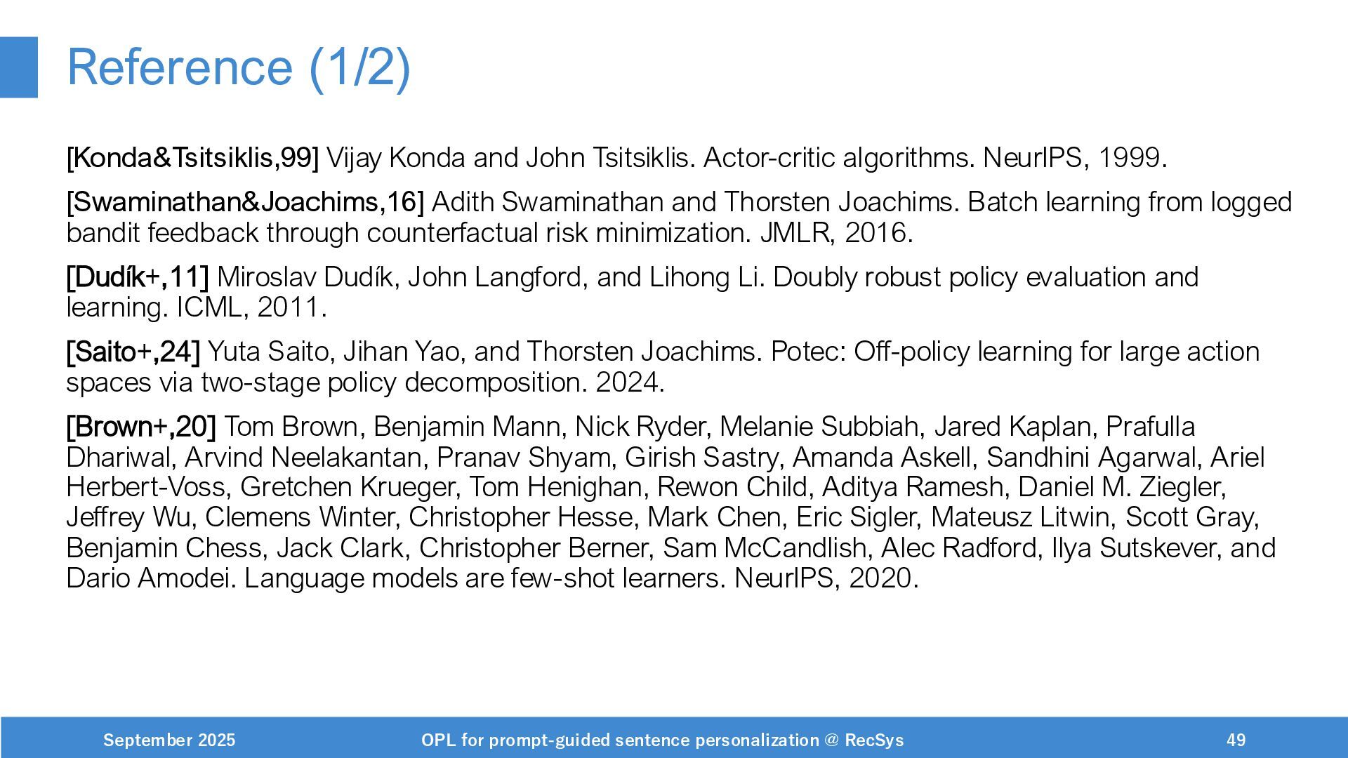 NeurIPS, 1999. [Swaminathan&Joachims,16] Adith Swaminathan and Thorsten Joachims. Batch learning from logged bandit feedback through counterfactual risk minimization. JMLR, 2016. [Dudík+,11] Miroslav Dudík, John Langford, and Lihong Li. Doubly robust policy evaluation and learning. ICML, 2011. [Saito+,24] Yuta Saito, Jihan Yao, and Thorsten Joachims. Potec: Off-policy learning for large action spaces via two-stage policy decomposition. 2024. [Brown+,20] Tom Brown, Benjamin Mann, Nick Ryder, Melanie Subbiah, Jared Kaplan, Prafulla Dhariwal, Arvind Neelakantan, Pranav Shyam, Girish Sastry, Amanda Askell, Sandhini Agarwal, Ariel Herbert-Voss, Gretchen Krueger, Tom Henighan, Rewon Child, Aditya Ramesh, Daniel M. Ziegler, Jeffrey Wu, Clemens Winter, Christopher Hesse, Mark Chen, Eric Sigler, Mateusz Litwin, Scott Gray, Benjamin Chess, Jack Clark, Christopher Berner, Sam McCandlish, Alec Radford, Ilya Sutskever, and Dario Amodei. Language models are few-shot learners. NeurIPS, 2020. September 2025 OPL for prompt-guided sentence personalization @ RecSys 49