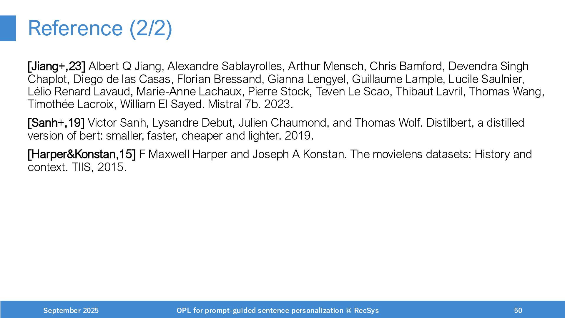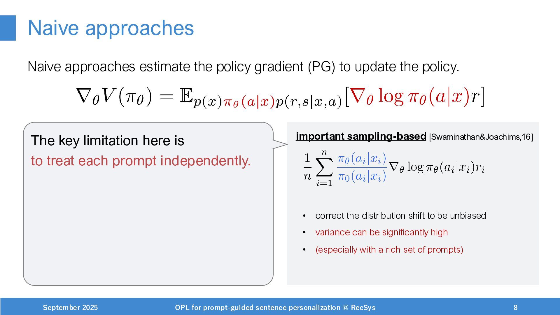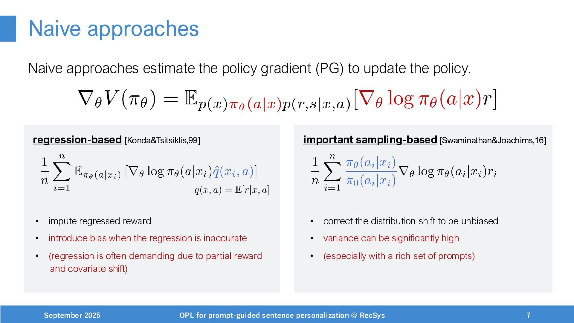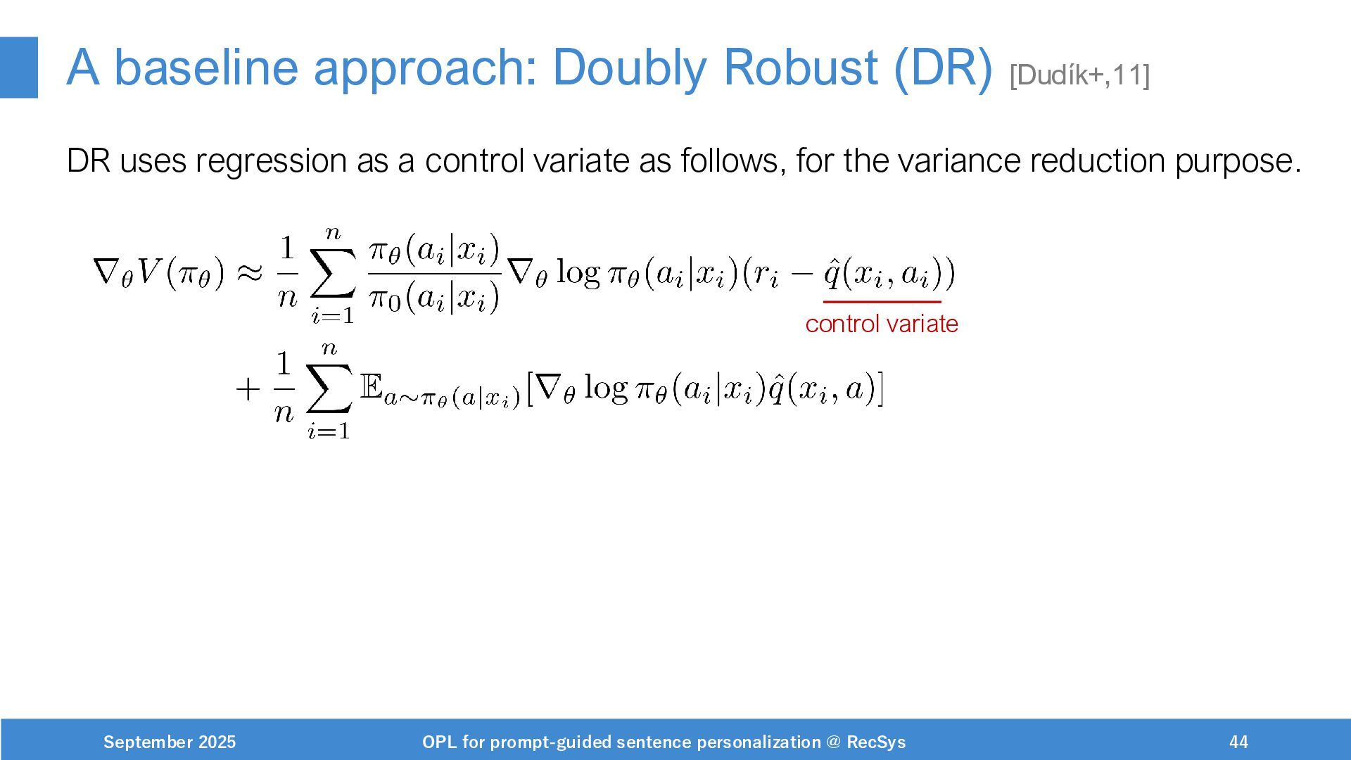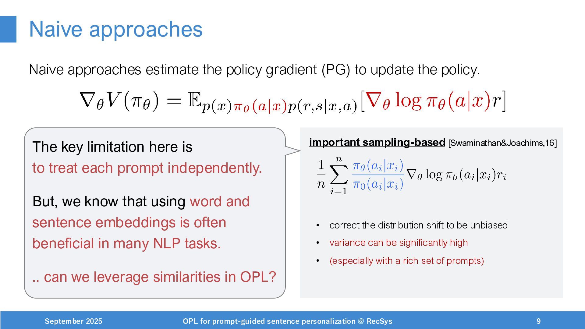 NeurIPS, 1999. [Swaminathan&Joachims,16] Adith Swaminathan and Thorsten Joachims. Batch learning from logged bandit feedback through counterfactual risk minimization. JMLR, 2016. [Dudík+,11] Miroslav Dudík, John Langford, and Lihong Li. Doubly robust policy evaluation and learning. ICML, 2011. [Saito+,24] Yuta Saito, Jihan Yao, and Thorsten Joachims. Potec: Off-policy learning for large action spaces via two-stage policy decomposition. 2024. [Brown+,20] Tom Brown, Benjamin Mann, Nick Ryder, Melanie Subbiah, Jared Kaplan, Prafulla Dhariwal, Arvind Neelakantan, Pranav Shyam, Girish Sastry, Amanda Askell, Sandhini Agarwal, Ariel Herbert-Voss, Gretchen Krueger, Tom Henighan, Rewon Child, Aditya Ramesh, Daniel M. Ziegler, Jeffrey Wu, Clemens Winter, Christopher Hesse, Mark Chen, Eric Sigler, Mateusz Litwin, Scott Gray, Benjamin Chess, Jack Clark, Christopher Berner, Sam McCandlish, Alec Radford, Ilya Sutskever, and Dario Amodei. Language models are few-shot learners. NeurIPS, 2020. September 2025 OPL for prompt-guided sentence personalization @ RecSys 49
