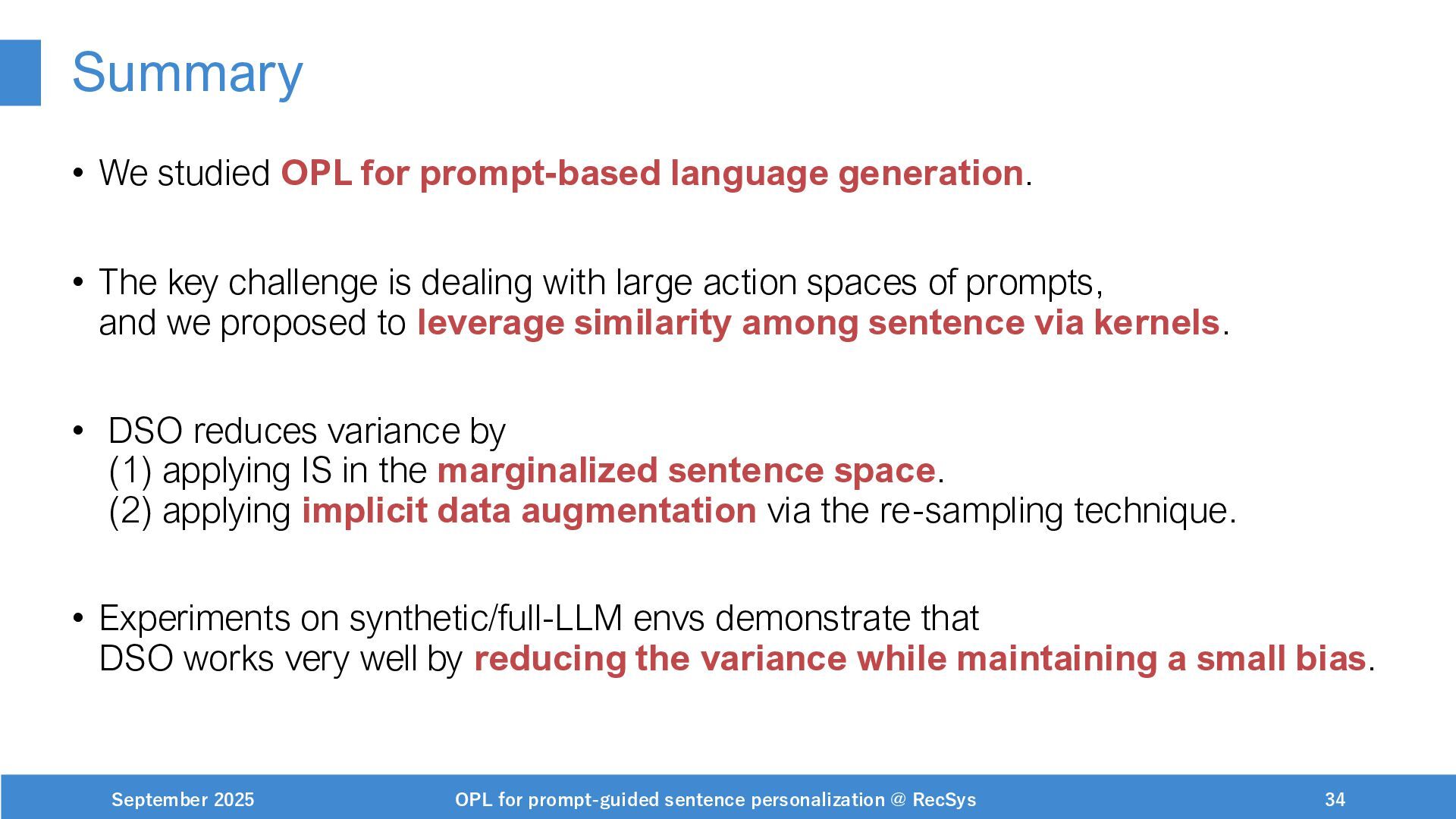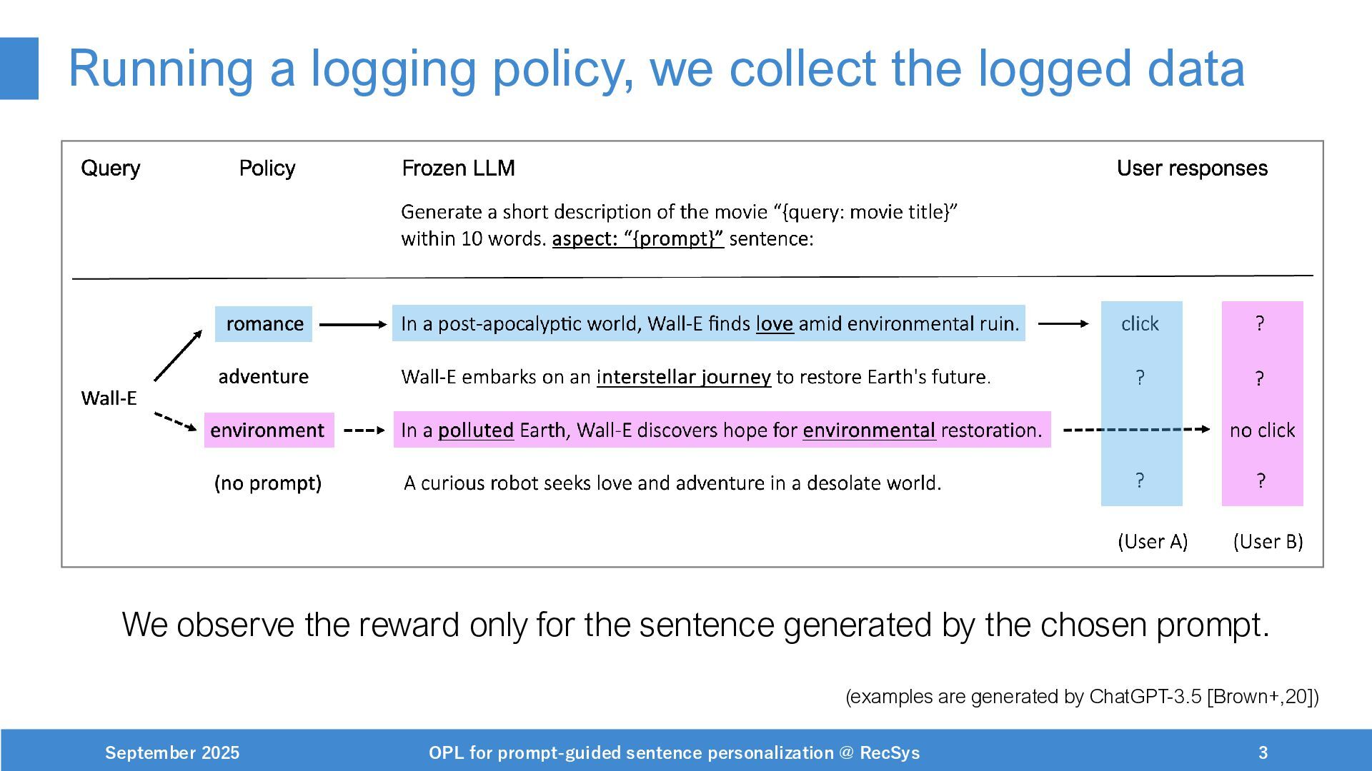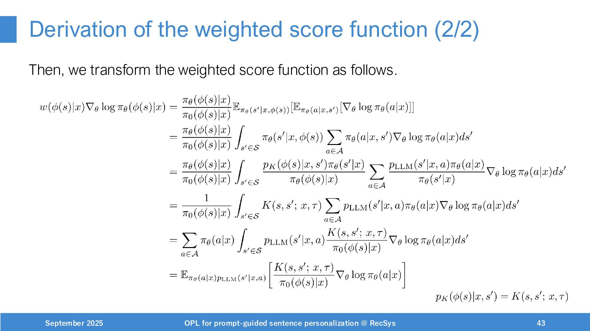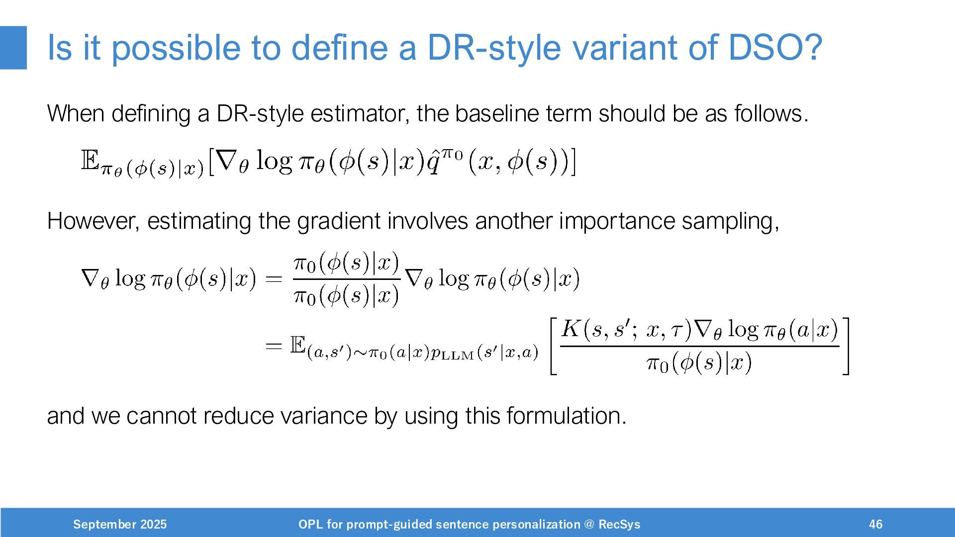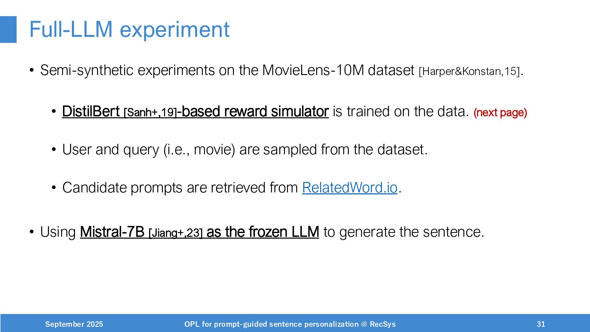 NeurIPS, 1999. [Swaminathan&Joachims,16] Adith Swaminathan and Thorsten Joachims. Batch learning from logged bandit feedback through counterfactual risk minimization. JMLR, 2016. [Dudík+,11] Miroslav Dudík, John Langford, and Lihong Li. Doubly robust policy evaluation and learning. ICML, 2011. [Saito+,24] Yuta Saito, Jihan Yao, and Thorsten Joachims. Potec: Off-policy learning for large action spaces via two-stage policy decomposition. 2024. [Brown+,20] Tom Brown, Benjamin Mann, Nick Ryder, Melanie Subbiah, Jared Kaplan, Prafulla Dhariwal, Arvind Neelakantan, Pranav Shyam, Girish Sastry, Amanda Askell, Sandhini Agarwal, Ariel Herbert-Voss, Gretchen Krueger, Tom Henighan, Rewon Child, Aditya Ramesh, Daniel M. Ziegler, Jeffrey Wu, Clemens Winter, Christopher Hesse, Mark Chen, Eric Sigler, Mateusz Litwin, Scott Gray, Benjamin Chess, Jack Clark, Christopher Berner, Sam McCandlish, Alec Radford, Ilya Sutskever, and Dario Amodei. Language models are few-shot learners. NeurIPS, 2020. September 2025 OPL for prompt-guided sentence personalization @ RecSys 49