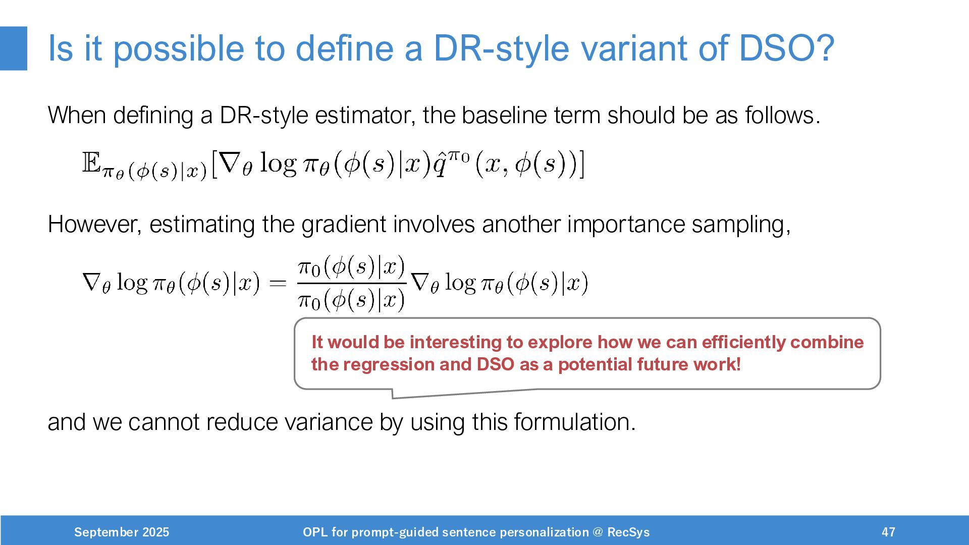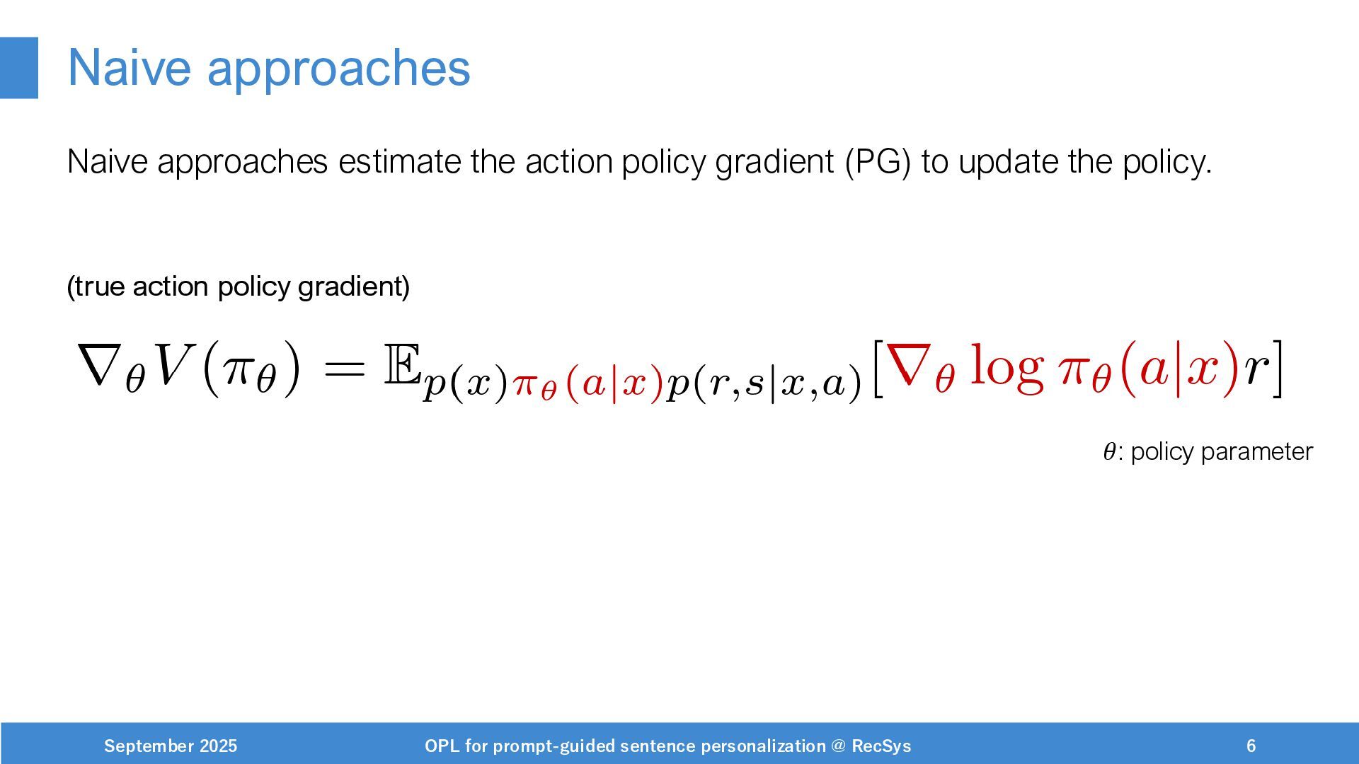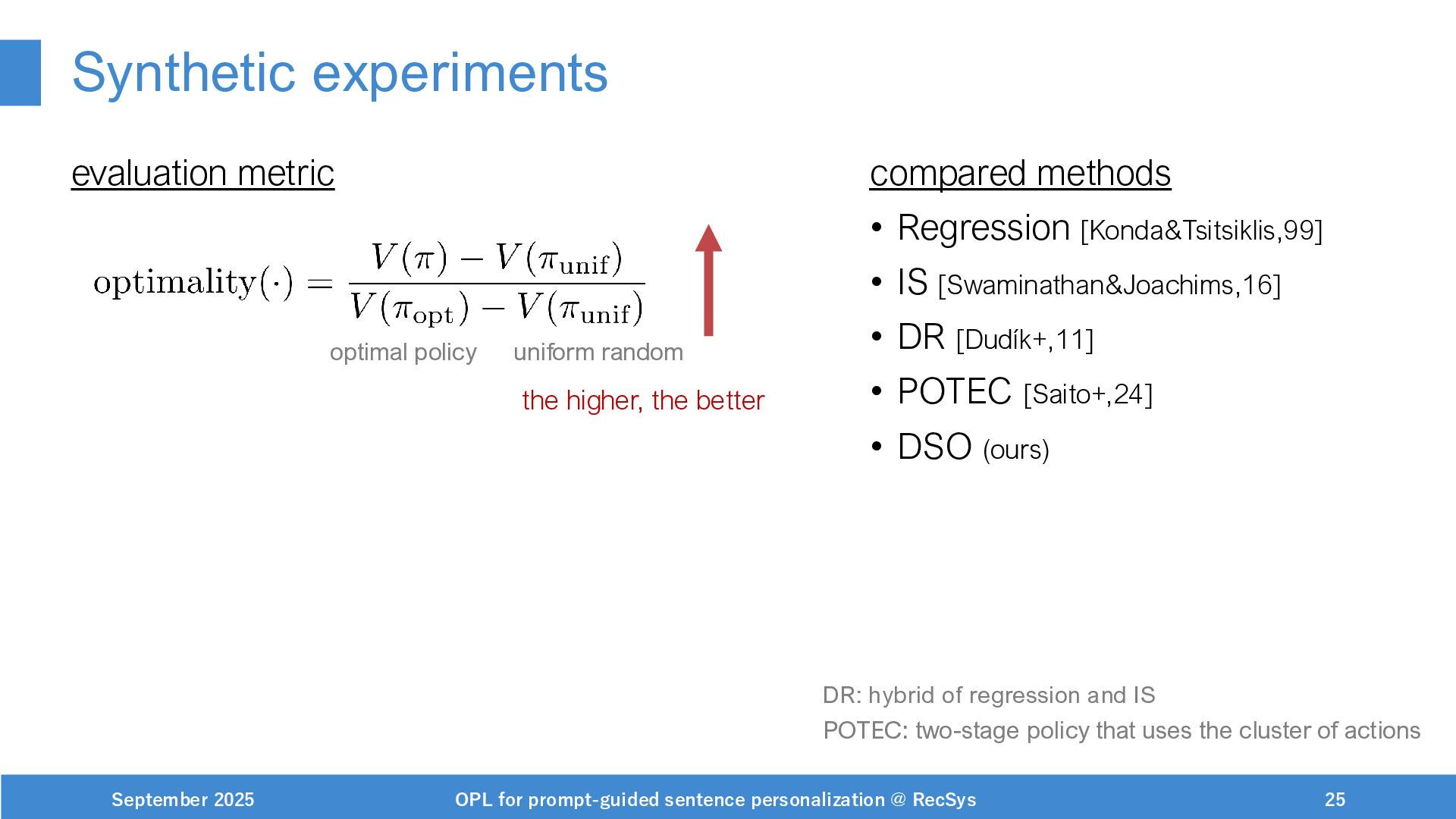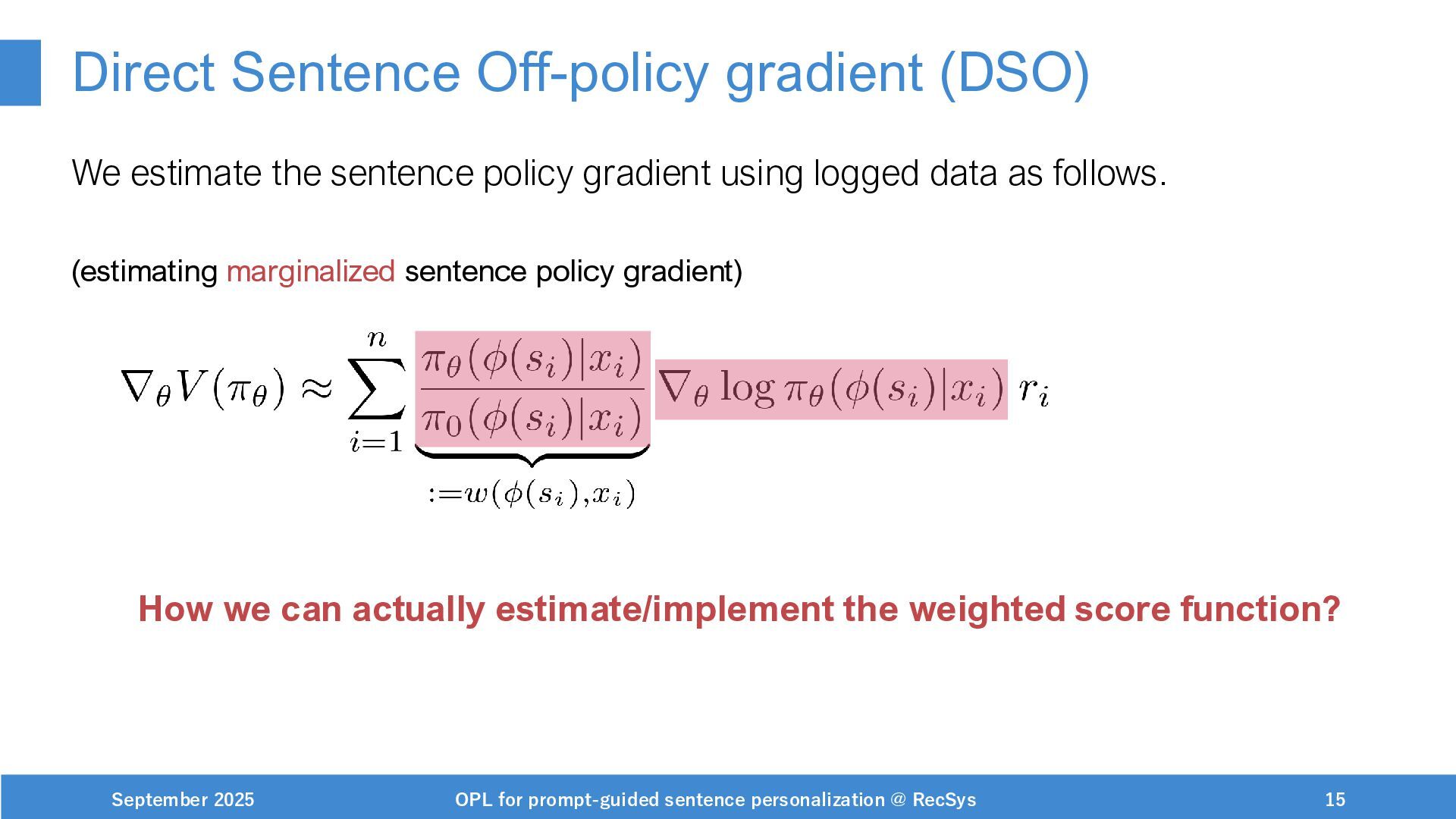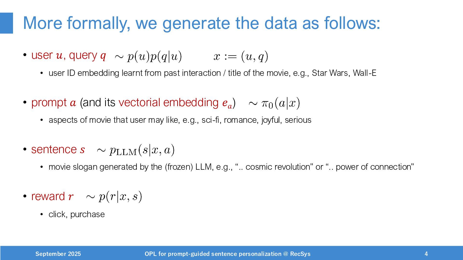 NeurIPS, 1999. [Swaminathan&Joachims,16] Adith Swaminathan and Thorsten Joachims. Batch learning from logged bandit feedback through counterfactual risk minimization. JMLR, 2016. [Dudík+,11] Miroslav Dudík, John Langford, and Lihong Li. Doubly robust policy evaluation and learning. ICML, 2011. [Saito+,24] Yuta Saito, Jihan Yao, and Thorsten Joachims. Potec: Off-policy learning for large action spaces via two-stage policy decomposition. 2024. [Brown+,20] Tom Brown, Benjamin Mann, Nick Ryder, Melanie Subbiah, Jared Kaplan, Prafulla Dhariwal, Arvind Neelakantan, Pranav Shyam, Girish Sastry, Amanda Askell, Sandhini Agarwal, Ariel Herbert-Voss, Gretchen Krueger, Tom Henighan, Rewon Child, Aditya Ramesh, Daniel M. Ziegler, Jeffrey Wu, Clemens Winter, Christopher Hesse, Mark Chen, Eric Sigler, Mateusz Litwin, Scott Gray, Benjamin Chess, Jack Clark, Christopher Berner, Sam McCandlish, Alec Radford, Ilya Sutskever, and Dario Amodei. Language models are few-shot learners. NeurIPS, 2020. September 2025 OPL for prompt-guided sentence personalization @ RecSys 49