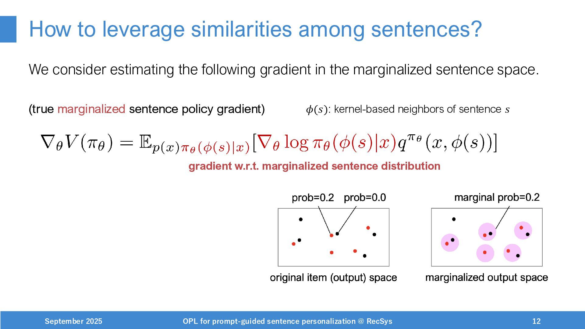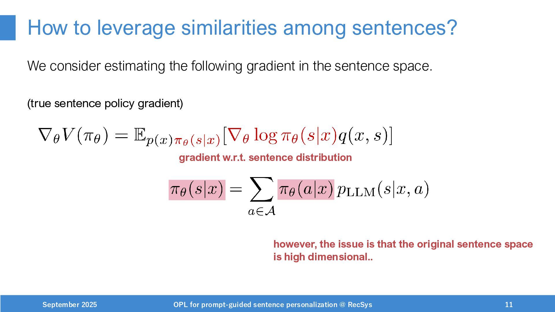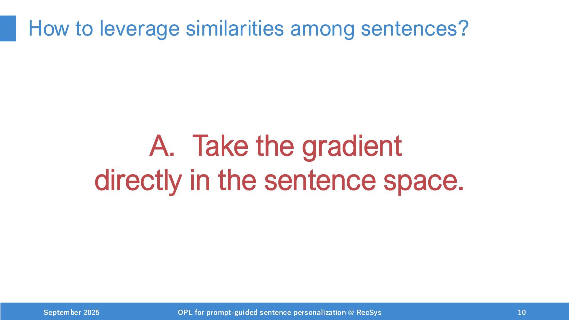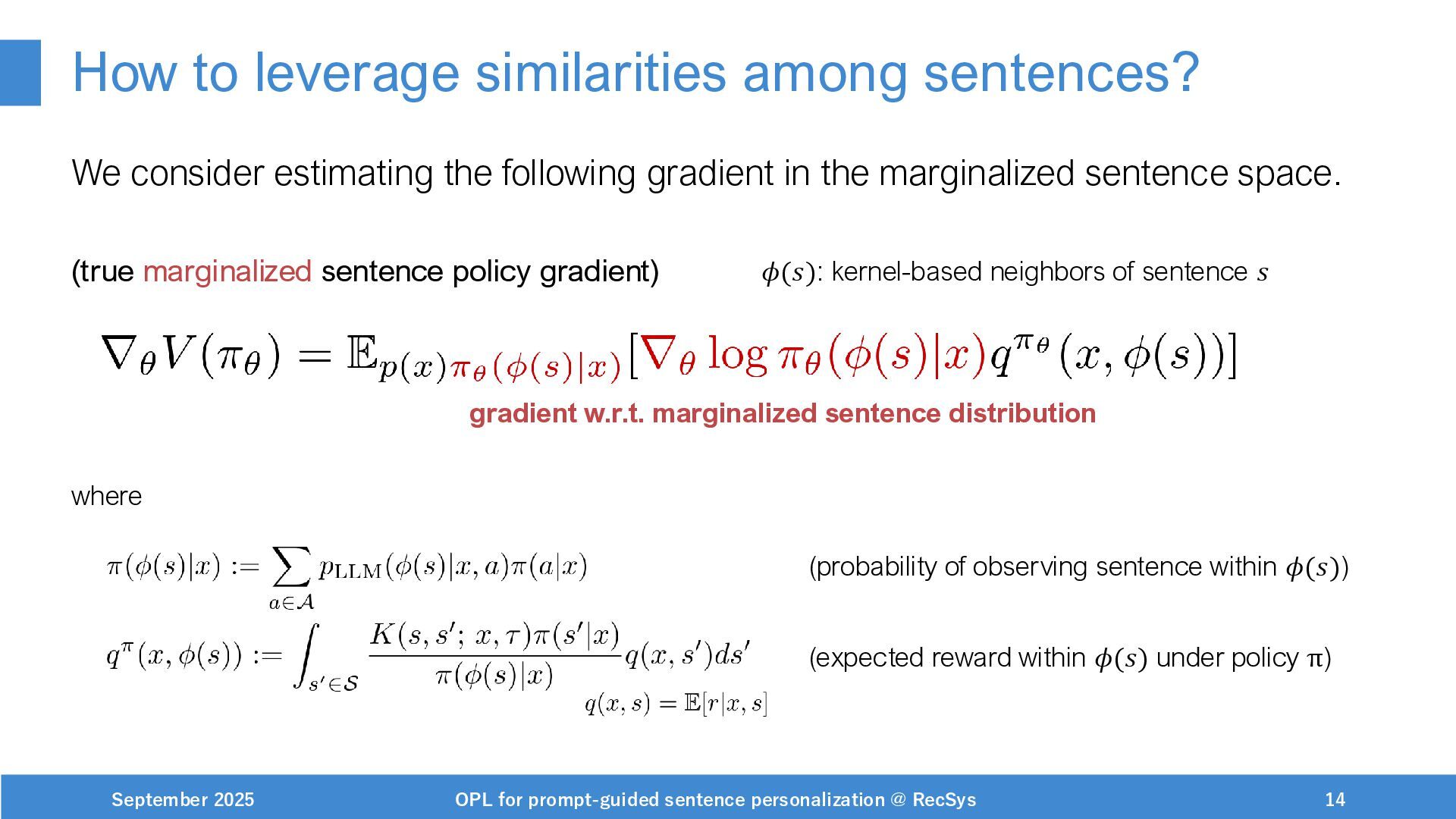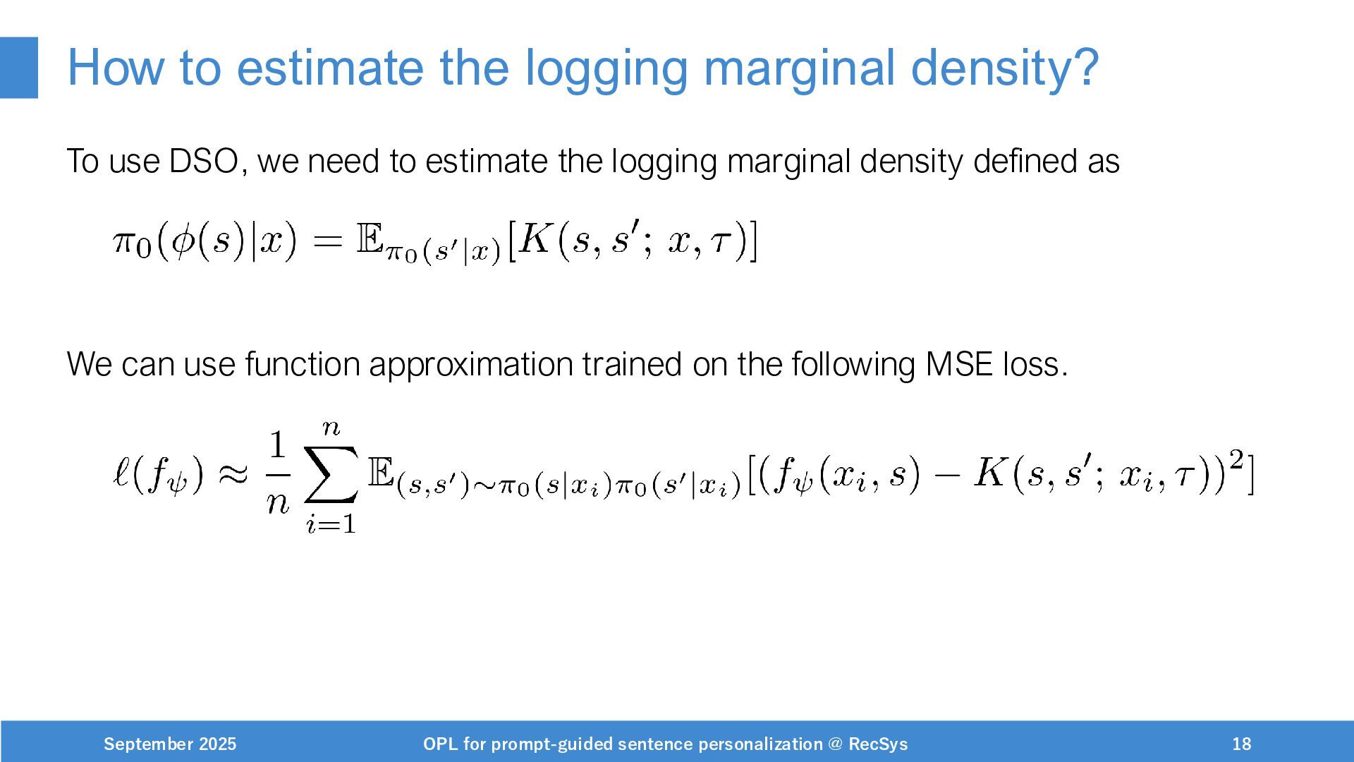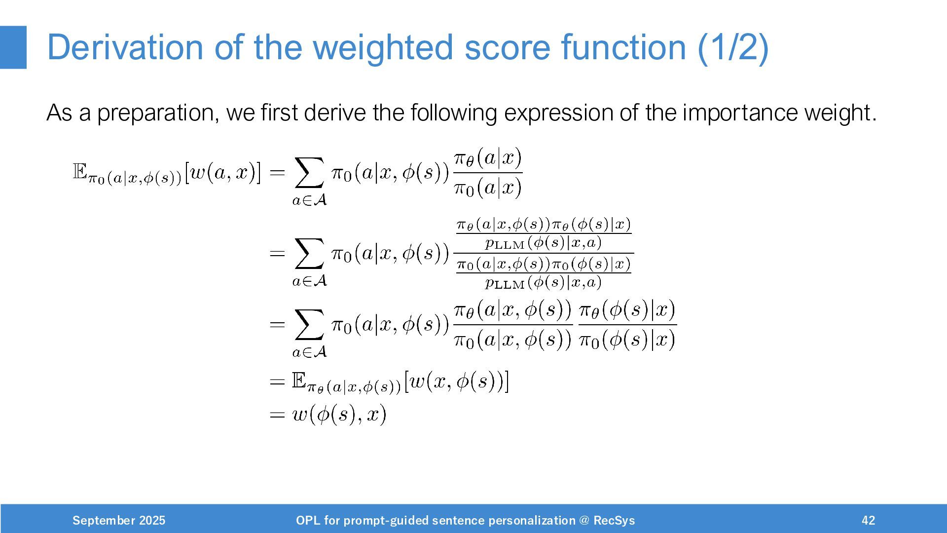 NeurIPS, 1999. [Swaminathan&Joachims,16] Adith Swaminathan and Thorsten Joachims. Batch learning from logged bandit feedback through counterfactual risk minimization. JMLR, 2016. [Dudík+,11] Miroslav Dudík, John Langford, and Lihong Li. Doubly robust policy evaluation and learning. ICML, 2011. [Saito+,24] Yuta Saito, Jihan Yao, and Thorsten Joachims. Potec: Off-policy learning for large action spaces via two-stage policy decomposition. 2024. [Brown+,20] Tom Brown, Benjamin Mann, Nick Ryder, Melanie Subbiah, Jared Kaplan, Prafulla Dhariwal, Arvind Neelakantan, Pranav Shyam, Girish Sastry, Amanda Askell, Sandhini Agarwal, Ariel Herbert-Voss, Gretchen Krueger, Tom Henighan, Rewon Child, Aditya Ramesh, Daniel M. Ziegler, Jeffrey Wu, Clemens Winter, Christopher Hesse, Mark Chen, Eric Sigler, Mateusz Litwin, Scott Gray, Benjamin Chess, Jack Clark, Christopher Berner, Sam McCandlish, Alec Radford, Ilya Sutskever, and Dario Amodei. Language models are few-shot learners. NeurIPS, 2020. September 2025 OPL for prompt-guided sentence personalization @ RecSys 49