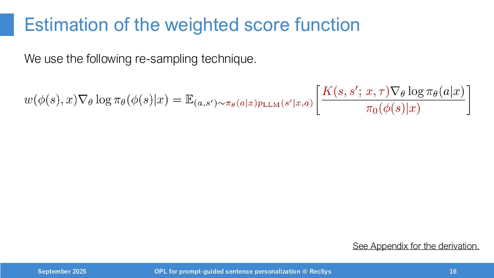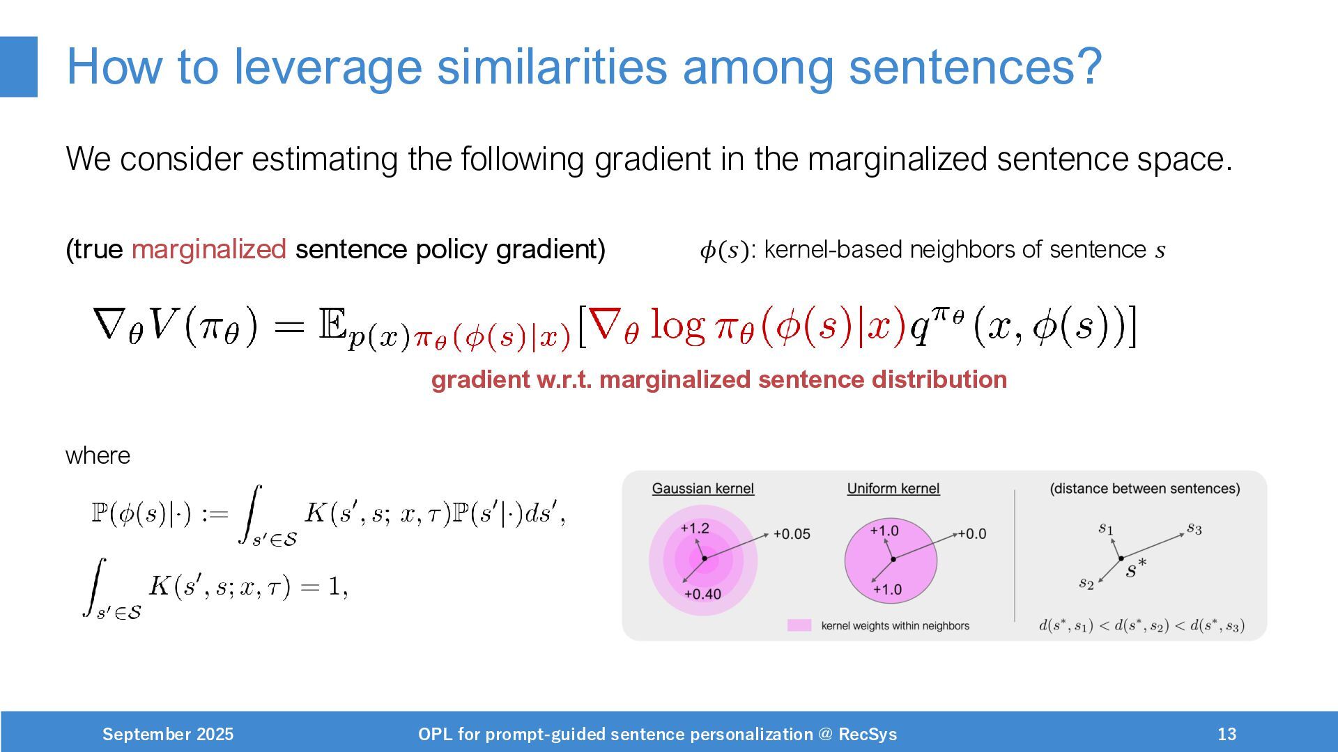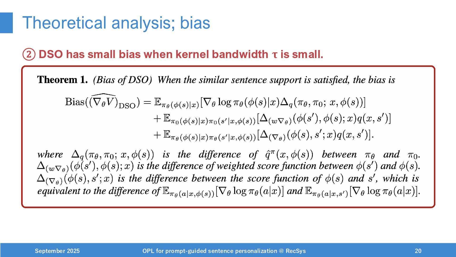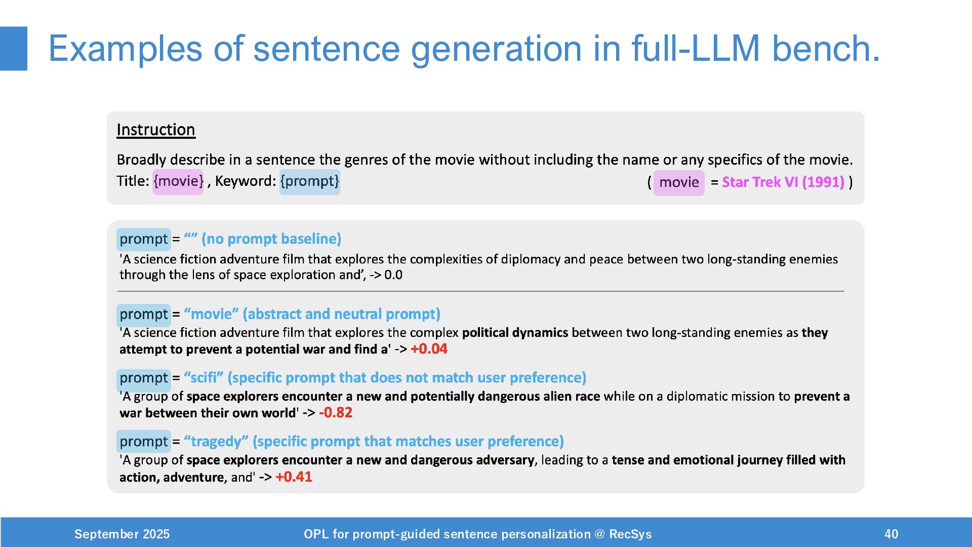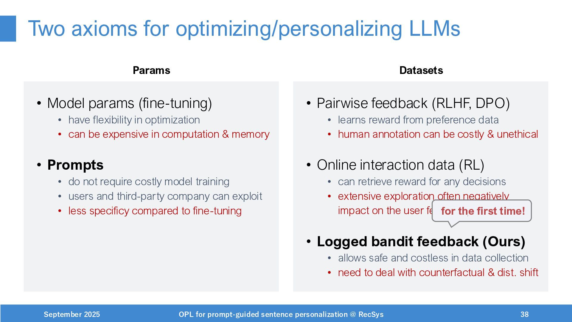 NeurIPS, 1999. [Swaminathan&Joachims,16] Adith Swaminathan and Thorsten Joachims. Batch learning from logged bandit feedback through counterfactual risk minimization. JMLR, 2016. [Dudík+,11] Miroslav Dudík, John Langford, and Lihong Li. Doubly robust policy evaluation and learning. ICML, 2011. [Saito+,24] Yuta Saito, Jihan Yao, and Thorsten Joachims. Potec: Off-policy learning for large action spaces via two-stage policy decomposition. 2024. [Brown+,20] Tom Brown, Benjamin Mann, Nick Ryder, Melanie Subbiah, Jared Kaplan, Prafulla Dhariwal, Arvind Neelakantan, Pranav Shyam, Girish Sastry, Amanda Askell, Sandhini Agarwal, Ariel Herbert-Voss, Gretchen Krueger, Tom Henighan, Rewon Child, Aditya Ramesh, Daniel M. Ziegler, Jeffrey Wu, Clemens Winter, Christopher Hesse, Mark Chen, Eric Sigler, Mateusz Litwin, Scott Gray, Benjamin Chess, Jack Clark, Christopher Berner, Sam McCandlish, Alec Radford, Ilya Sutskever, and Dario Amodei. Language models are few-shot learners. NeurIPS, 2020. September 2025 OPL for prompt-guided sentence personalization @ RecSys 49