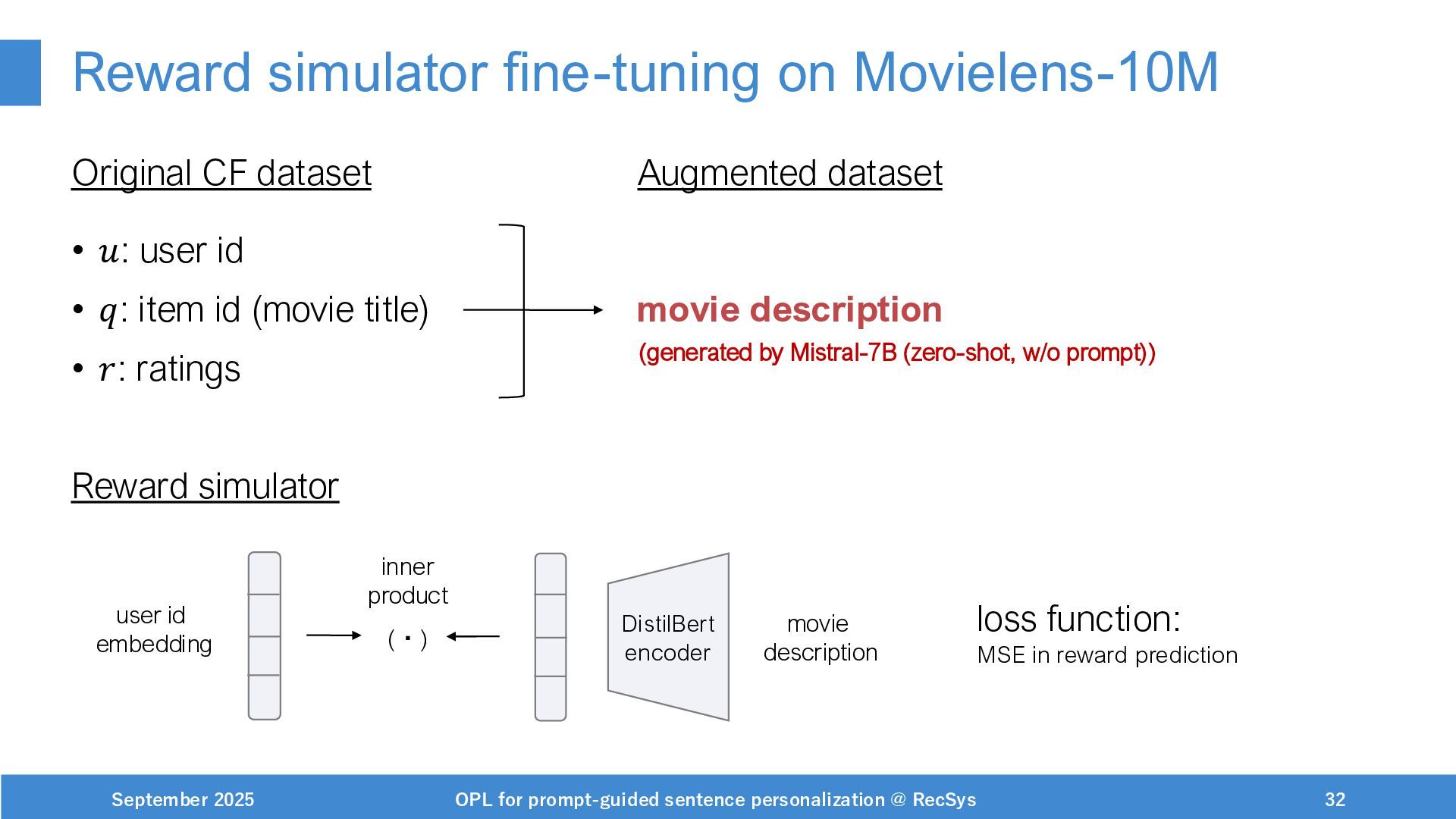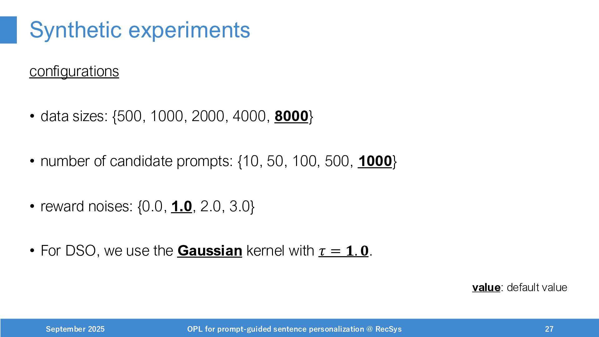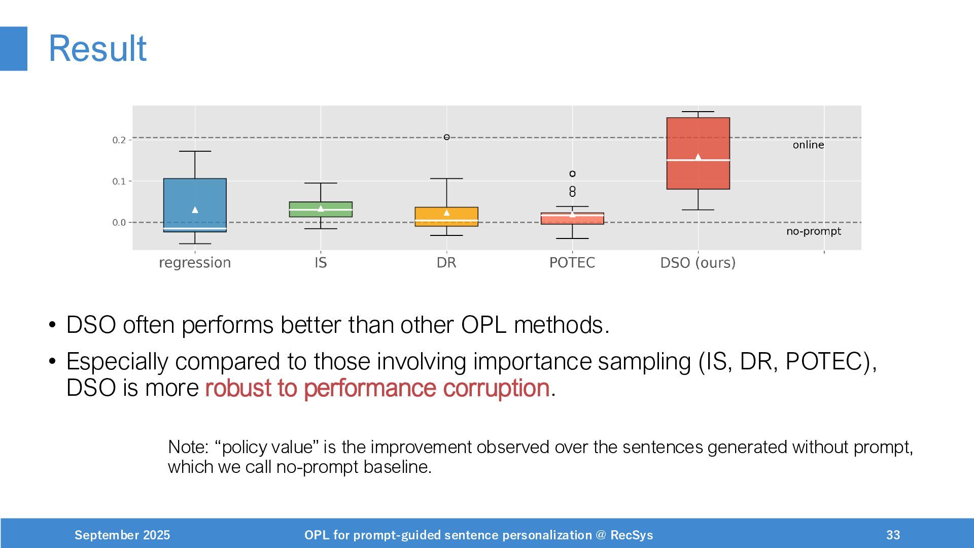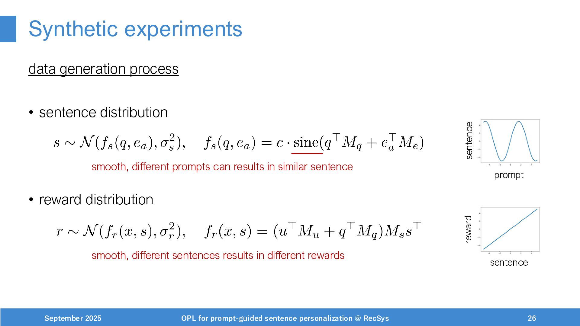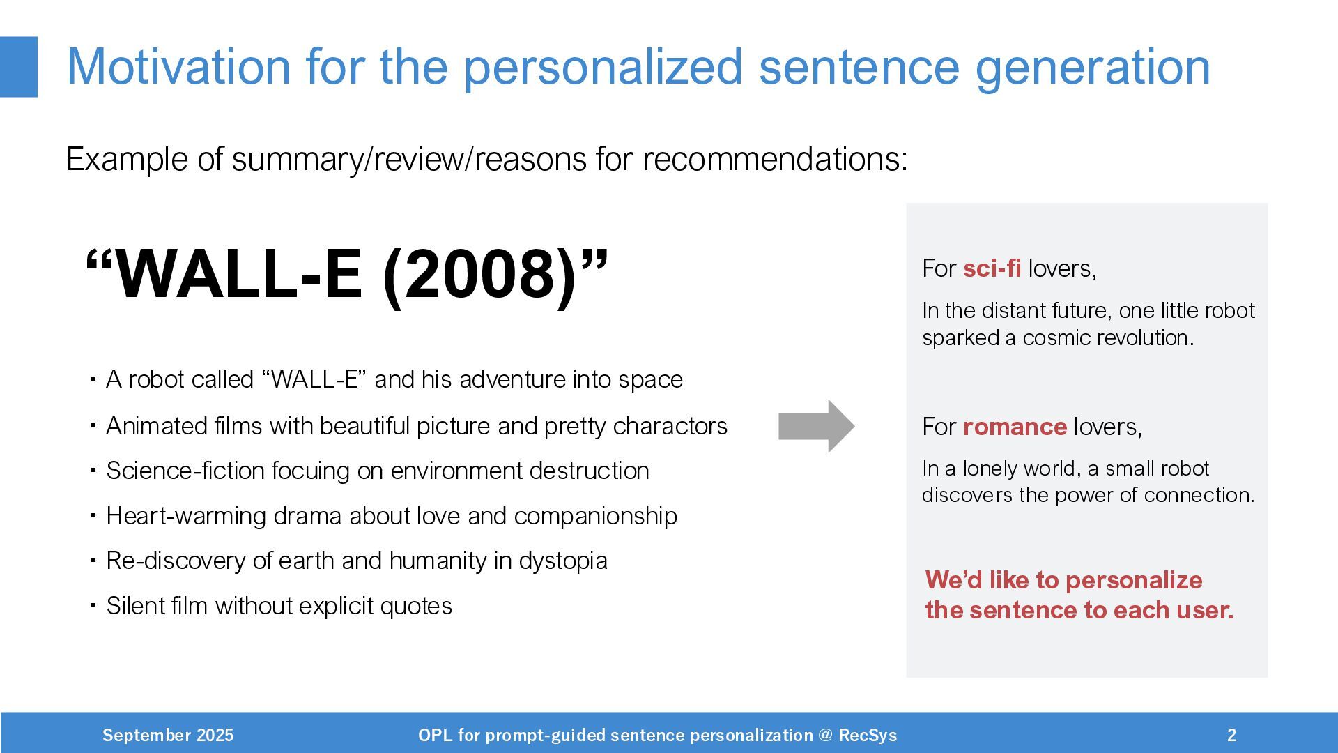 NeurIPS, 1999. [Swaminathan&Joachims,16] Adith Swaminathan and Thorsten Joachims. Batch learning from logged bandit feedback through counterfactual risk minimization. JMLR, 2016. [Dudík+,11] Miroslav Dudík, John Langford, and Lihong Li. Doubly robust policy evaluation and learning. ICML, 2011. [Saito+,24] Yuta Saito, Jihan Yao, and Thorsten Joachims. Potec: Off-policy learning for large action spaces via two-stage policy decomposition. 2024. [Brown+,20] Tom Brown, Benjamin Mann, Nick Ryder, Melanie Subbiah, Jared Kaplan, Prafulla Dhariwal, Arvind Neelakantan, Pranav Shyam, Girish Sastry, Amanda Askell, Sandhini Agarwal, Ariel Herbert-Voss, Gretchen Krueger, Tom Henighan, Rewon Child, Aditya Ramesh, Daniel M. Ziegler, Jeffrey Wu, Clemens Winter, Christopher Hesse, Mark Chen, Eric Sigler, Mateusz Litwin, Scott Gray, Benjamin Chess, Jack Clark, Christopher Berner, Sam McCandlish, Alec Radford, Ilya Sutskever, and Dario Amodei. Language models are few-shot learners. NeurIPS, 2020. September 2025 OPL for prompt-guided sentence personalization @ RecSys 49